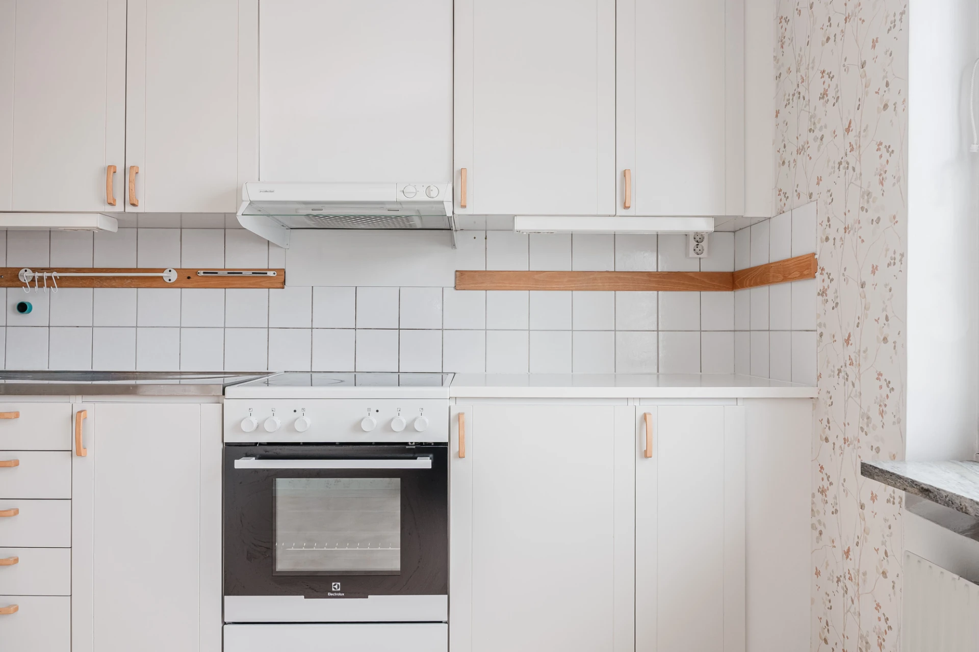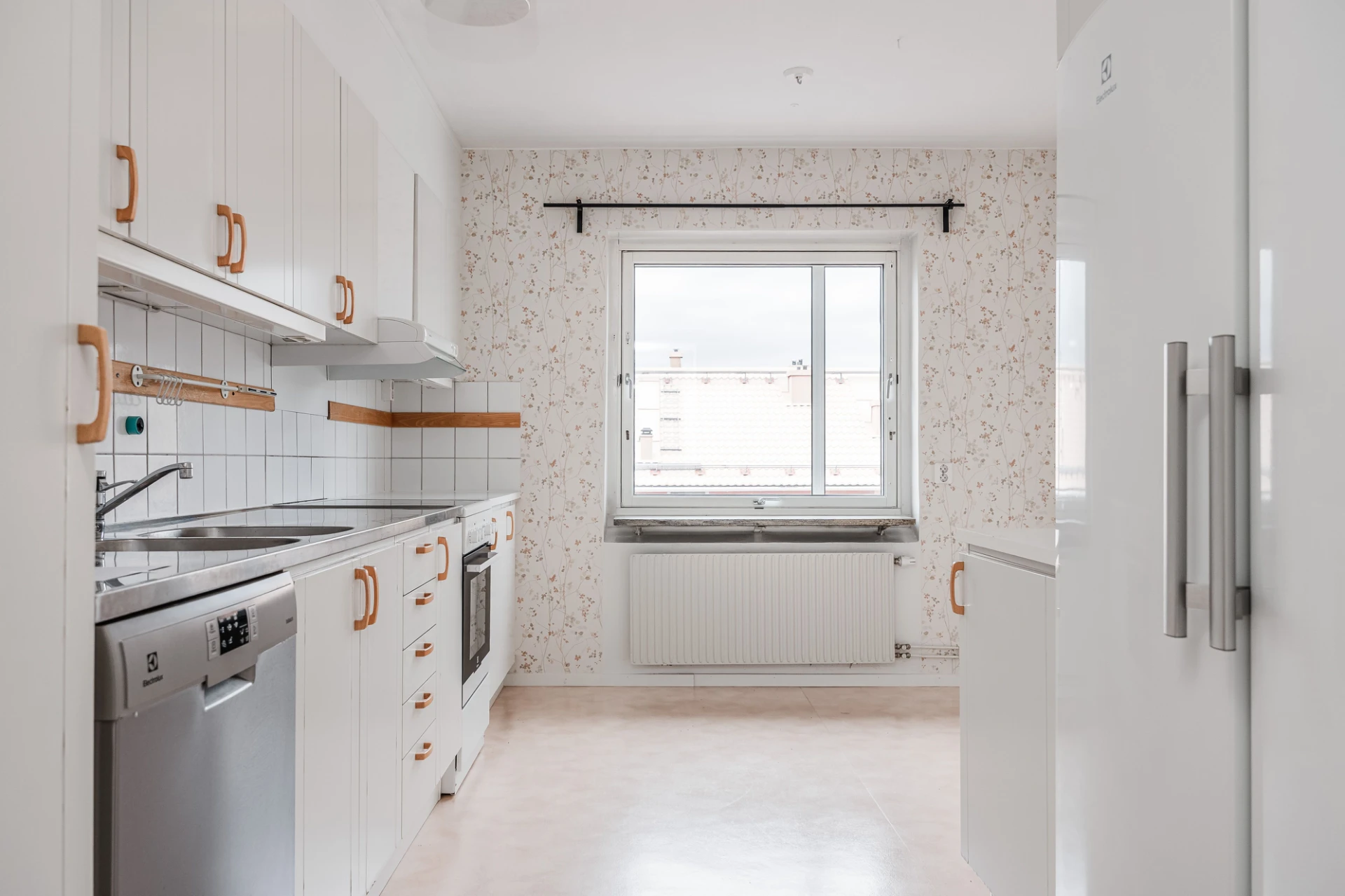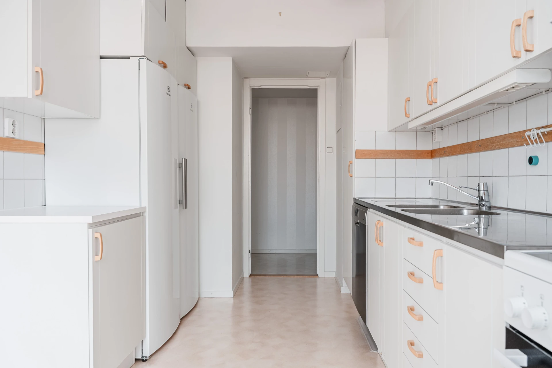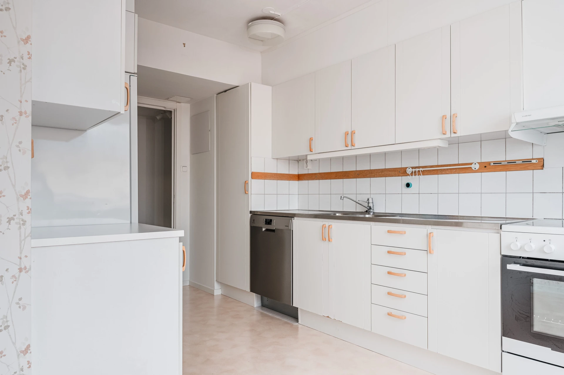Plastmatta och vita väggar. Vita köksluckor och vitt kakel. Den maskinella utrustningen består av köksfläkt, spis med ugn, diskmaskin samt kyl och frys. Här finns plats för matgrupp.
