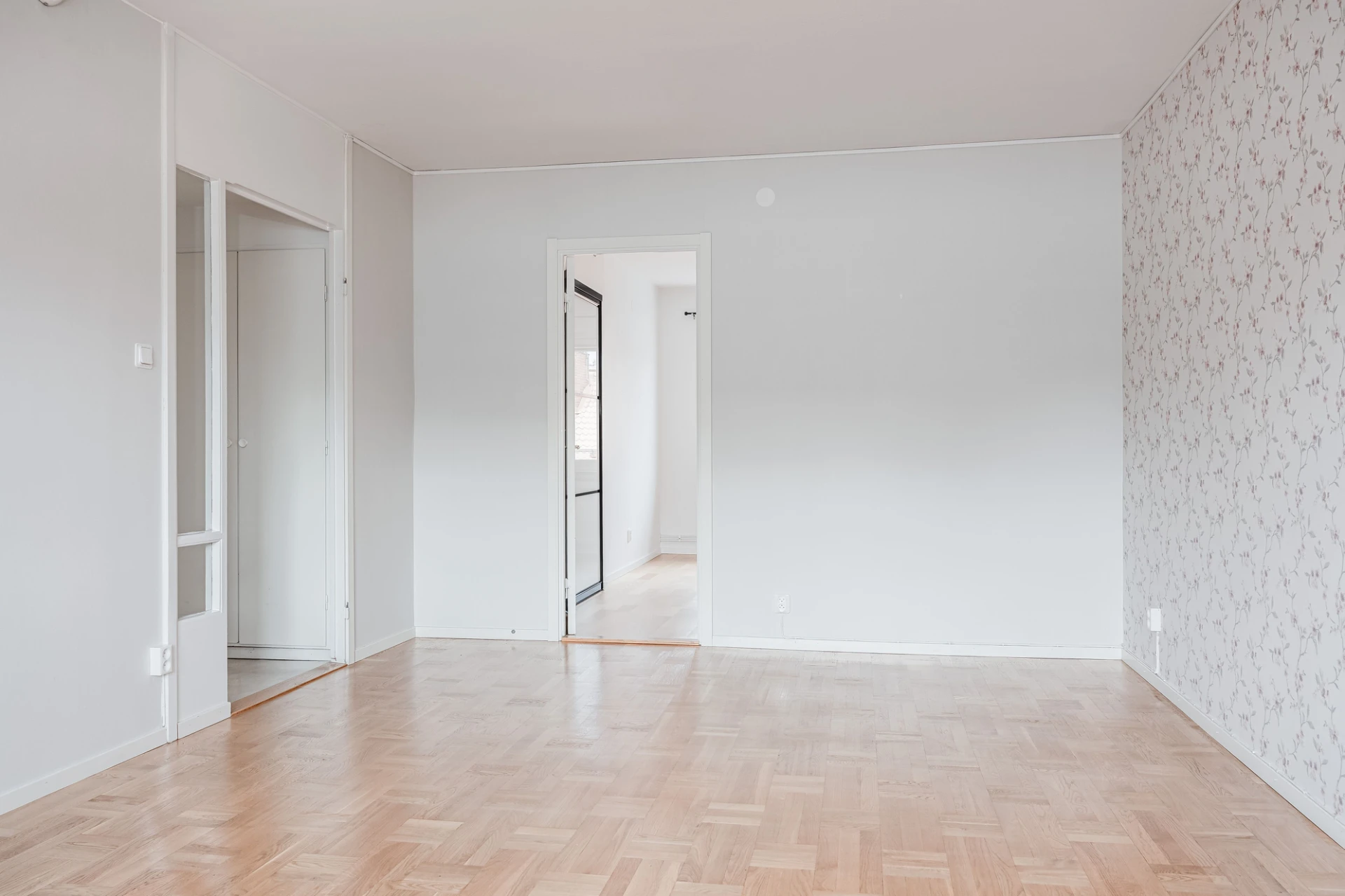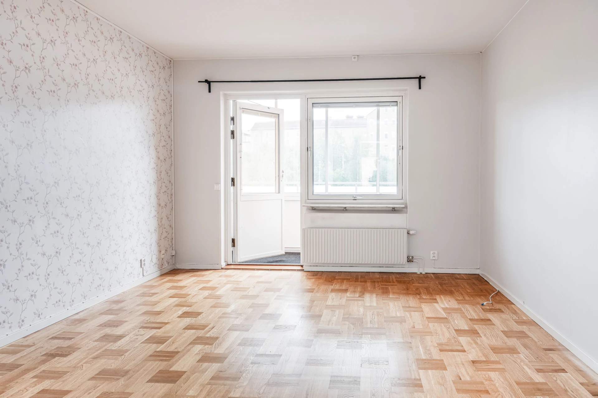 Parkettgolv och ljusa väggar samt mönstrad fondvägg. Här finns plats för soffa med tillhörande möblemang. Utgång till inglasad balkong.