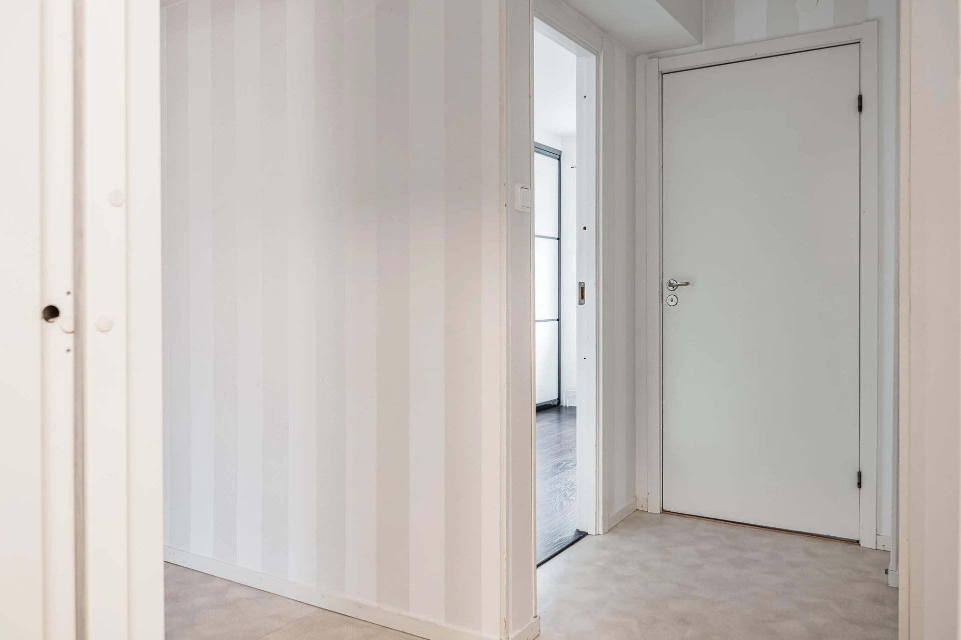 Plastmatta på golv och ljus randig tapet på väggar.