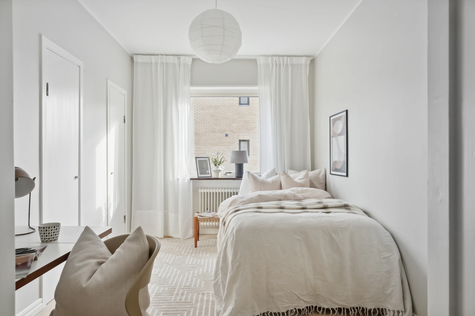 Ljus enstavsparkett och ljusa väggar. Plats för enkelsäng och kontorsmöbel. Förvaring i två inbyggda garderober.