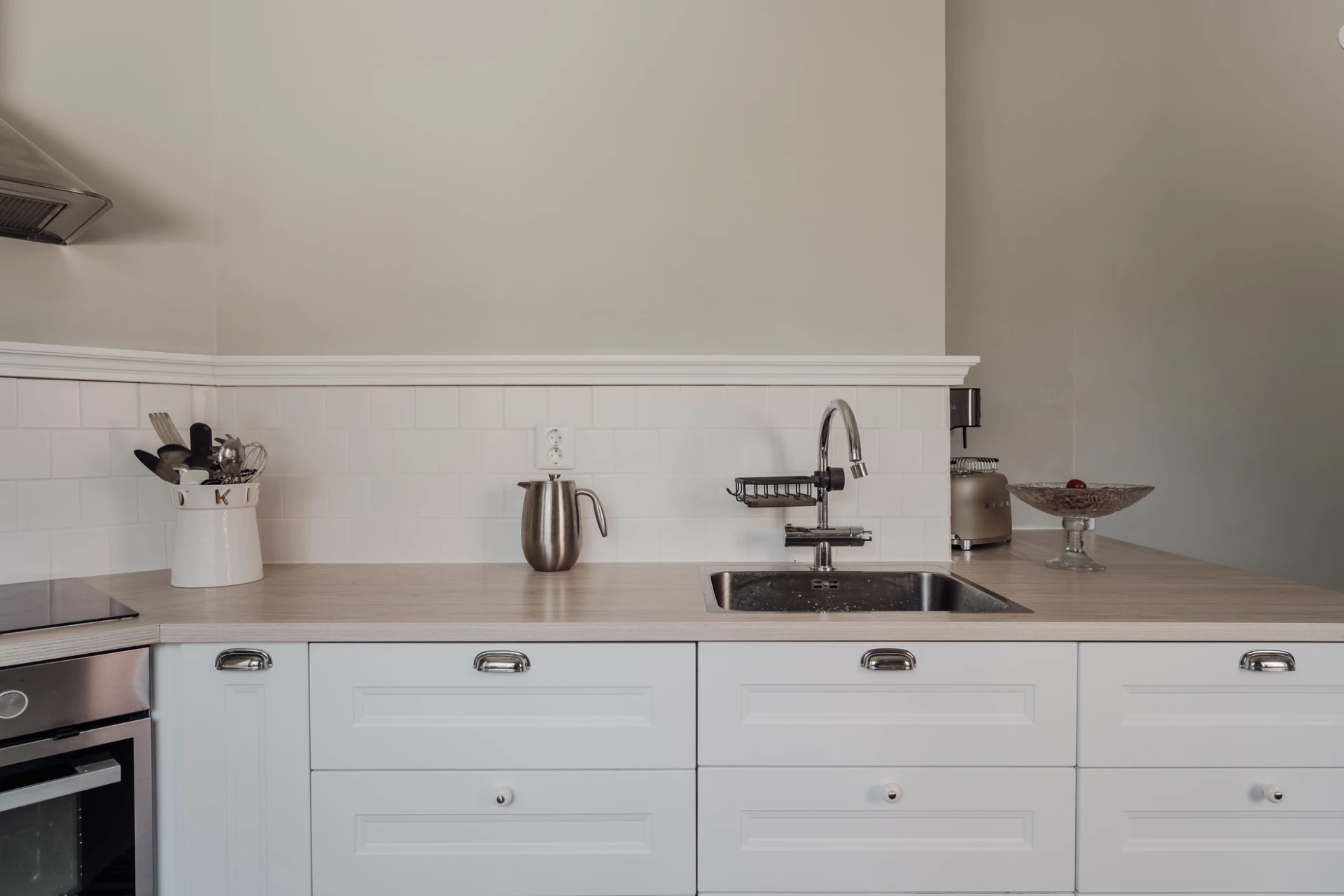 Ljust laminatgolv och ljusa väggar. Köksinredning i vitt med bänkskiva i trälaminat. Ovan arbetsytor är väggen klädd i ljust kakel. Köket är utrustat med induktionshäll, fläkt, inbyggd ugn, integrerad kyl/frys och integrerad diskmaskin.