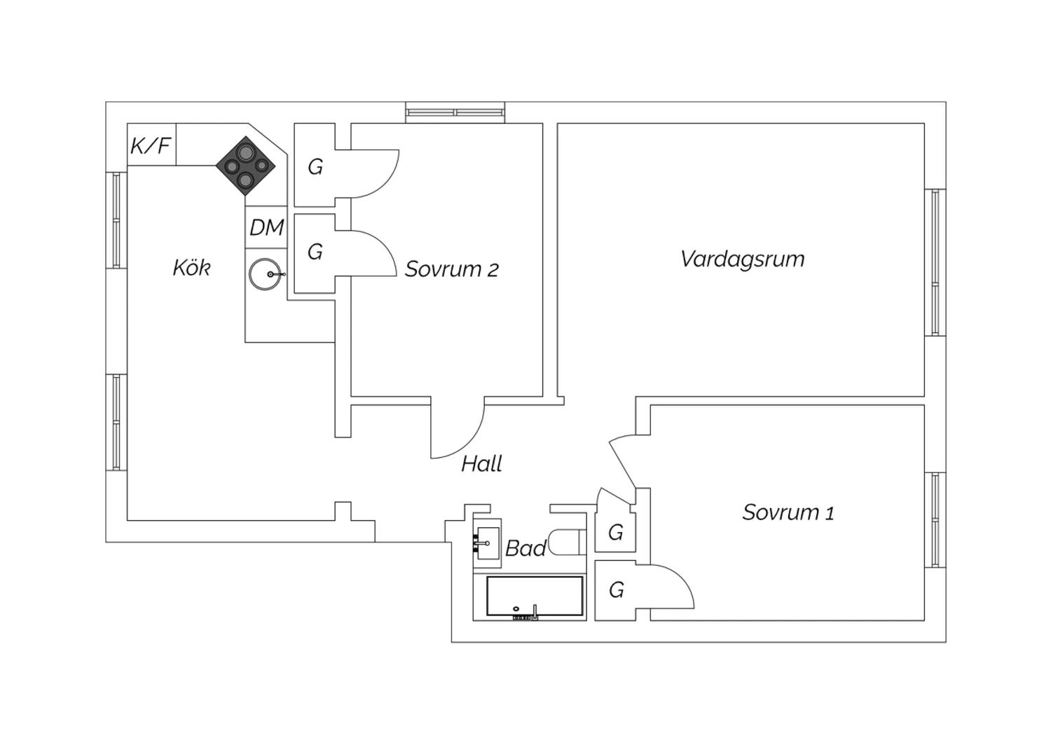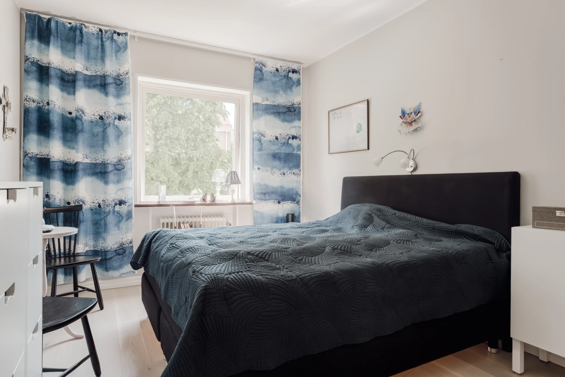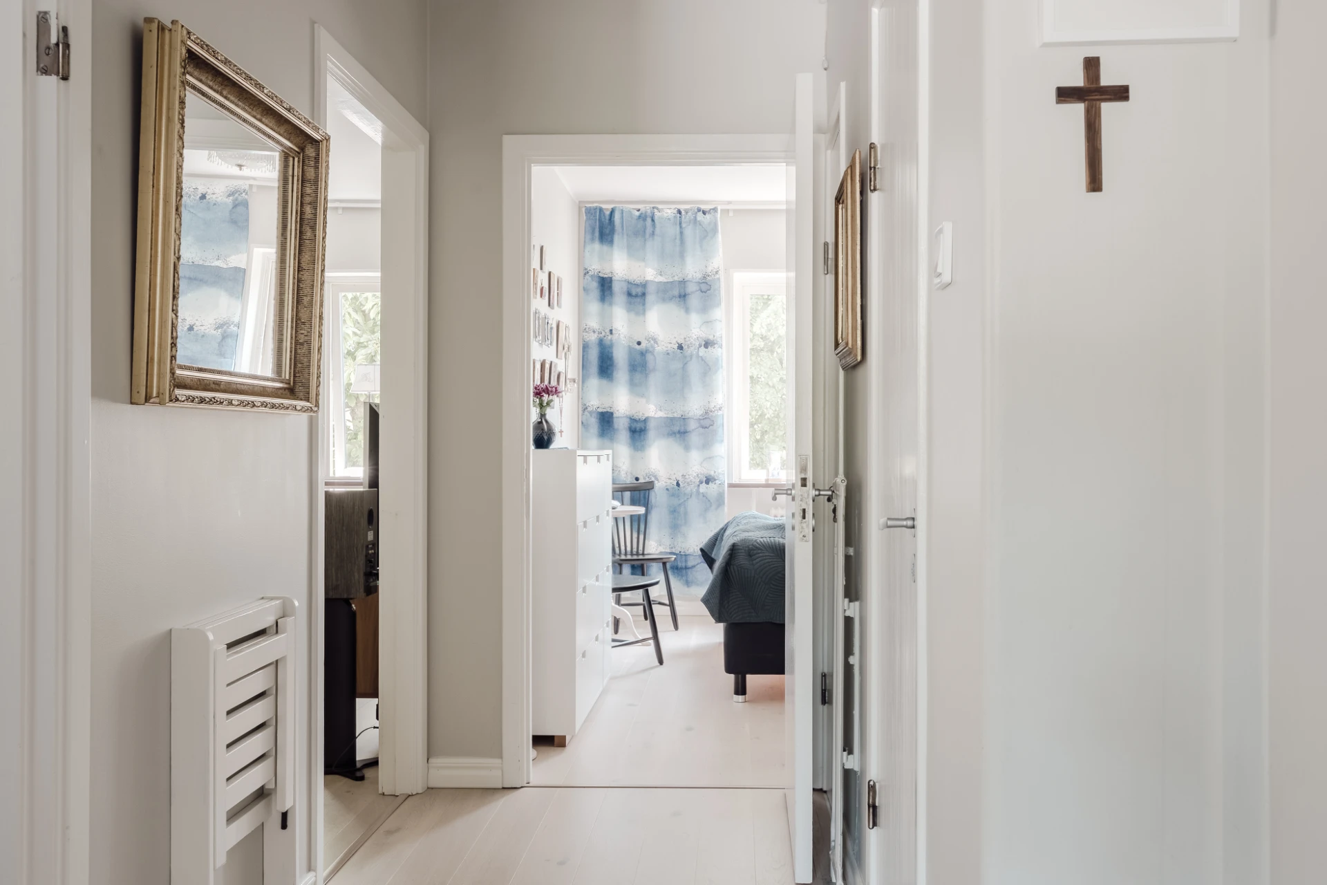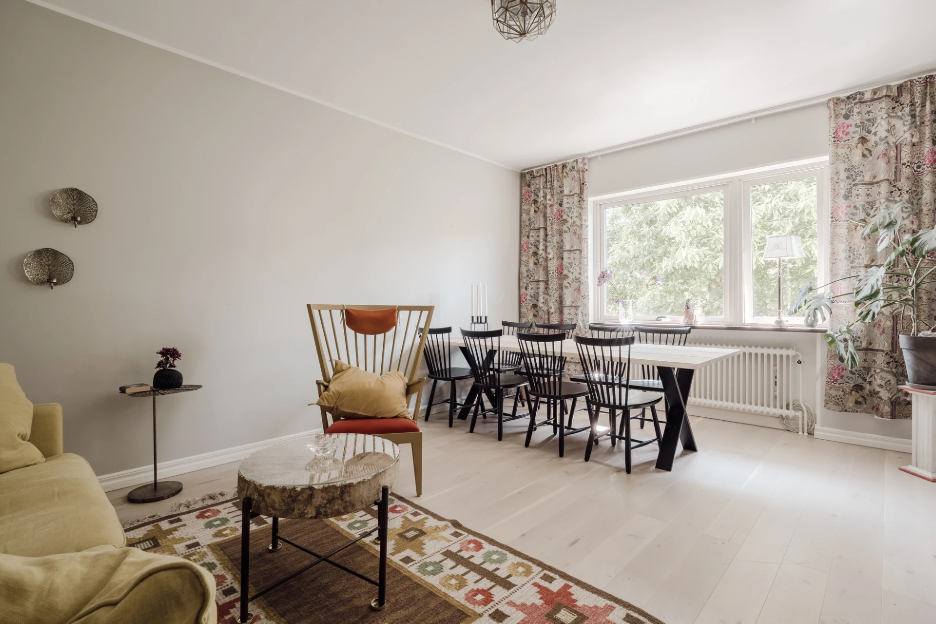En ljuvlig funkistrea med gavelläge. Dessutom en riktig 1940-talsskatt med inslag såsom välvda vägghörn, hög takhöjd om ca 2,70, stora fönster med fina fönsterbräden och inbyggd förvaring. Köket är helt nyrenoverat och från kök och matplats har man vy ut över parken och bort mot Påskbergsskogen. I badrummet finns det badkar och i båda sovrummen finns inbyggda garderober med originalbeslag.
