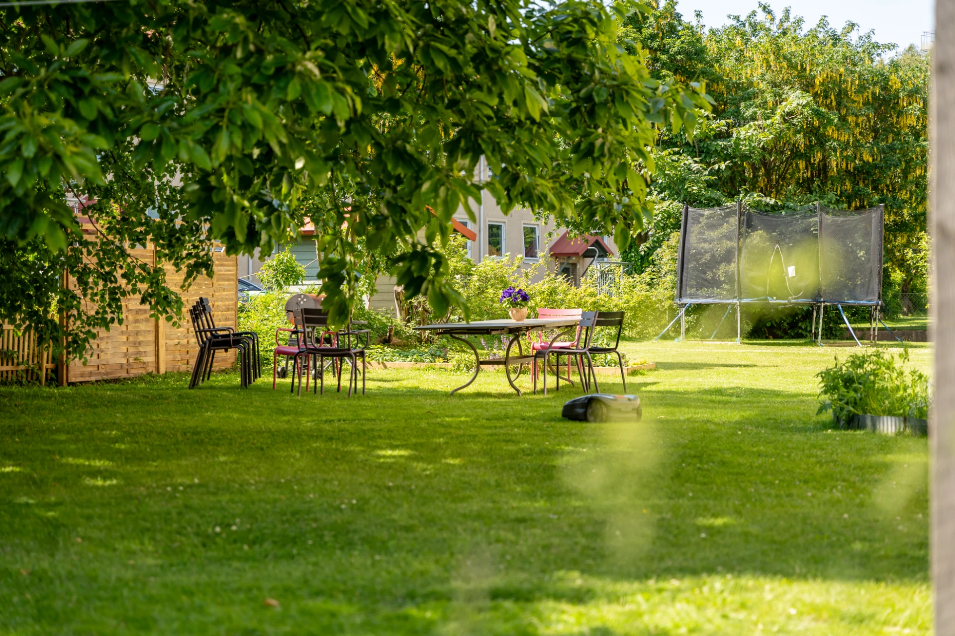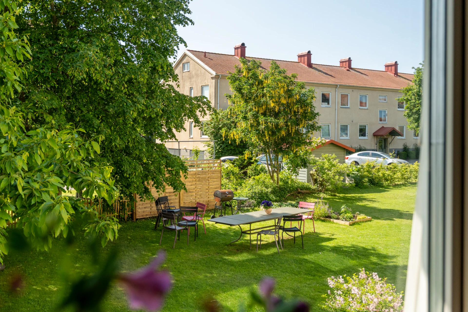 Föreningen förfogar över gräsytor framför huset samt en trädgård bakom huset som är till för alla lägenhetsinnehavare. I trädgården finns studsmatta, grill, bord och stolar.