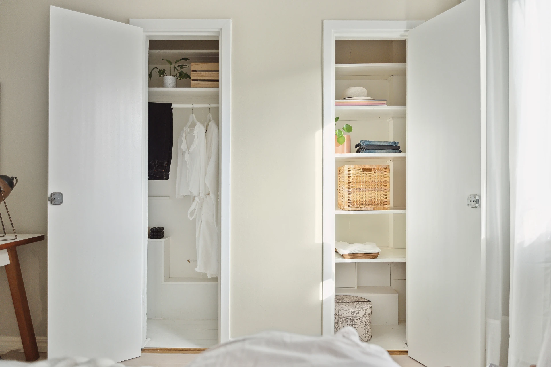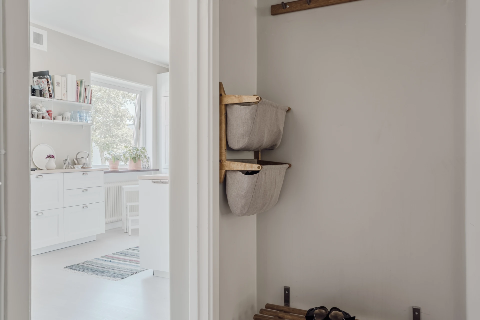 Ljus enstavsparkett och ljusa väggar. Plats för klädhängare. Förvaring i inbyggd garderob.