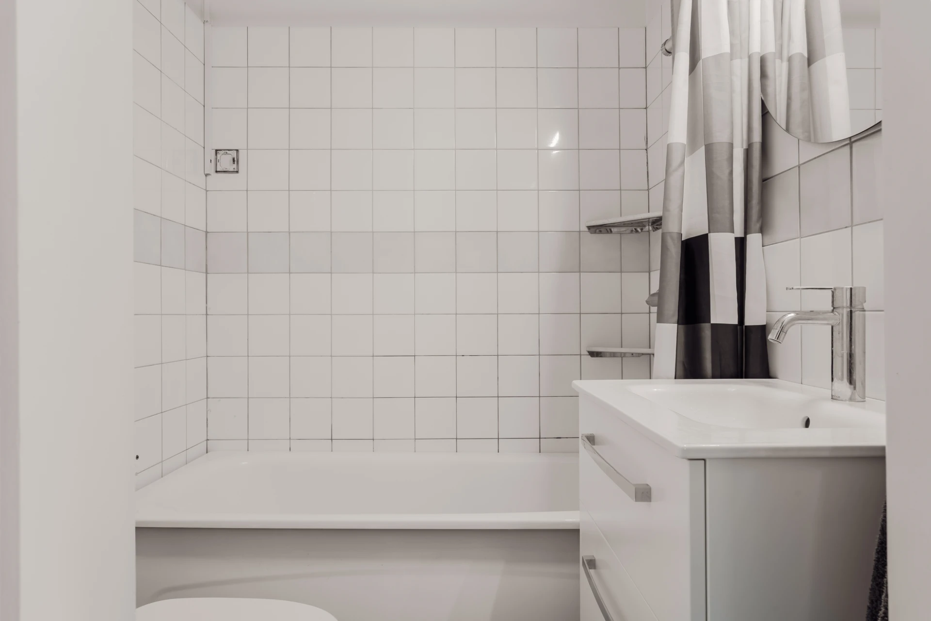 Ljusblå våtrumsmatta och väggar klädda i vitt kakel med bård. Här finns handfat med kommod (2024), spegel med belysning, badkar och toalett.
