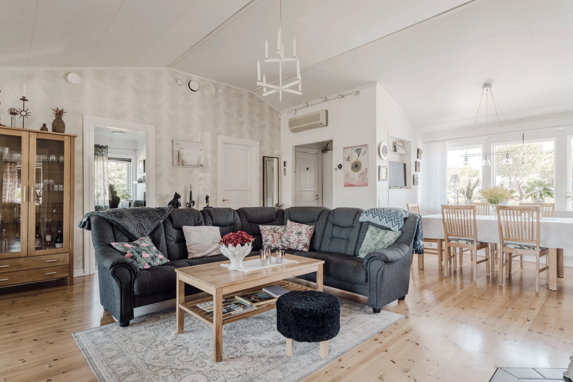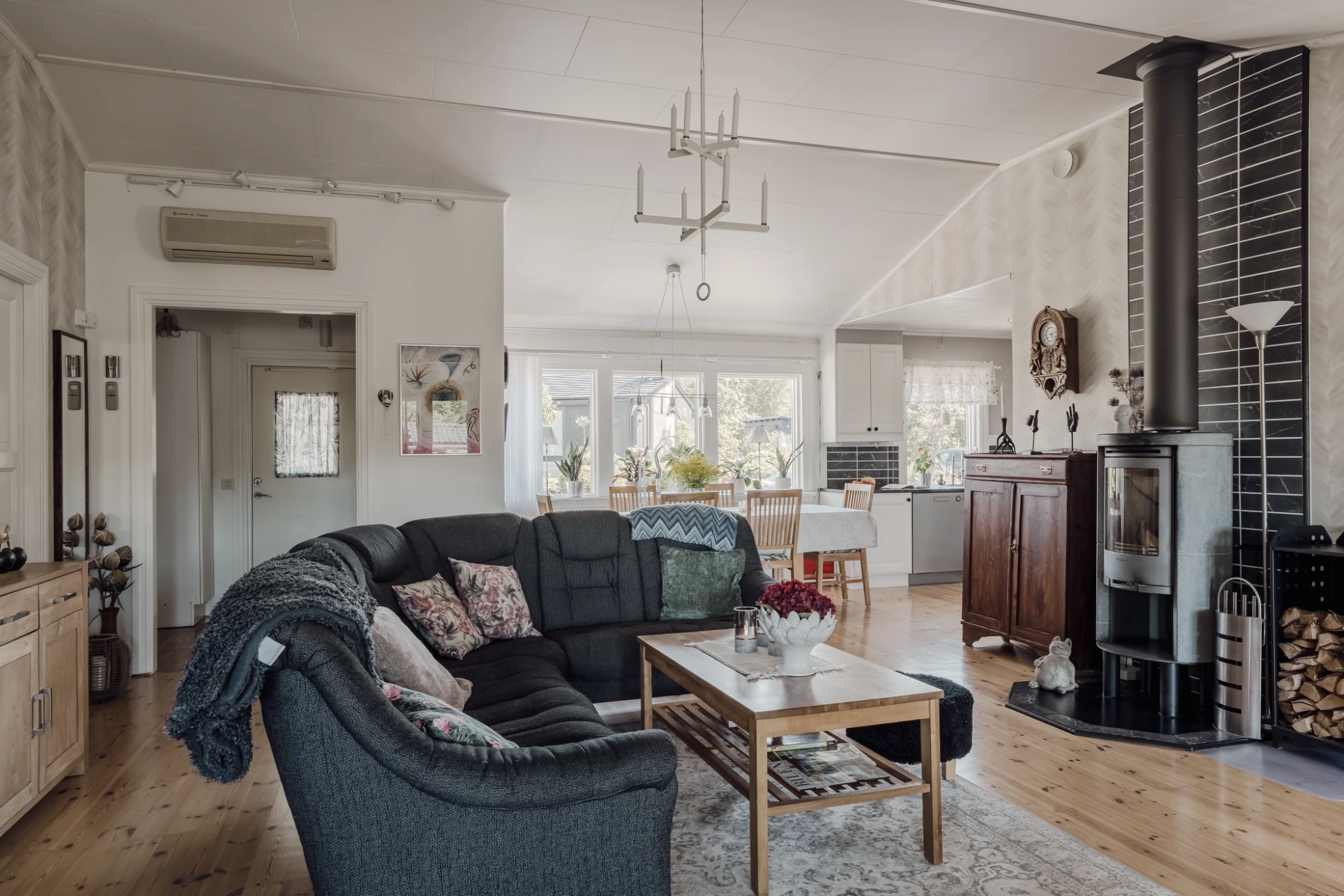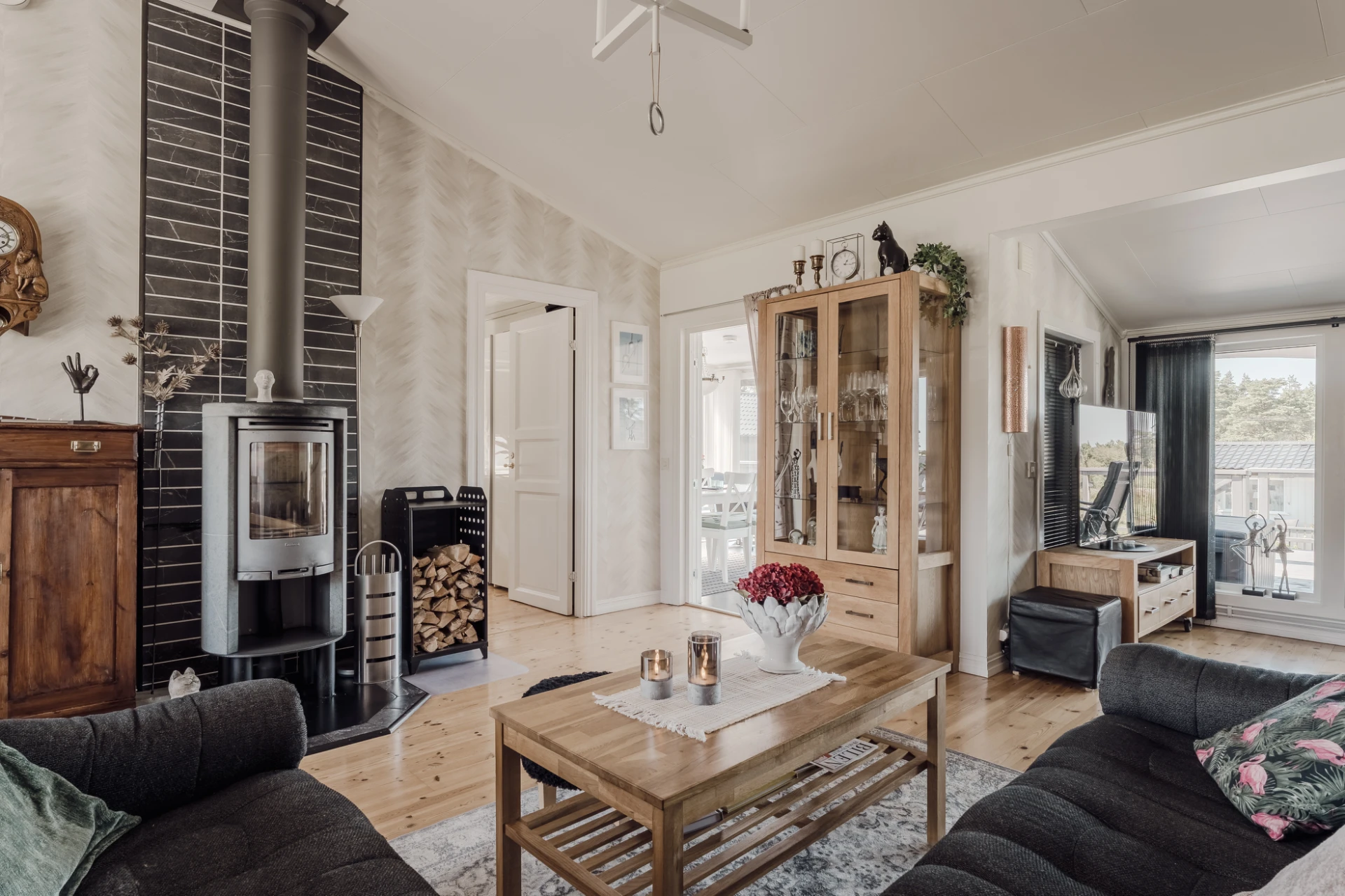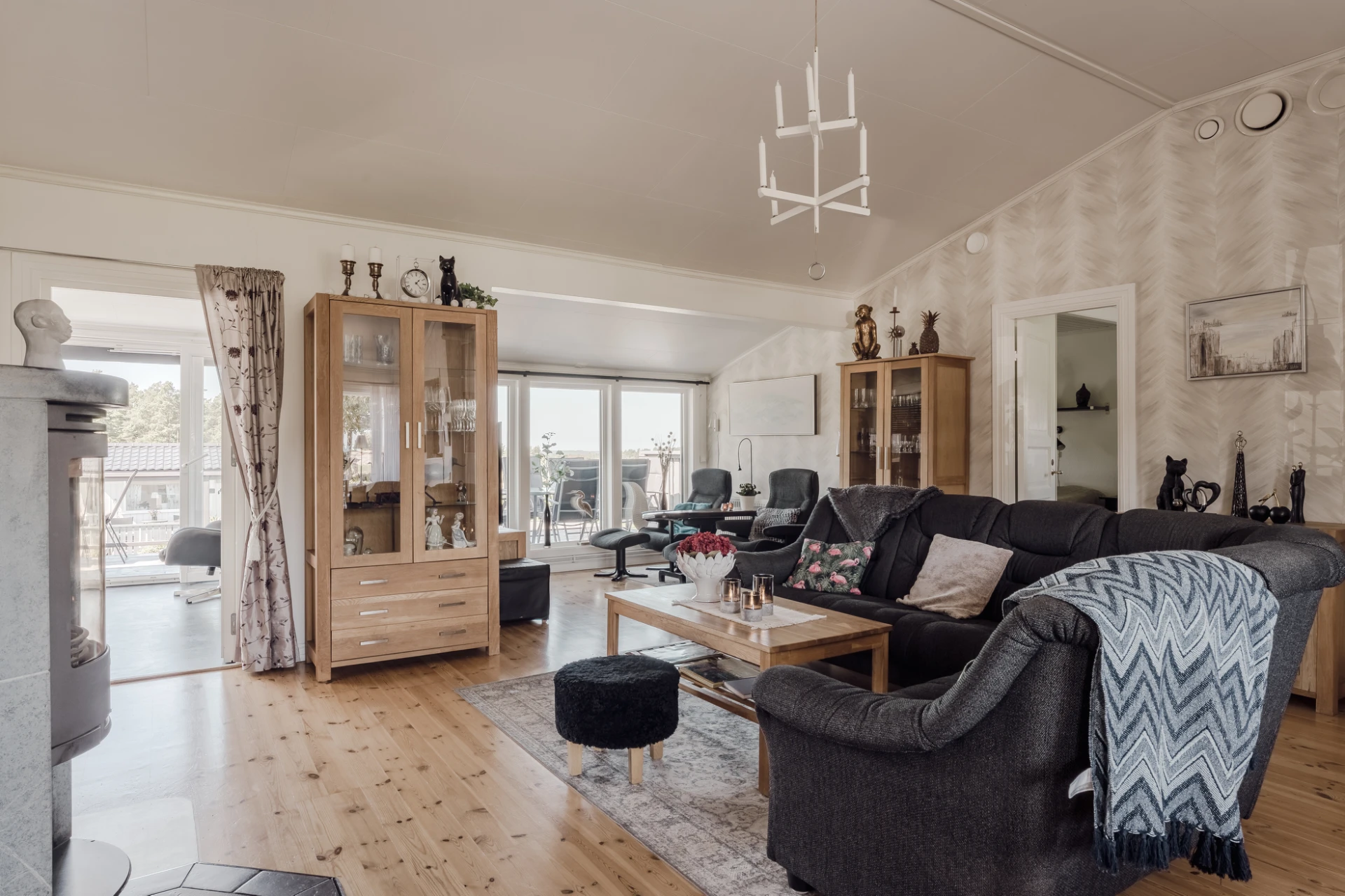 Klickgolv i furu och tapetserade väggar i ljus nyans. Här finns braskamin, plats för soffgrupp och förvaringsmöbel samt plats för en separat sittgrupp med förvarings-/tv-bänk alternativt en arbetshörna. Vardagsrummet ligger i öppen planlösning med matplats och kök. Härifrån når du även bostadens inglasade uterum.