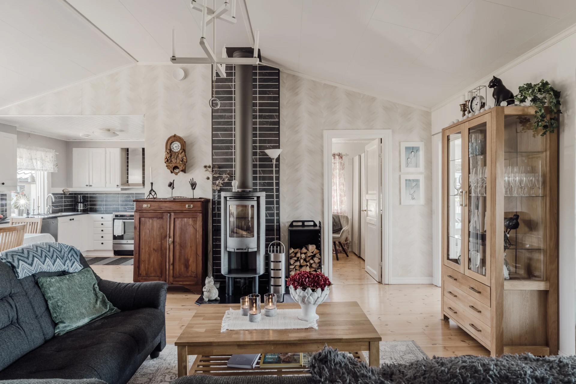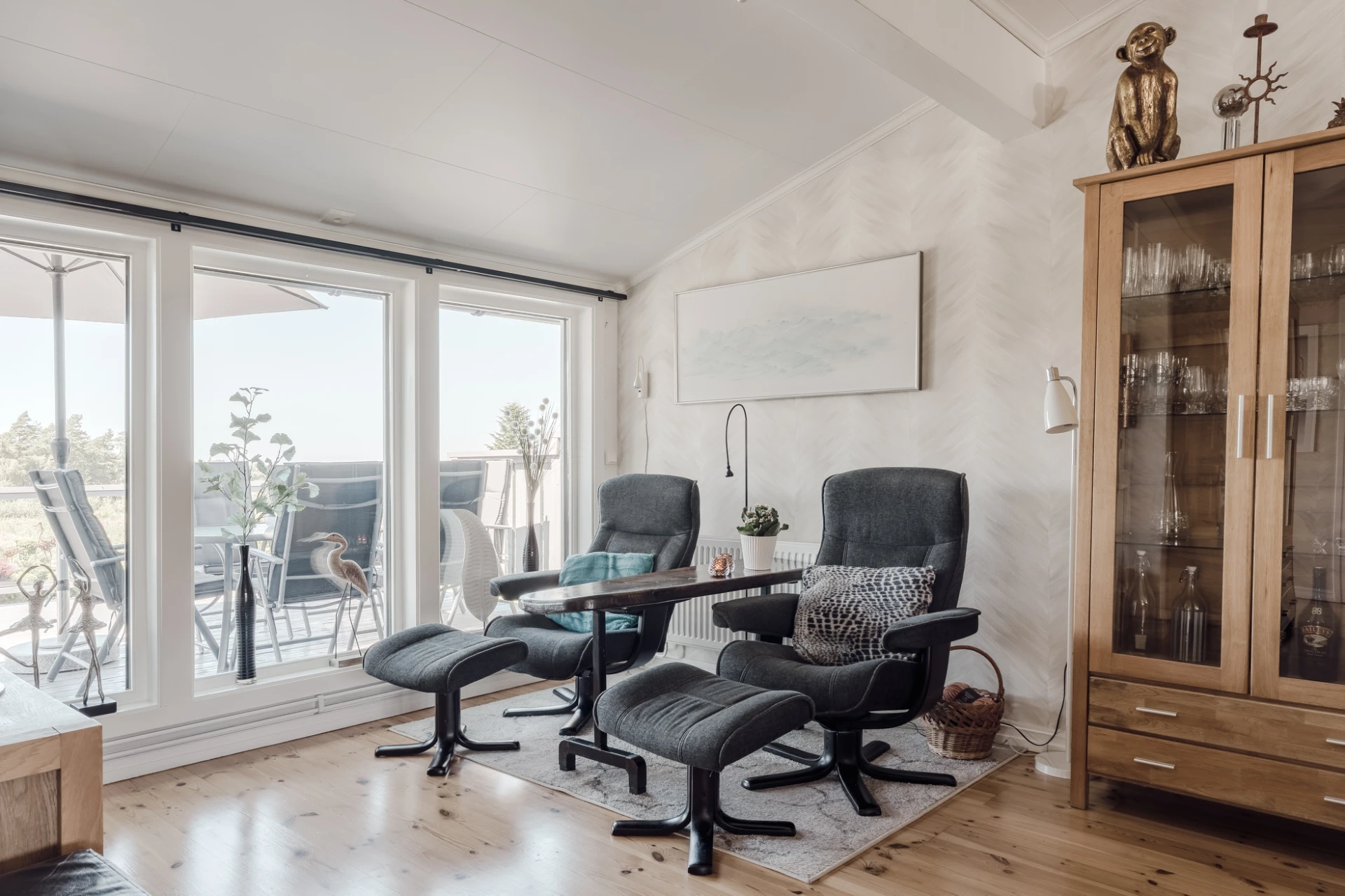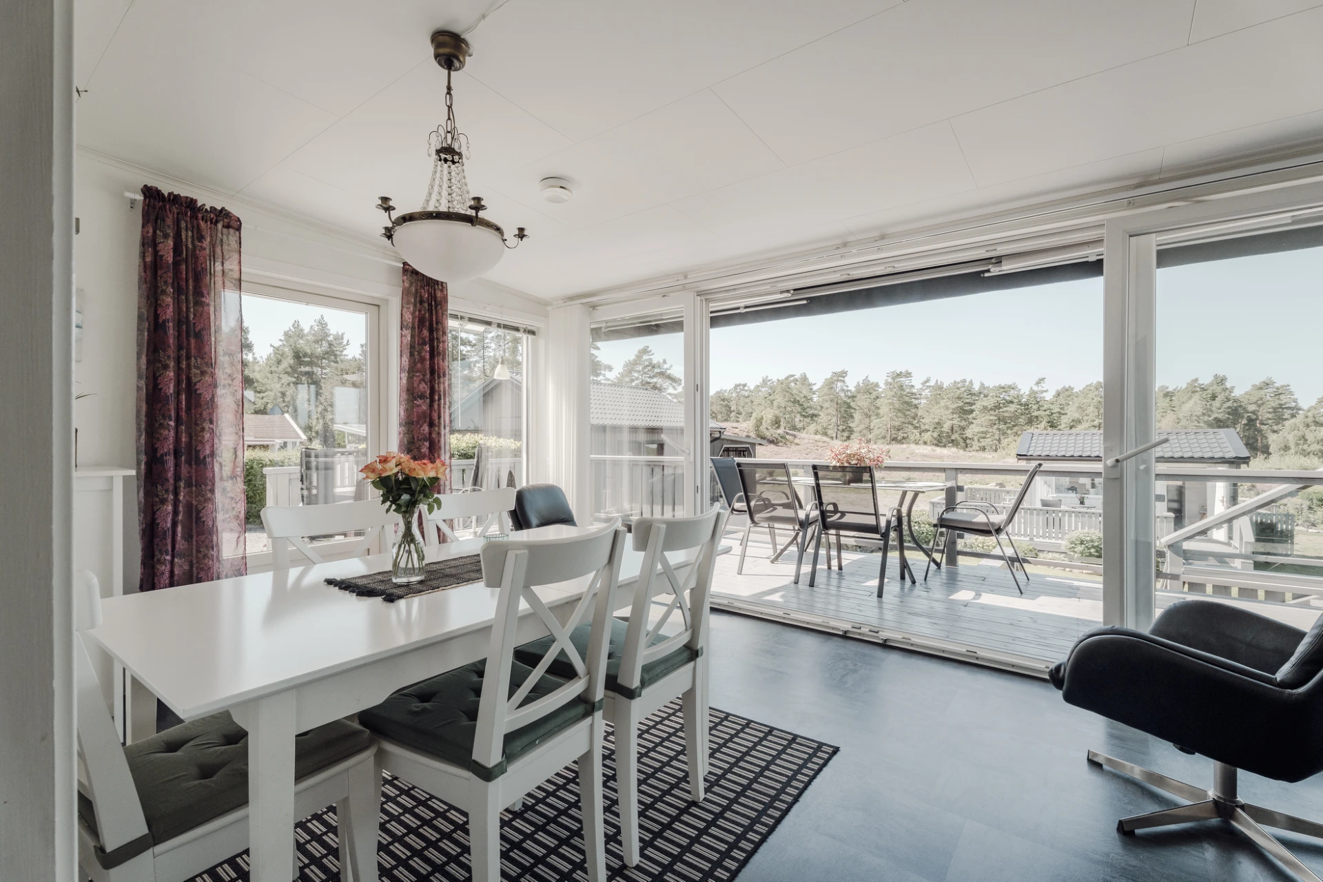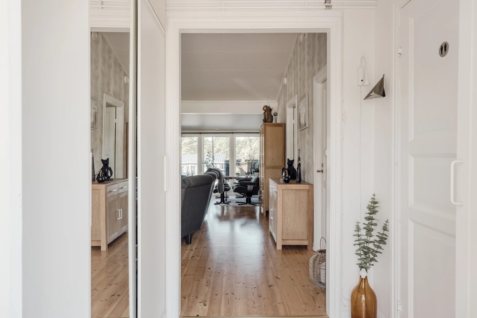 Klickgolv i furu och tapetserade väggar i ljus nyans. Här finns braskamin, plats för soffgrupp och förvaringsmöbel samt plats för en separat sittgrupp med förvarings-/tv-bänk alternativt en arbetshörna. Vardagsrummet ligger i öppen planlösning med matplats och kök. Härifrån når du även bostadens inglasade uterum.