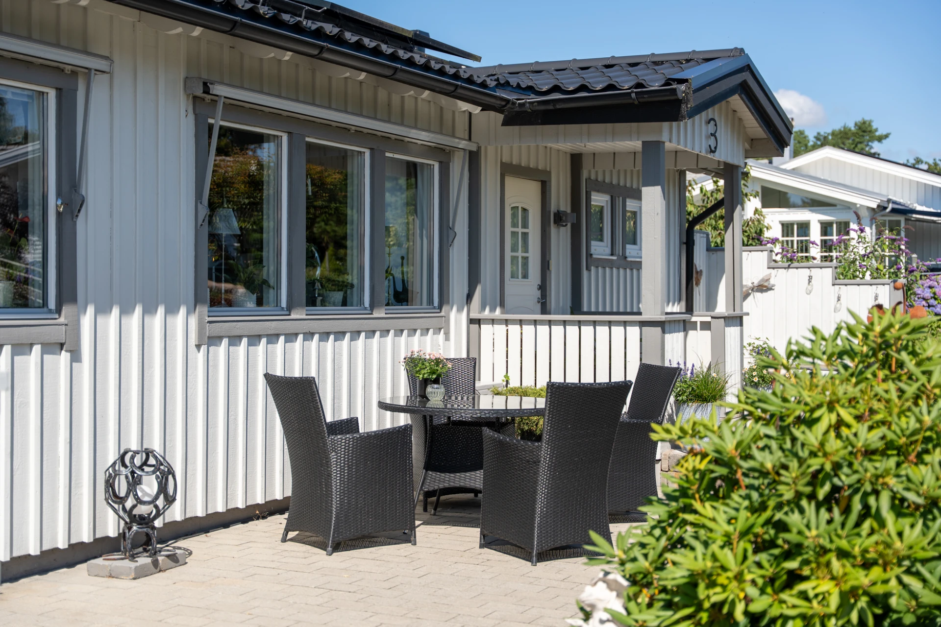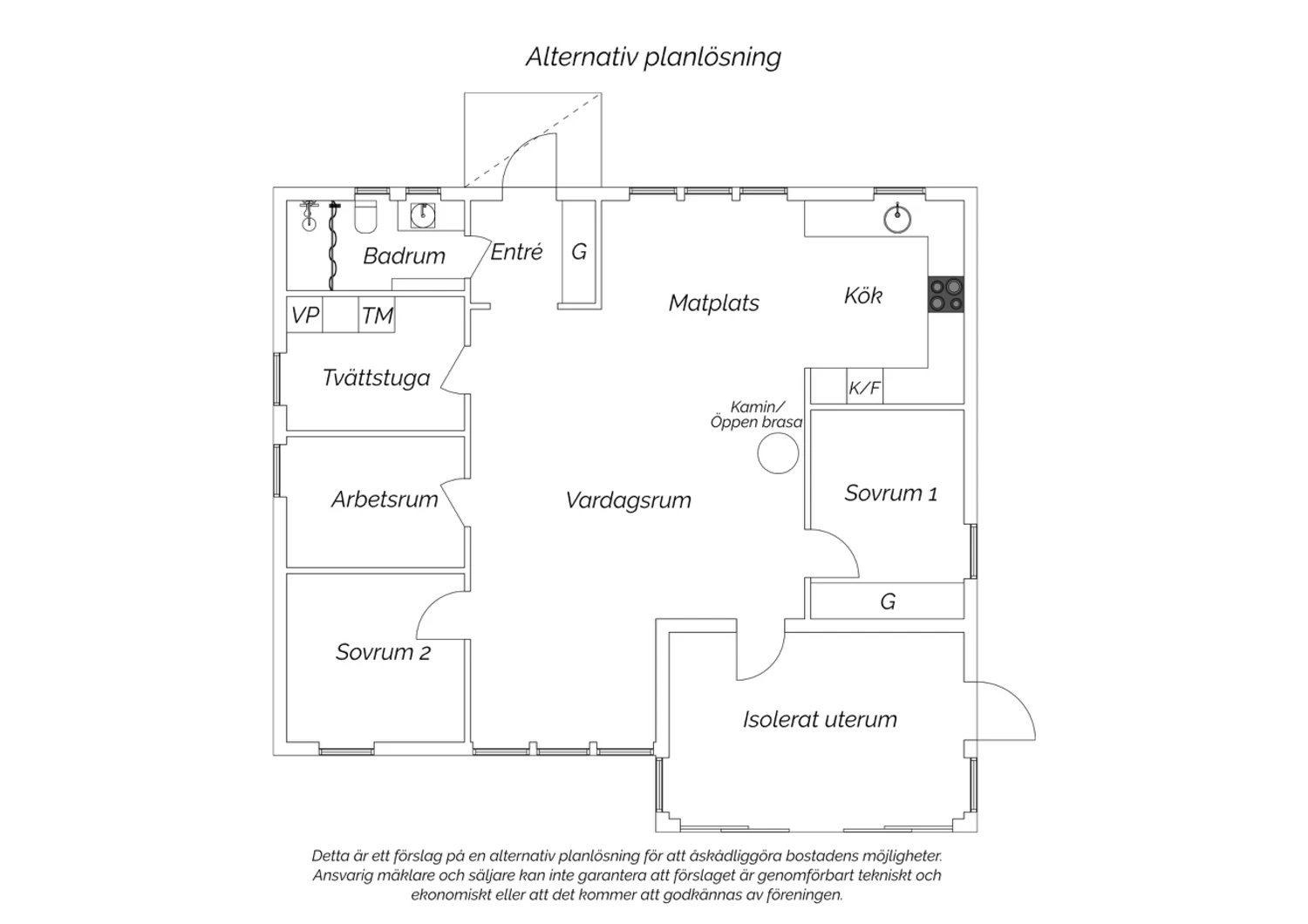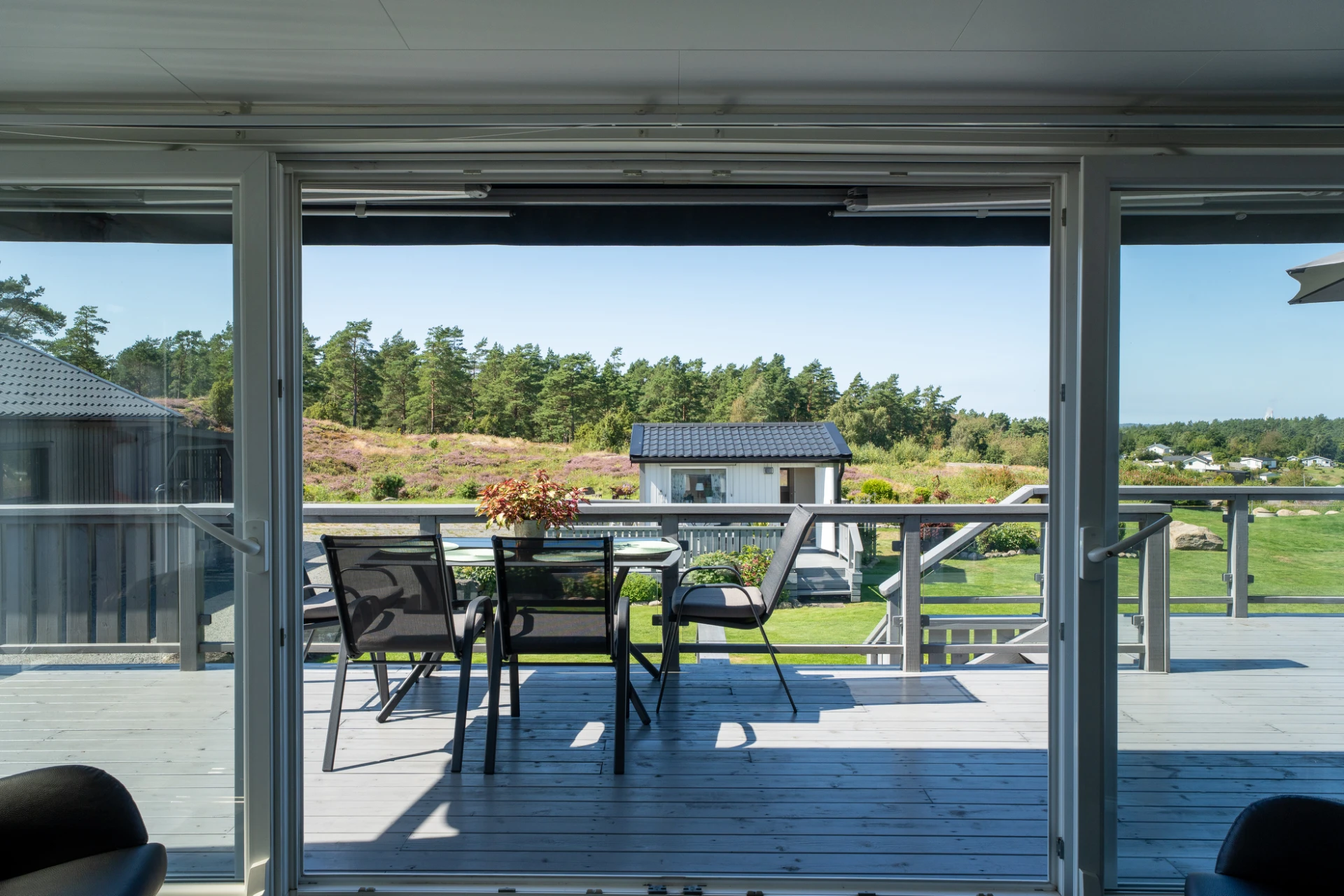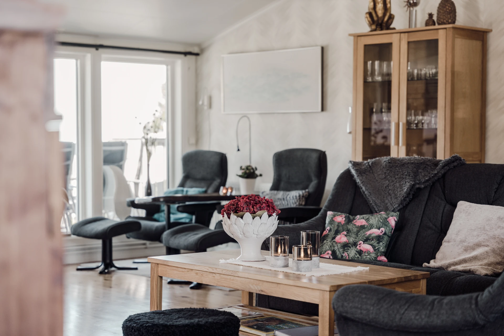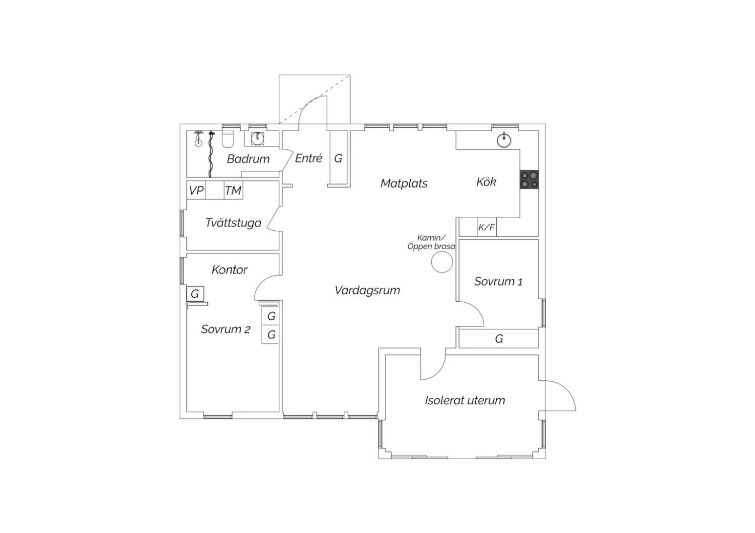 Klickgolv i furu och tapetserade väggar i ljus nyans. Här finns braskamin, plats för soffgrupp och förvaringsmöbel samt plats för en separat sittgrupp med förvarings-/tv-bänk alternativt en arbetshörna. Vardagsrummet ligger i öppen planlösning med matplats och kök. Härifrån når du även bostadens inglasade uterum.