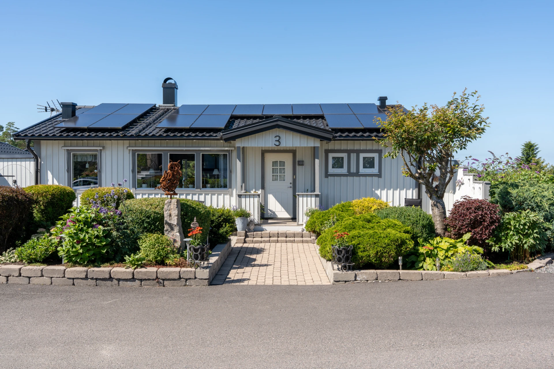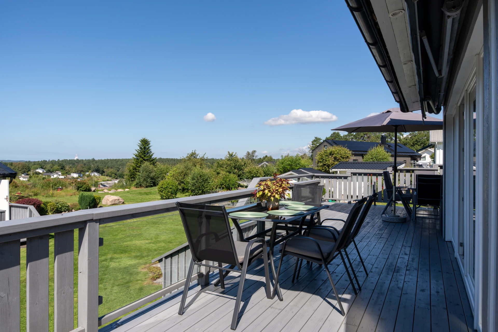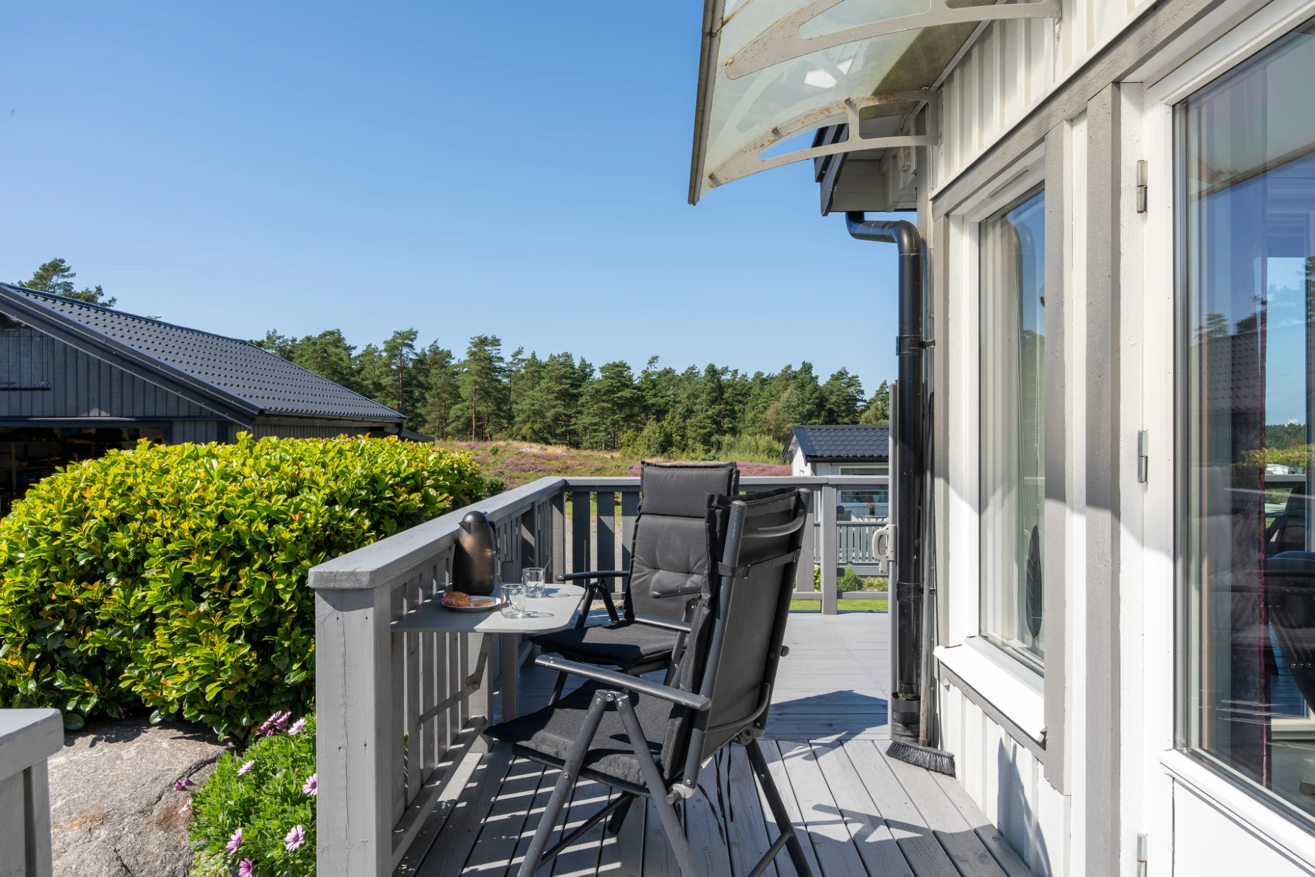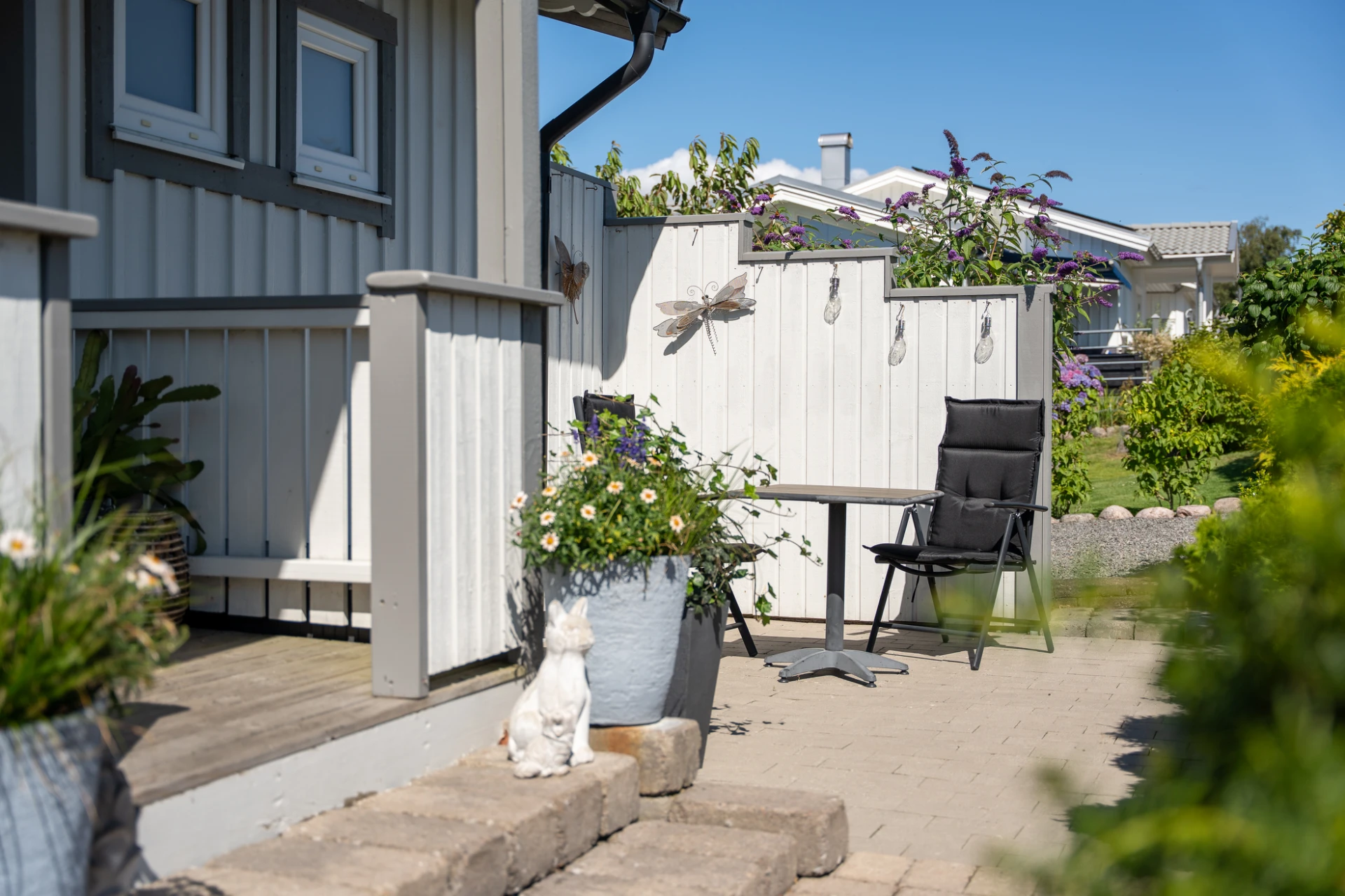 Klickgolv i furu och tapetserade väggar i ljus nyans. Här finns braskamin, plats för soffgrupp och förvaringsmöbel samt plats för en separat sittgrupp med förvarings-/tv-bänk alternativt en arbetshörna. Vardagsrummet ligger i öppen planlösning med matplats och kök. Härifrån når du även bostadens inglasade uterum.