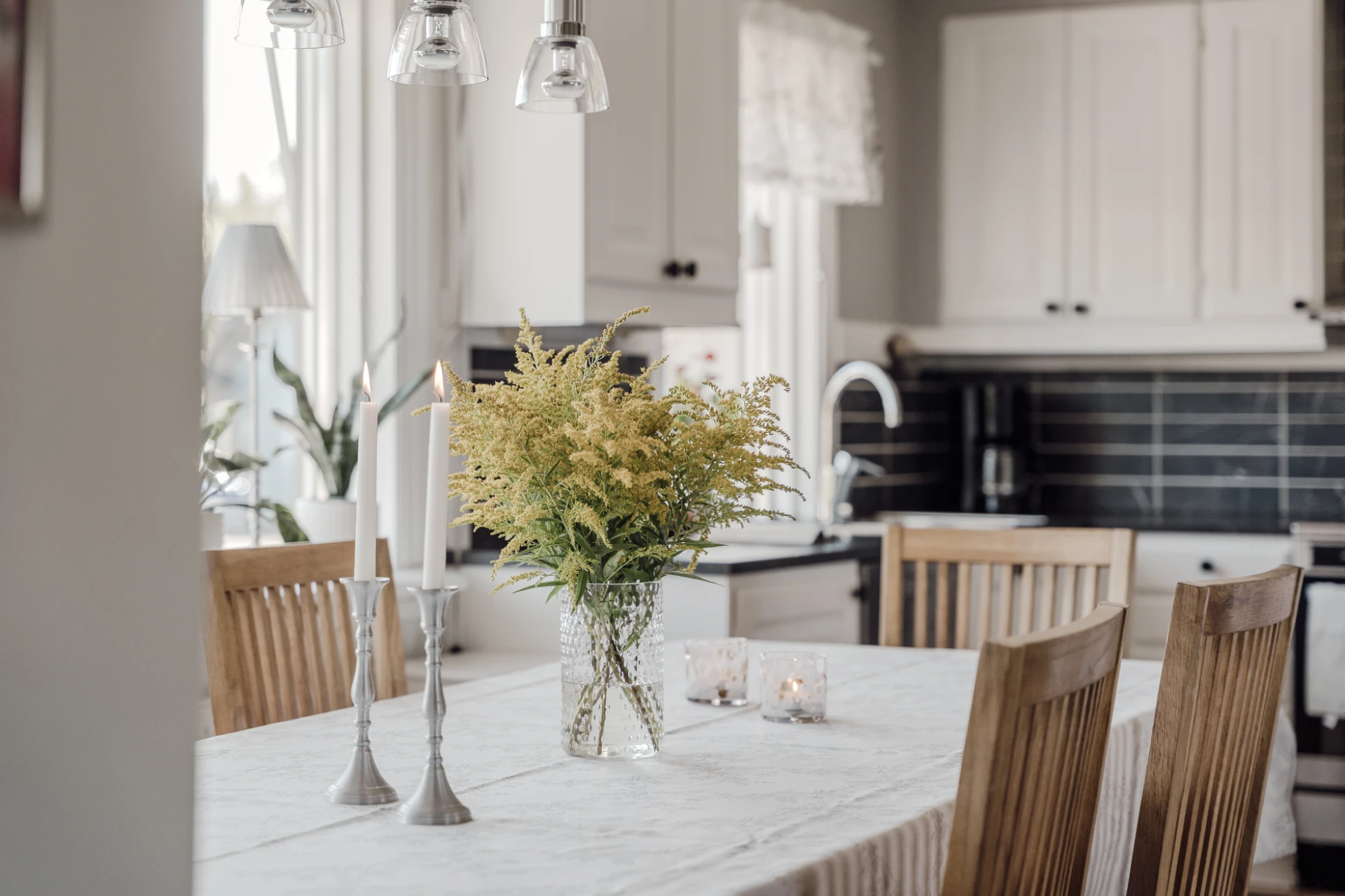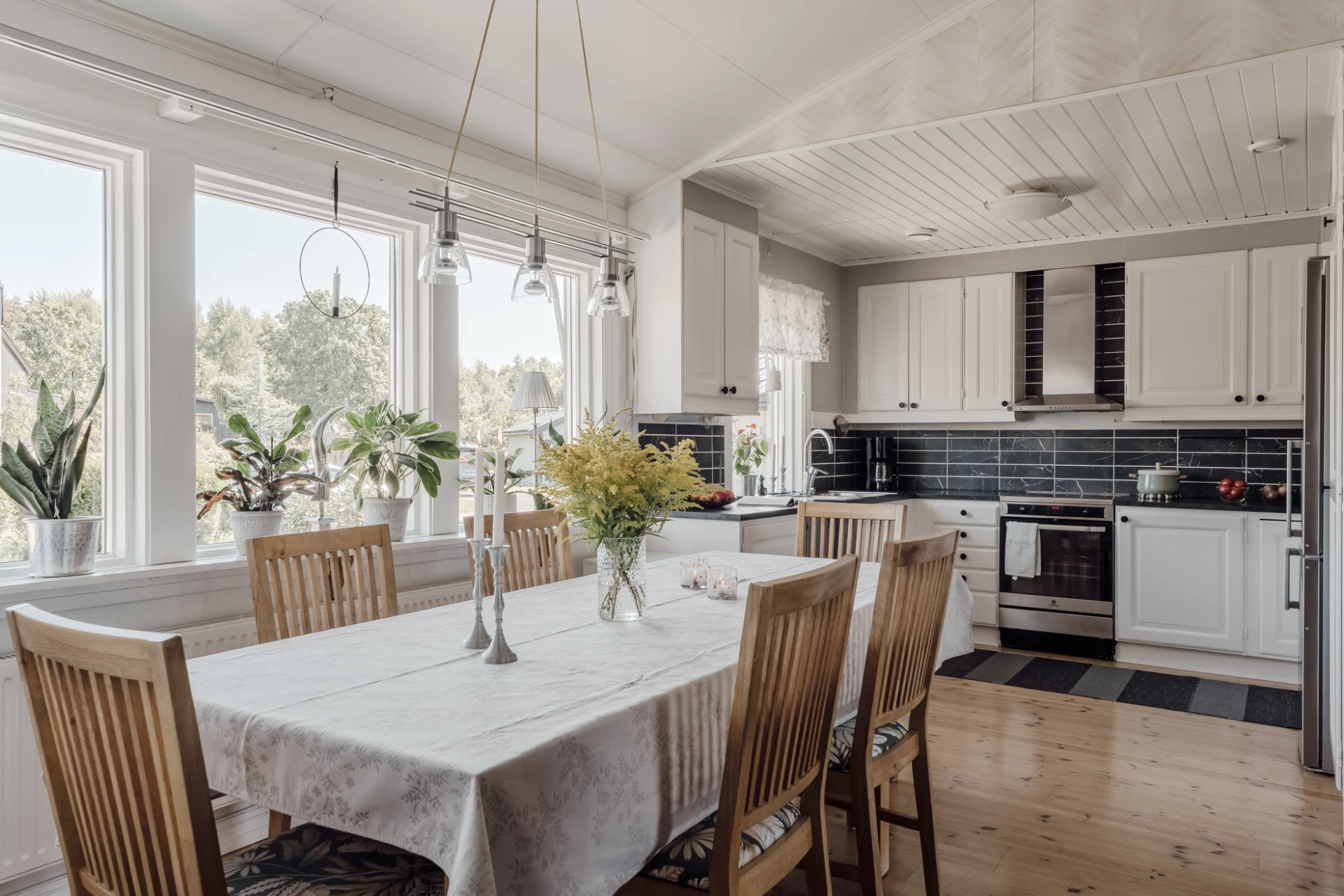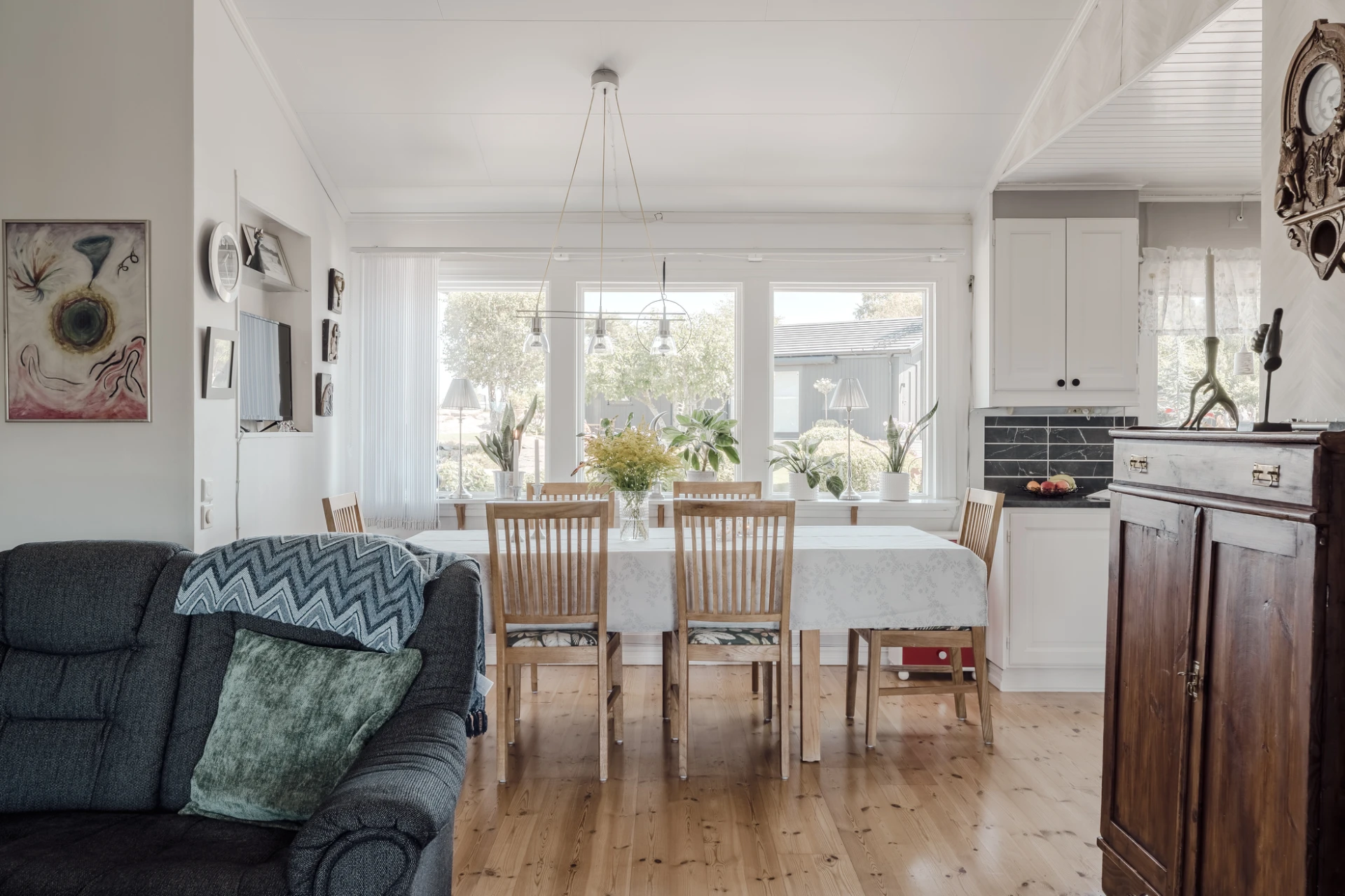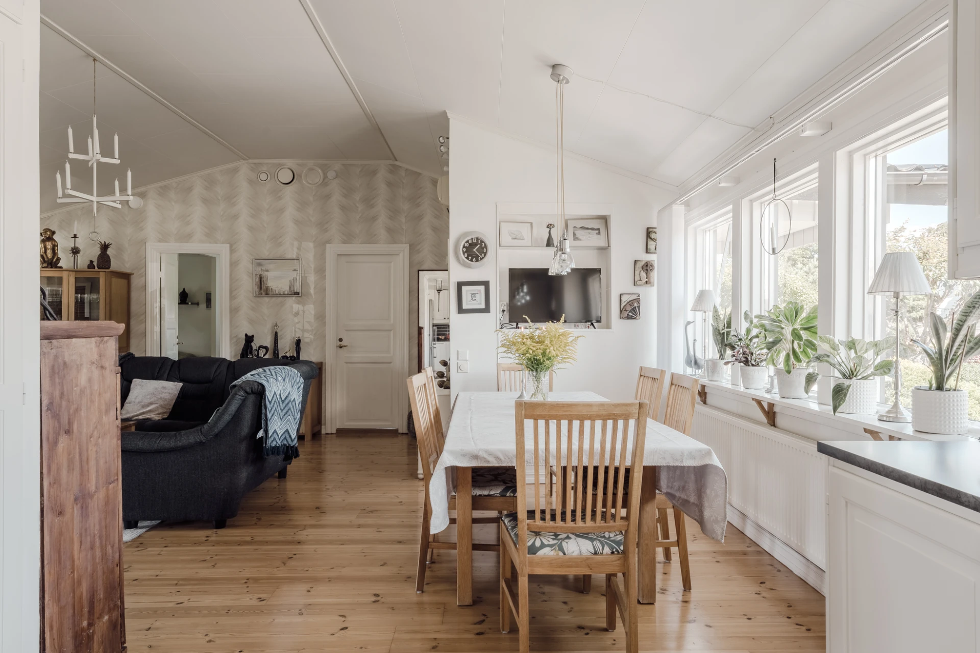 Klickgolv i furu och tapetserade väggar i ljus nyans. Här finns plats för matgrupp samt förvaringsmöbel.
