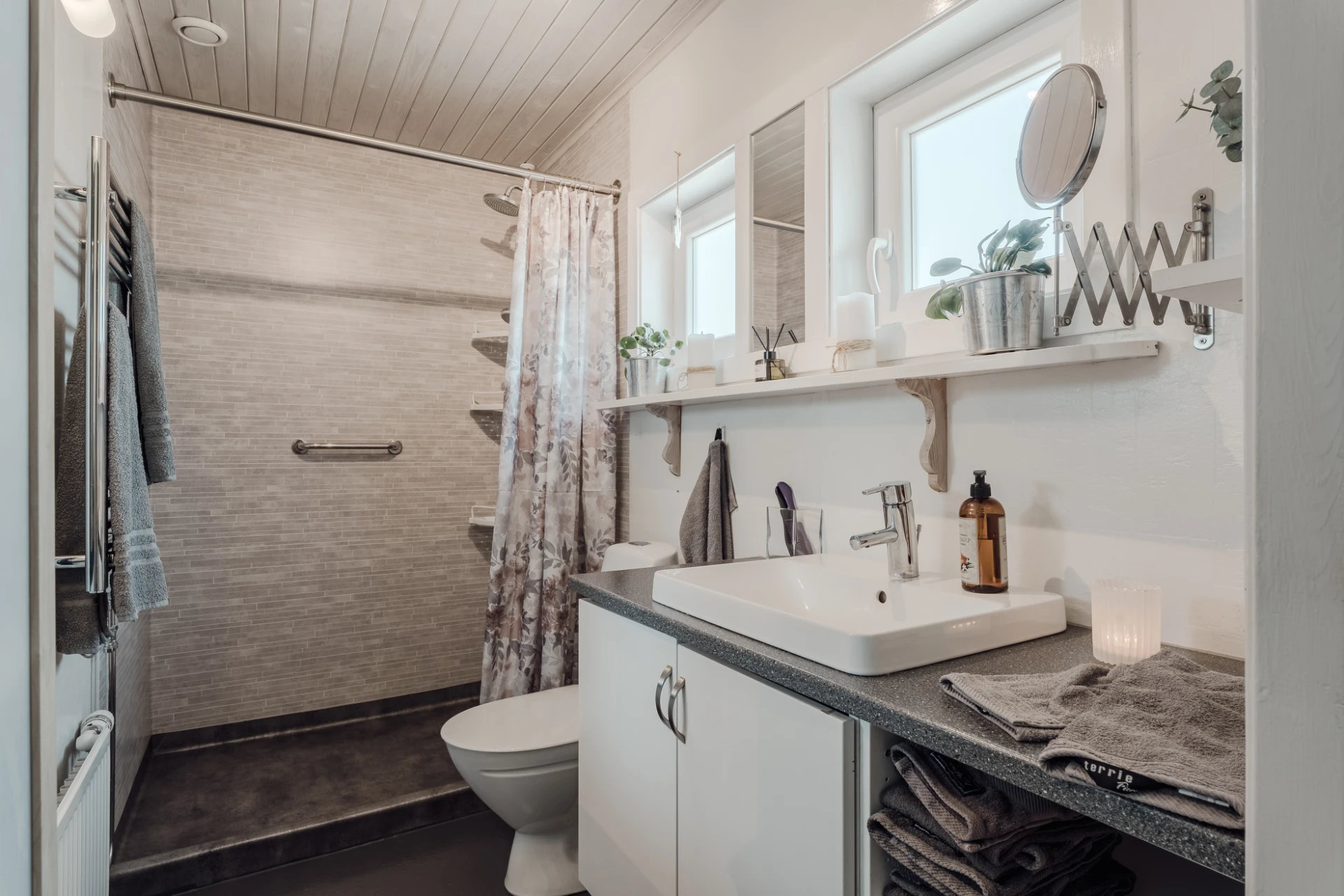 Grå plastmatta på golvet samt vit plastmatta på väggarna. Utrustat med dusch, toalett, handdukstork samt handfat med tvättställsmöbel.