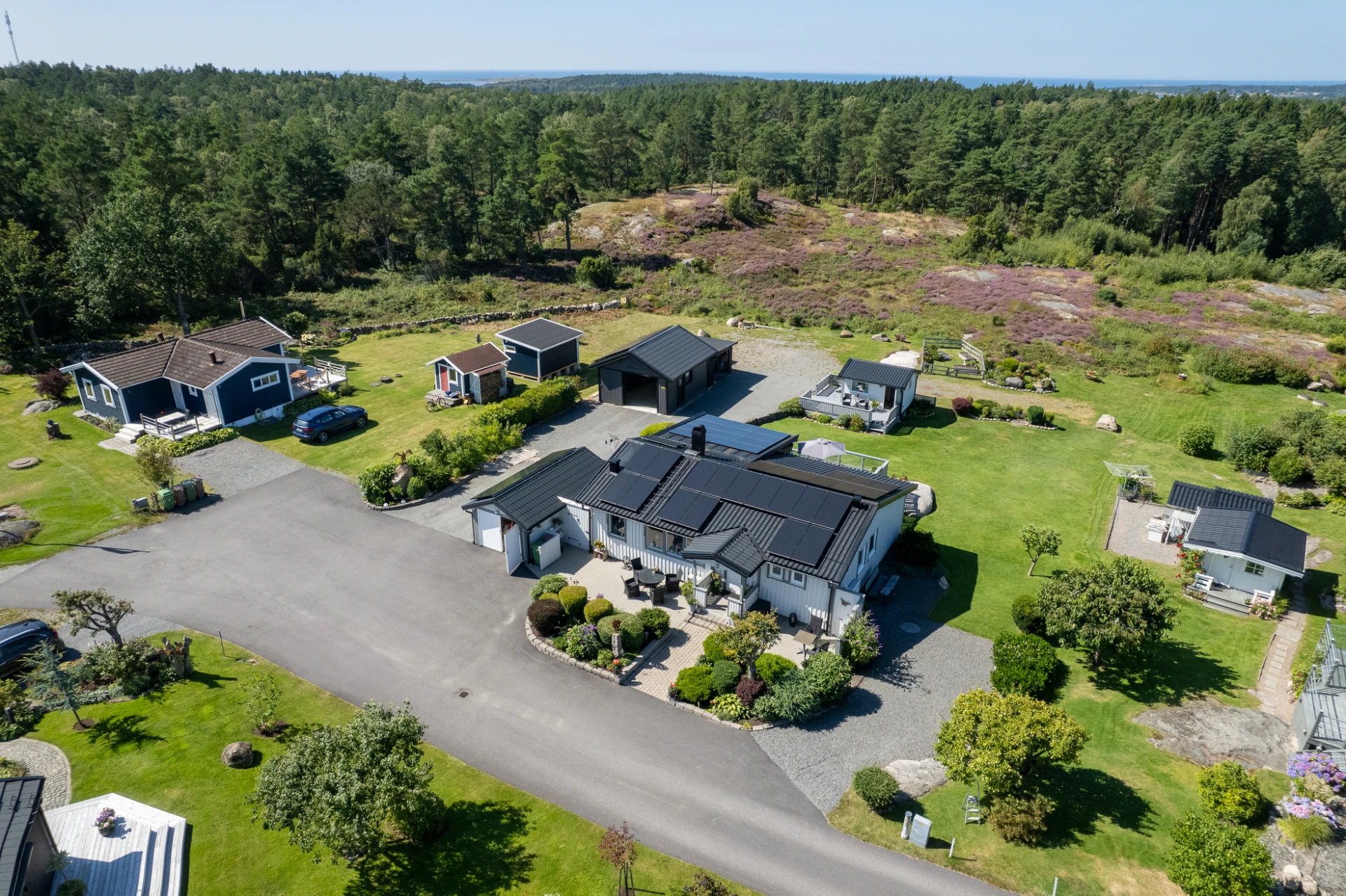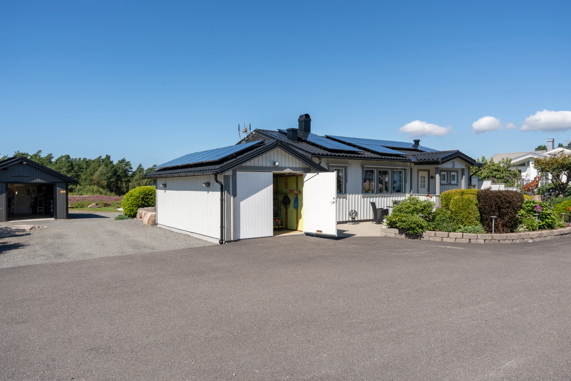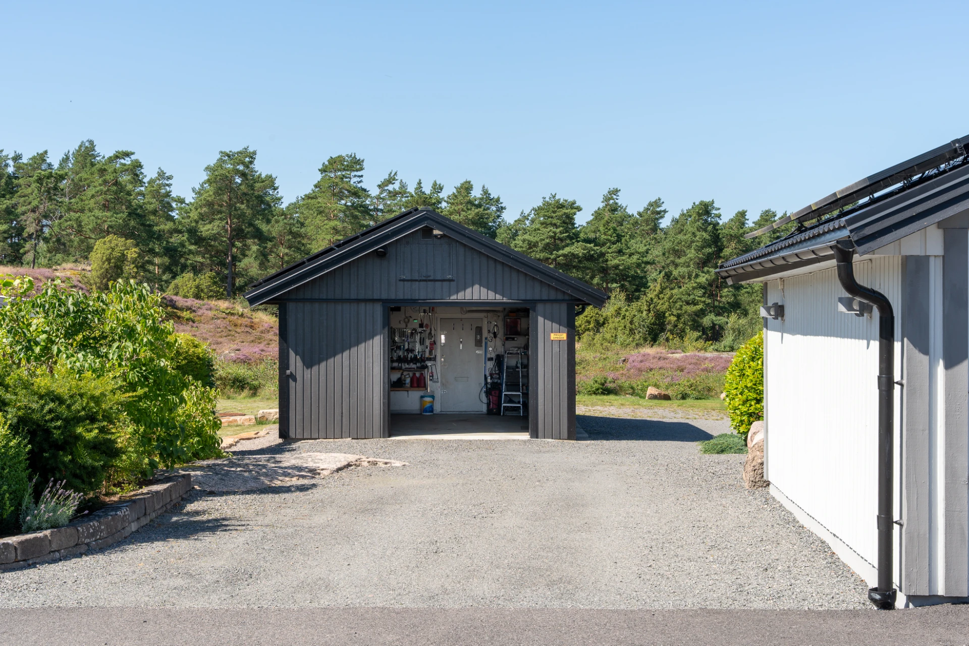 Det finns ett isolerat garage med luft/luft värmepump samt plats för en bil och förvaring, alternativt för en svetsbänk.