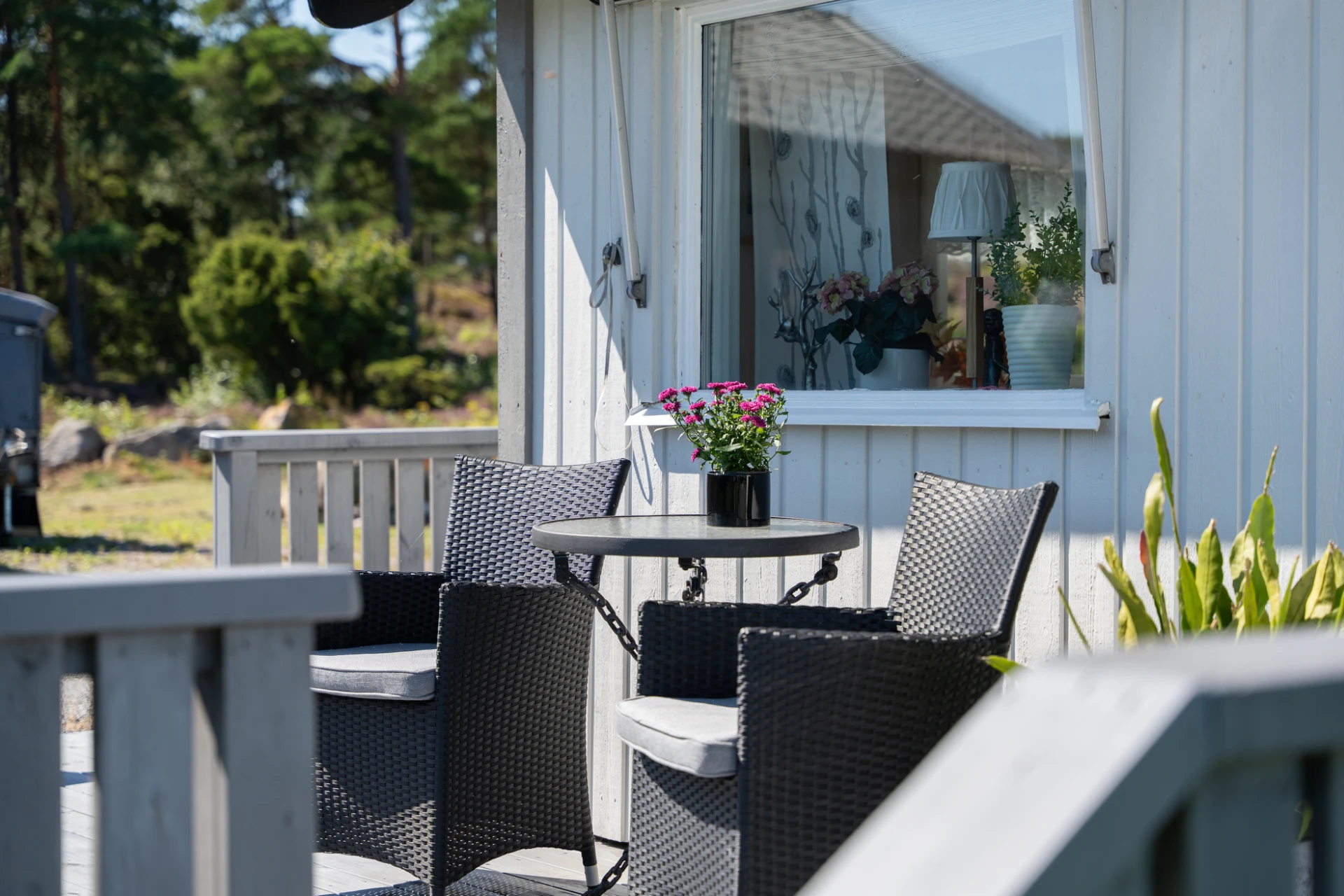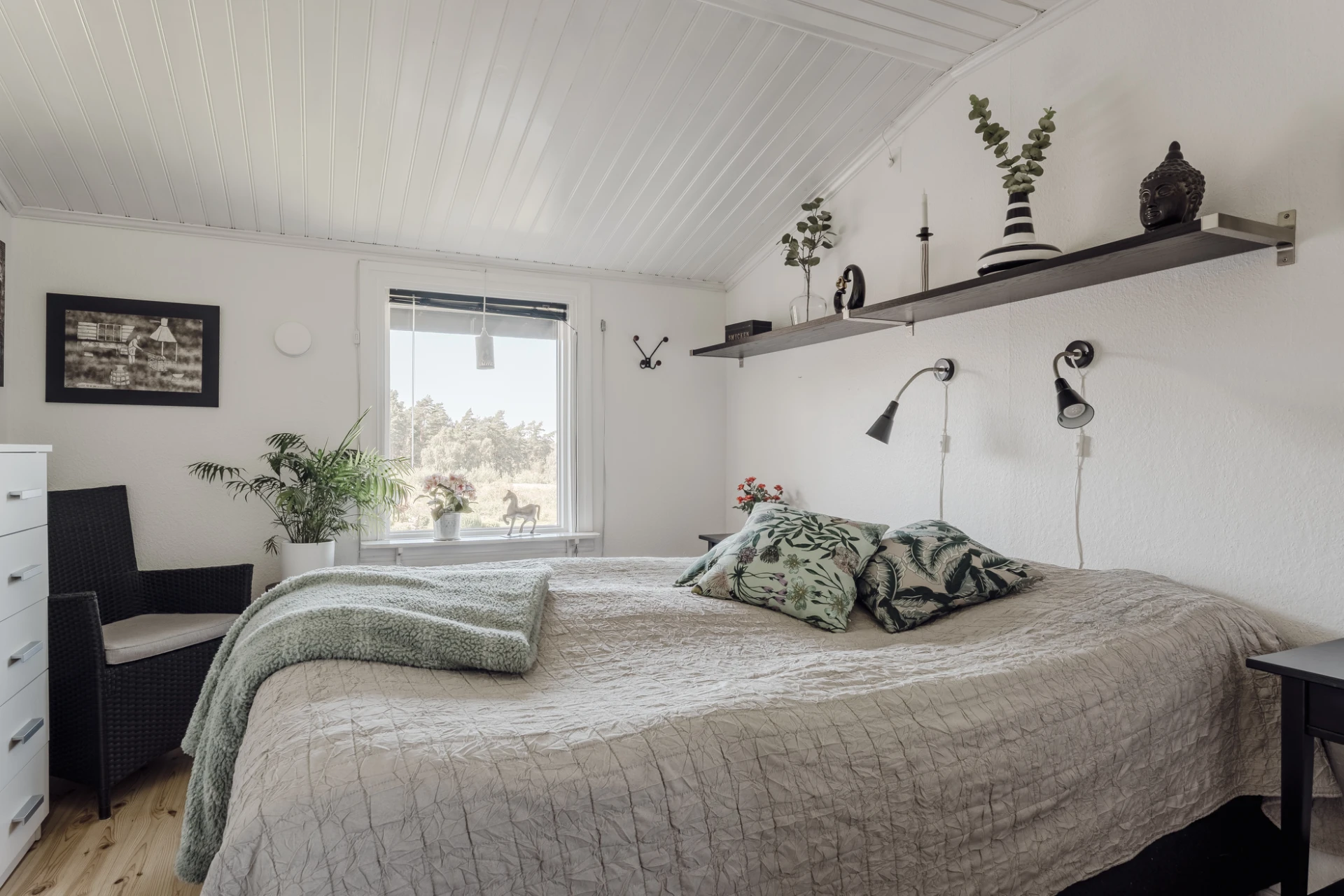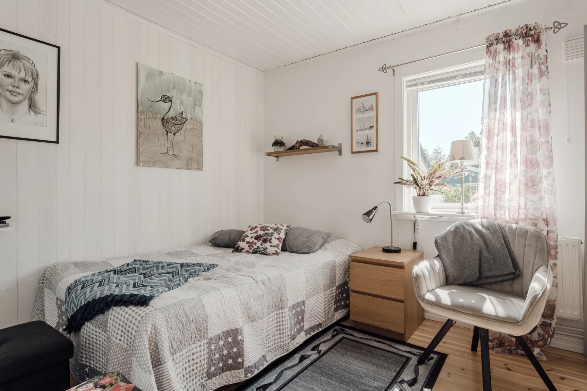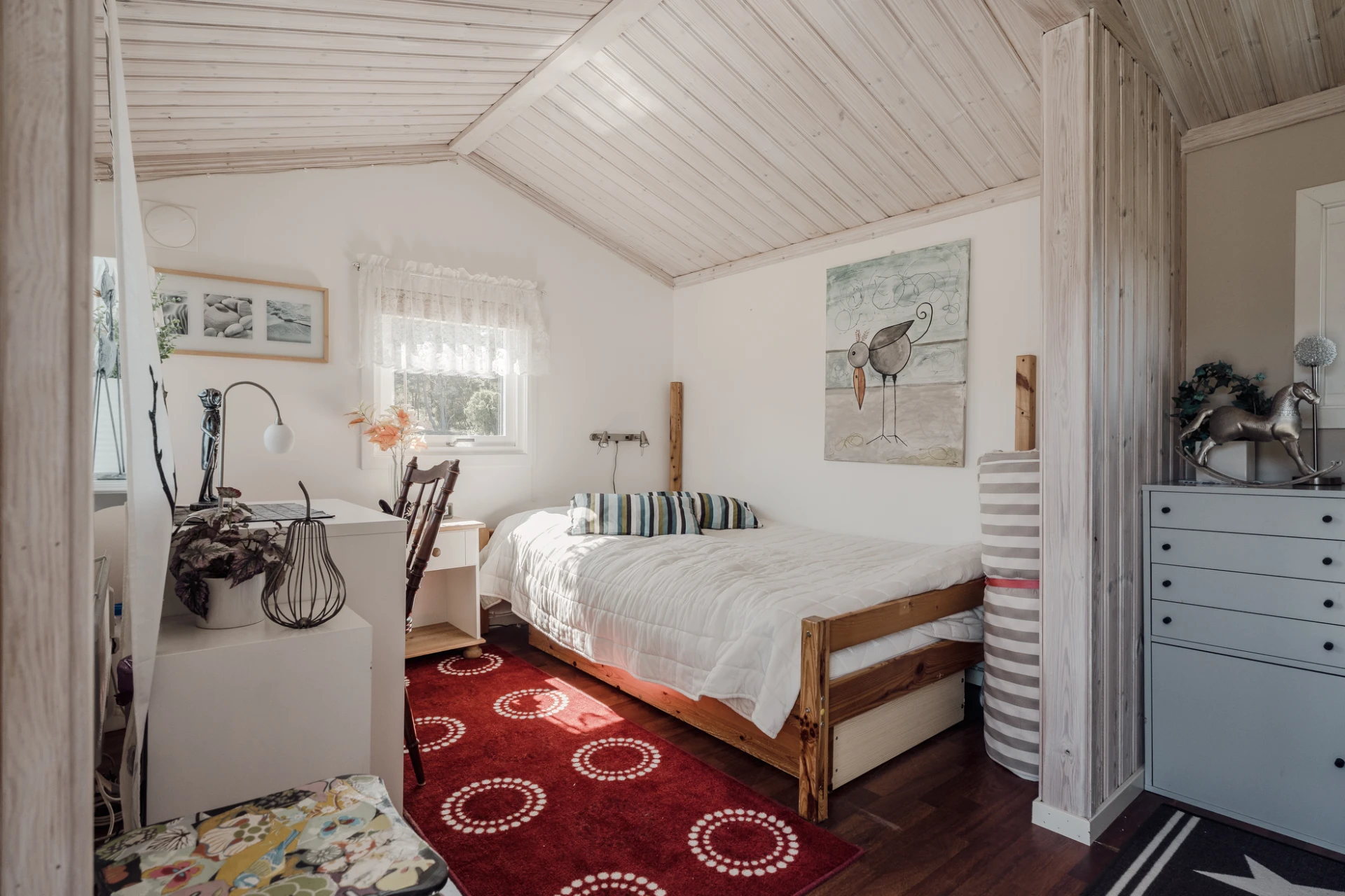 Klickgolv i furu och vitmålade väggar. Taket är klätt i vitmålade träpaneler. Det finns förvaring i två garderober samt plats för dubbelsäng och ytterligare förvaringsmöbel.