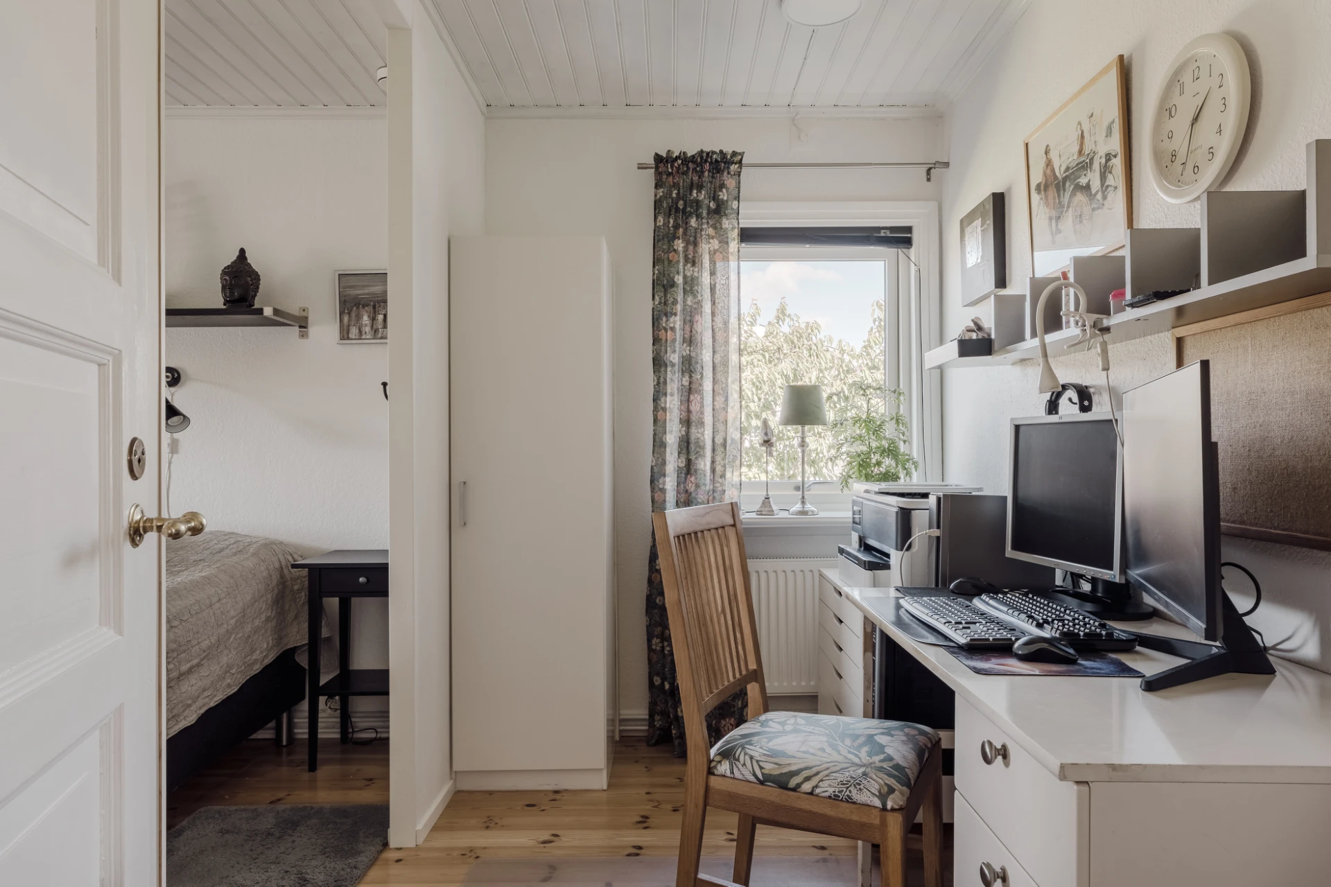 Klickgolv i furu och vitmålade väggar. Taket är klätt i vitmålade träpaneler. Det finns förvaring i en garderob samt plats för kontorsmöbel och ytterligare förvaringsmöbel.
