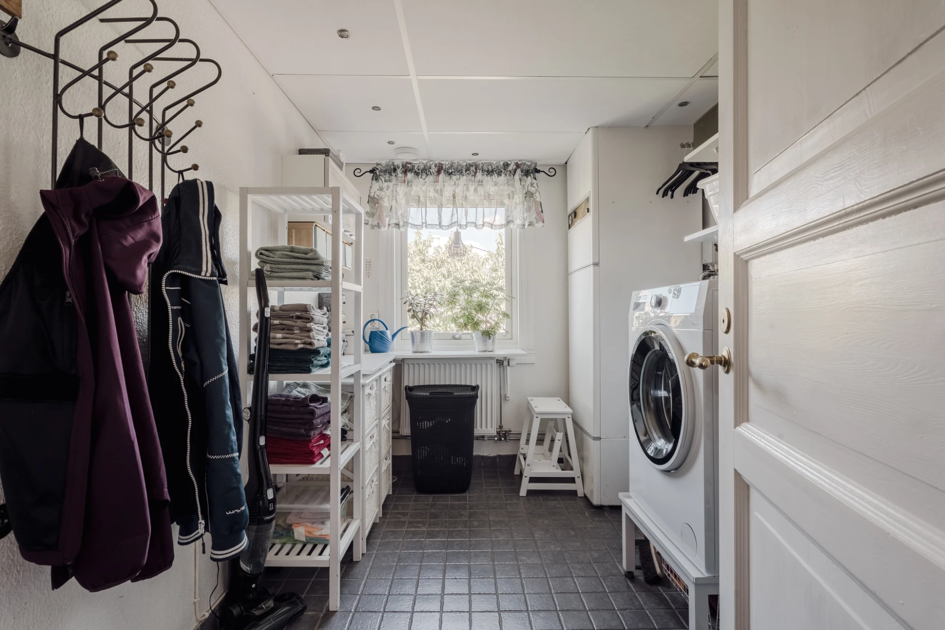 Klinker i mörkgrå nyans och vitmålade väggar. Här finns tvättmaskin samt plats för förvaring och plats för torktumlare för den som önskar.