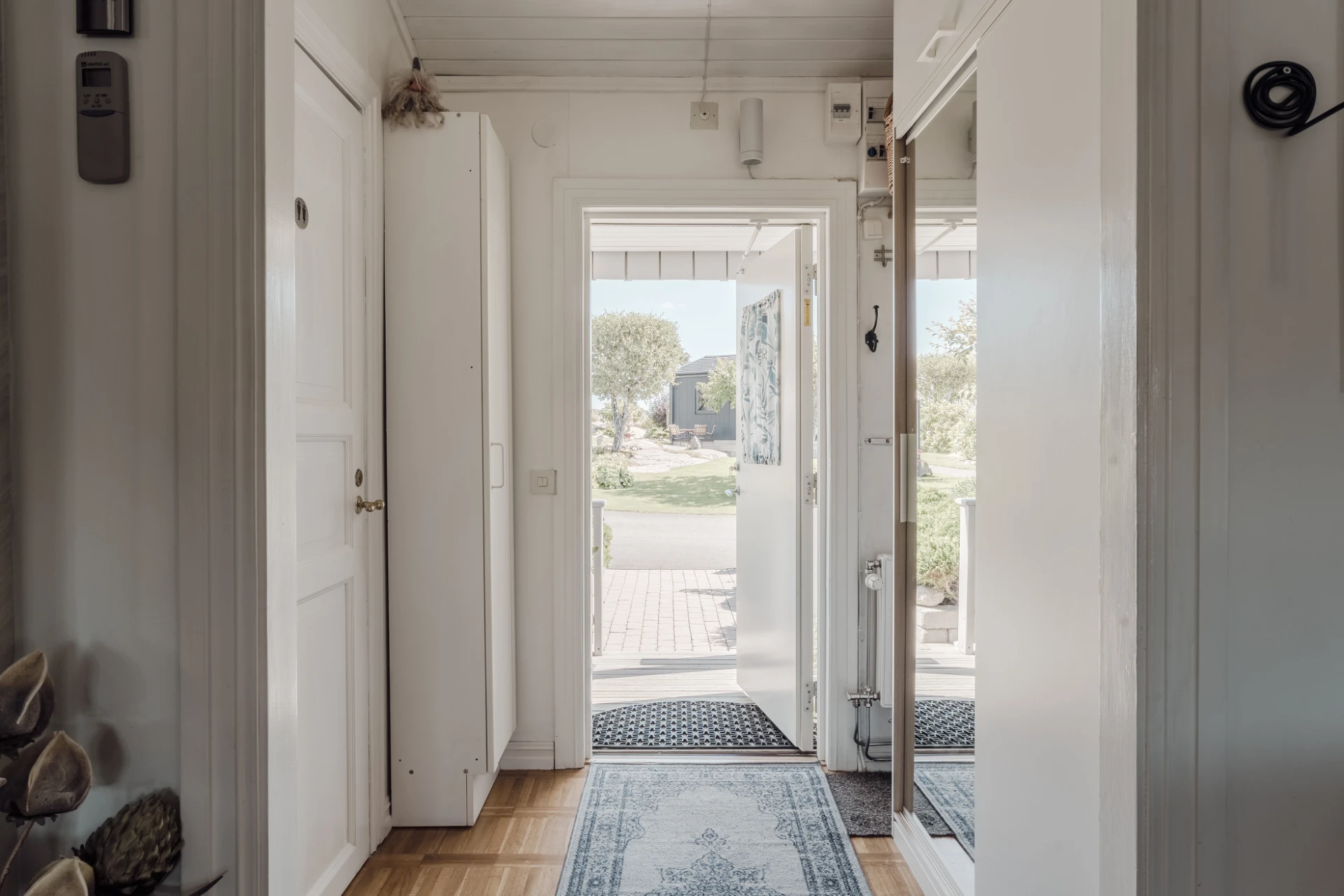 Laminatgolv och vitmålade väggar. Förvaring i skjutdörrsgarderob med spegelglas samt ytterligare en garderob. Plats för avhängning.