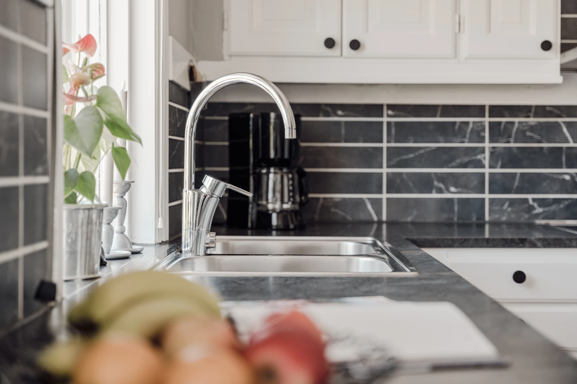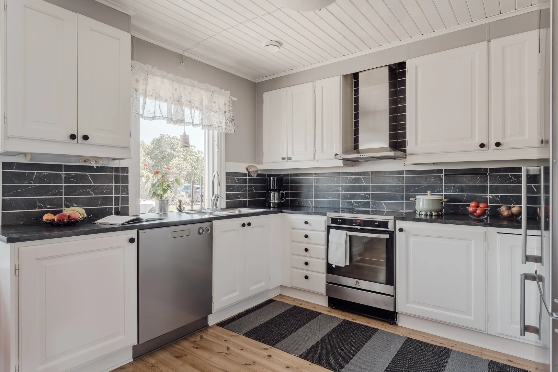 Klickgolv i furu och målade väggar i vit-grå nyans. Taket är klätt i vitmålade träpaneler. Köksstommar i vit kulör. Bänkskiva är i mörkgrå laminat och stänkskydd består av kakel i mörkgrå marmorerad kulör. Det finns häll, ugn, fläkt, mikrovågsugn, kombinerad kyl och frys, integrerad diskmaskin samt diskho.