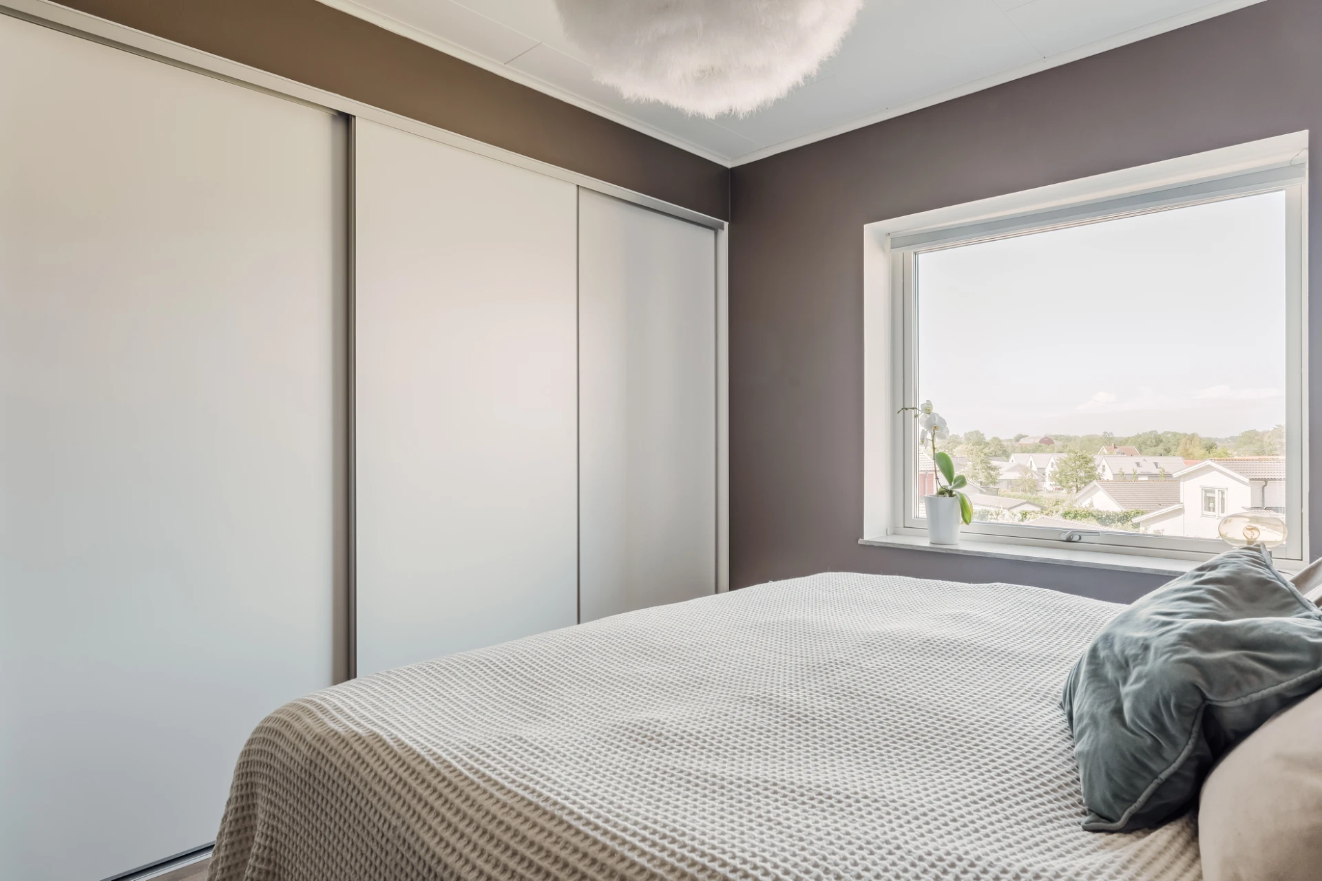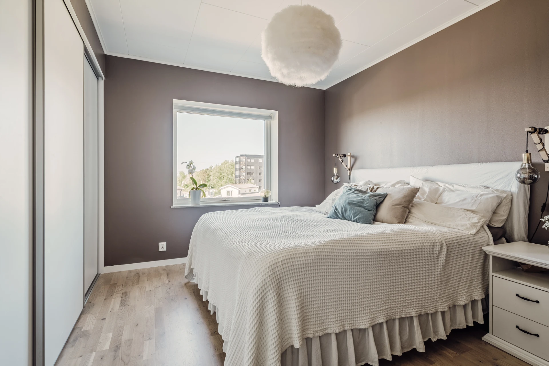Parkettgolv och väggar målade i brun nyans. Plats för dubbelsäng. Förvaring i skjutdörrsgarderob.