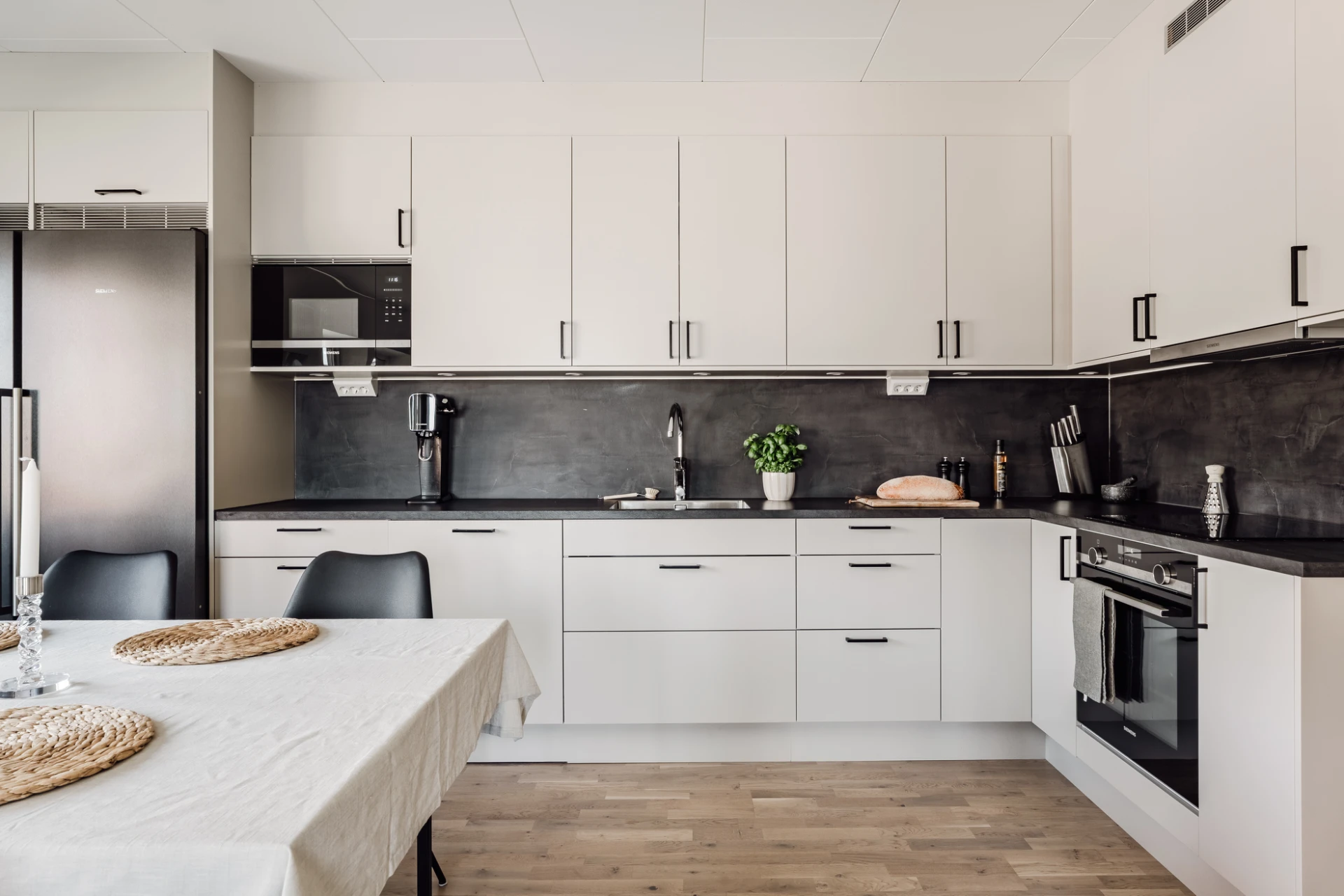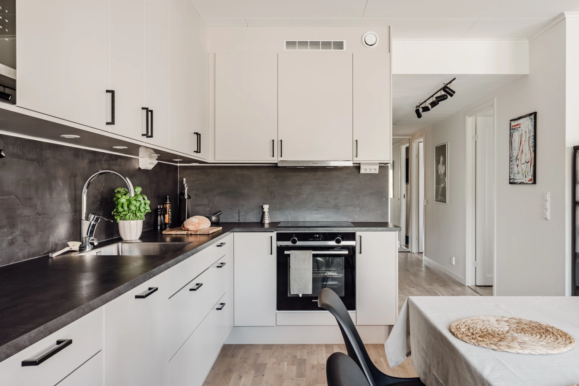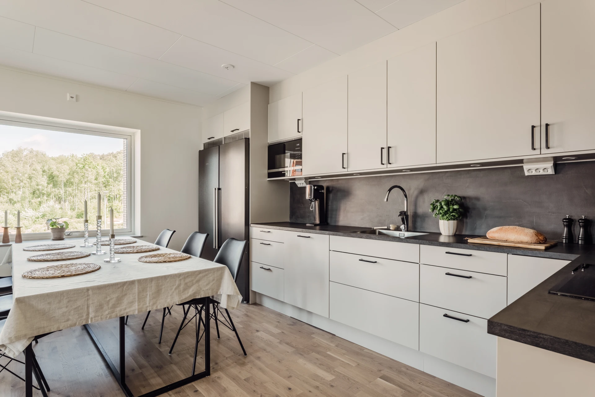 Parkettgolv och vita väggar. Köksinredning i sandfärg med bänkskiva i svart laminat (Marbodal). Ovan arbetsytor är väggen klädd i mörkt stänkskydd (Kolsvart/Marbodal). Köket är utrustat med induktionshäll, fläkt, inbyggd ugn med pyrolys, inbyggd mikro, kyl, frys och integrerad diskmaskin. Öppet mot vardagsrum.