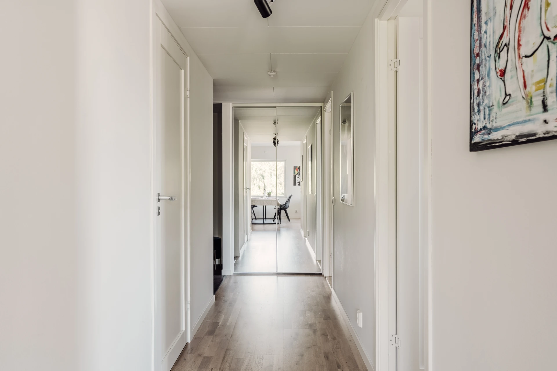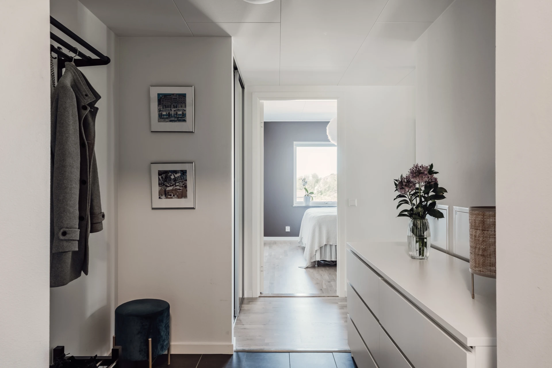 Mörkgrått klinkergolv och vita väggar. Plats för hatthylla och byrå. Förvaring i inbyggd garderob med skjutdörrar i spegelglas.