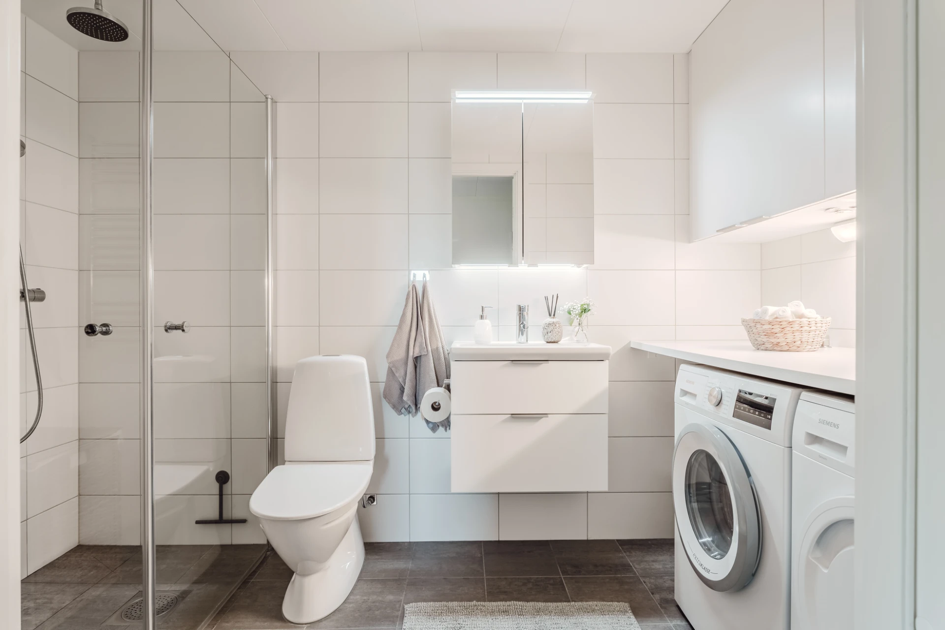 Grått klinkergolv med golvvärme och väggar klädda i vitt kakel. Här finns handfat med kommod, spegelskåp med belysning, dusch med glasdörrar, tvättmaskin, torktumlare, arbetsbänk, förvaringsskåp och toalett.