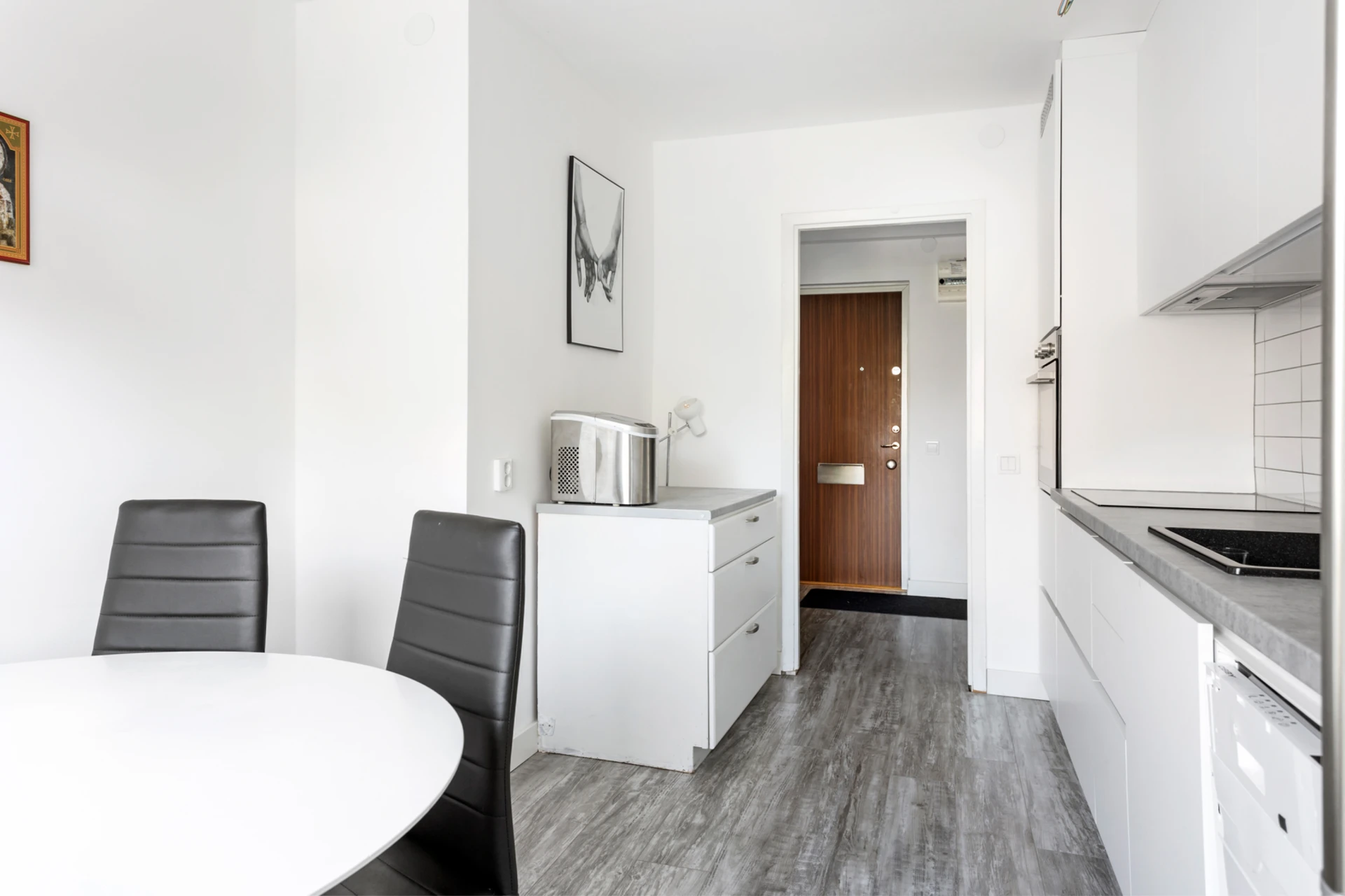 Laminatgolv och vita väggar. Vit köksinredning och vitt kakel ovan grå bänkskiva i laminat. Köket är utrustat med kyl/frys, spishäll, fläkt, inbyggd ugn och diskmaskin.