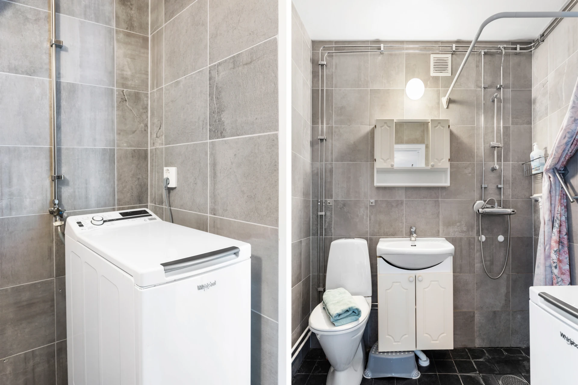Mörkt klinker och grått kakel. Badrummet är inrett med WC, handfat med underskåp, spegelskåp, dusch och toppmatad tvättmaskin.