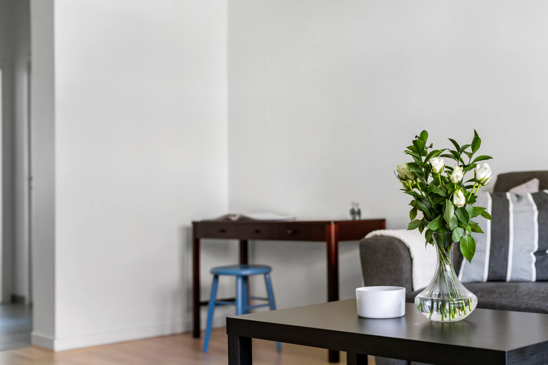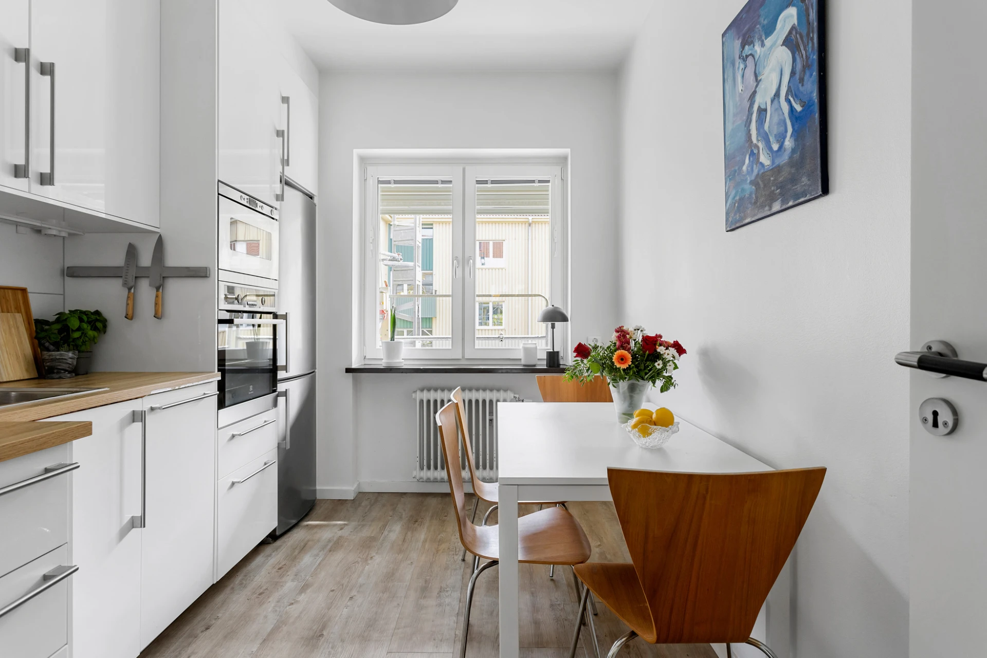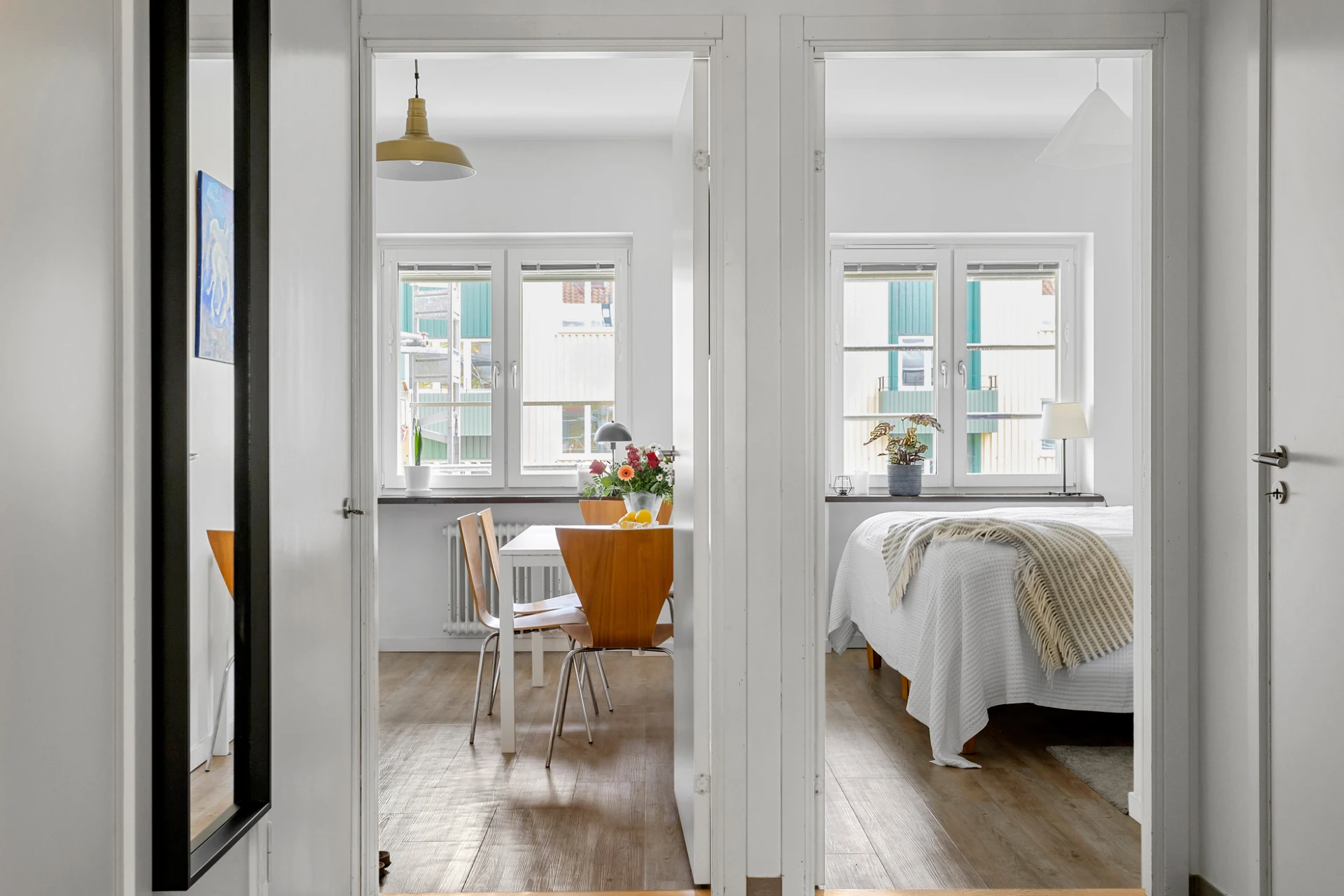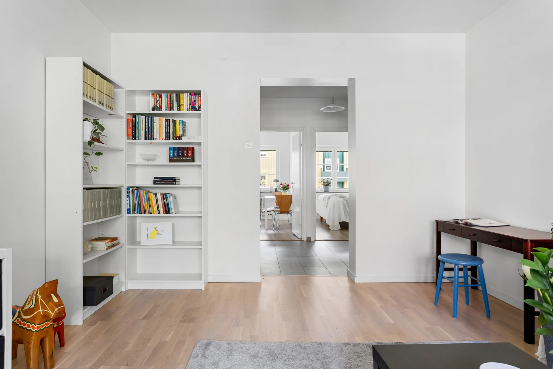 Laminatgolv och vita väggar.