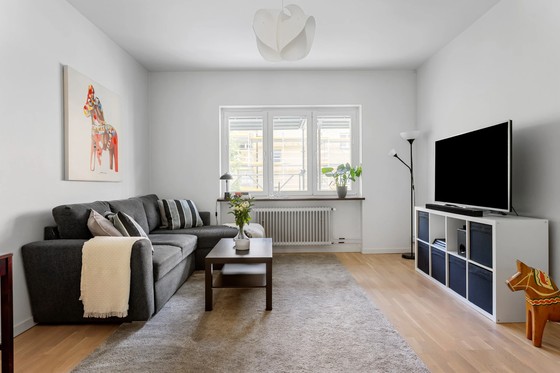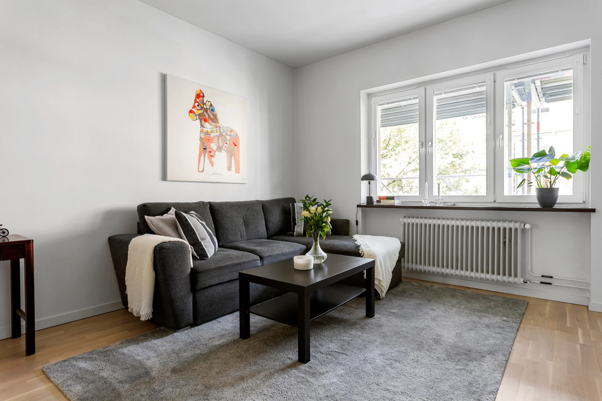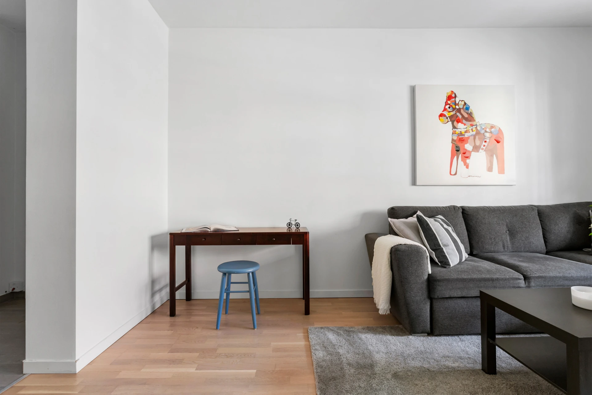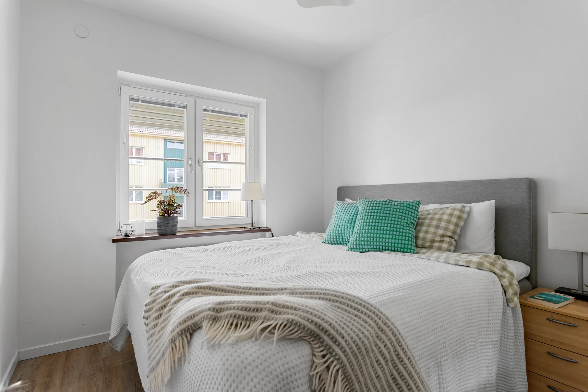 Laminatgolv och vita väggar.