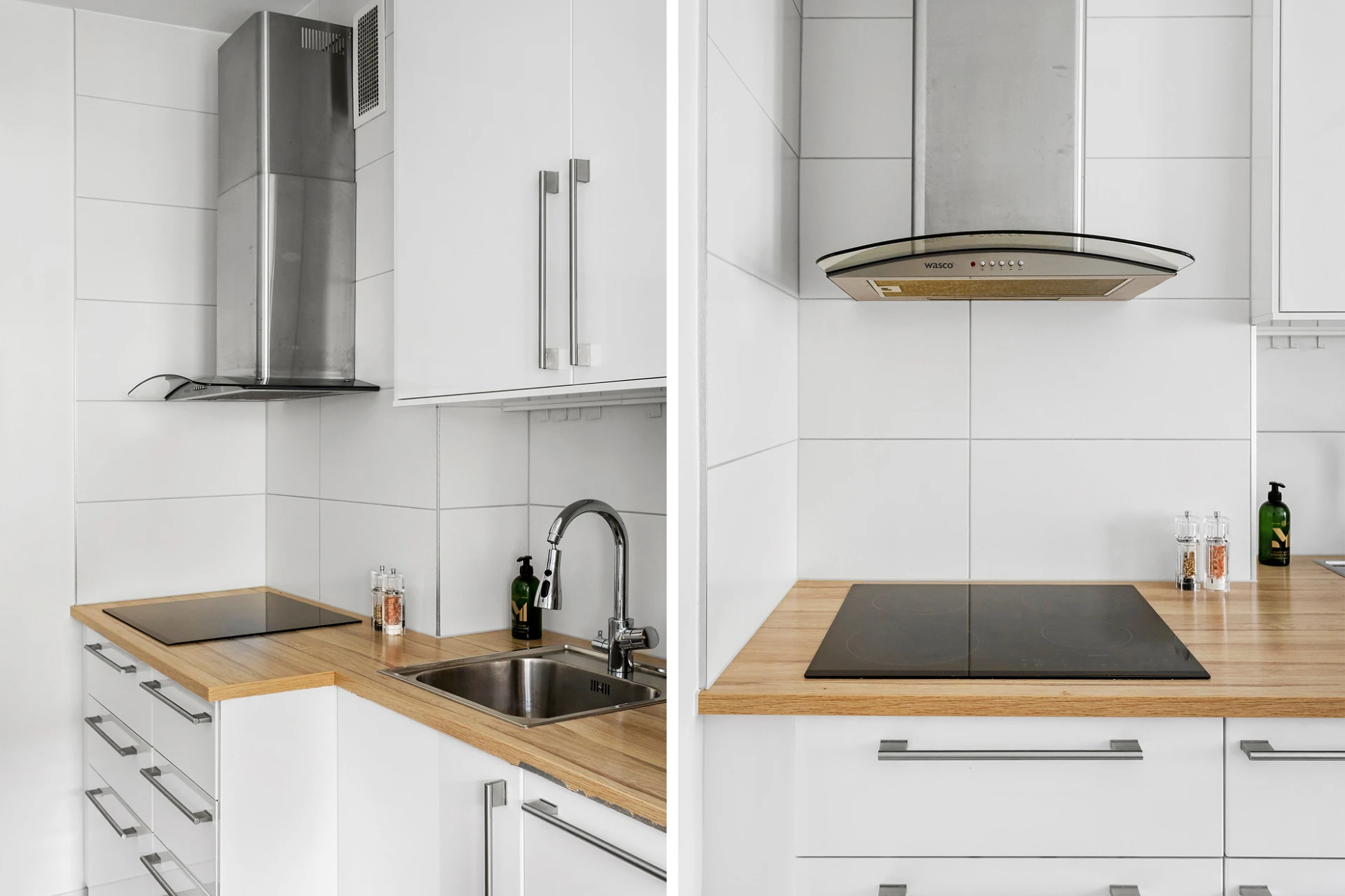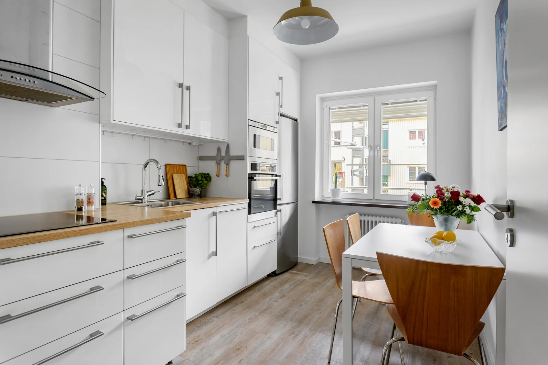 Laminatgolv och vita väggar. Vit köksinredning med vitt kakel ovan ljus bänkskiva. Utrustat med kyl/frys, mikrovågsugn, varmluftsugn, integrerad diskmaskin, induktionshäll och fläkt.