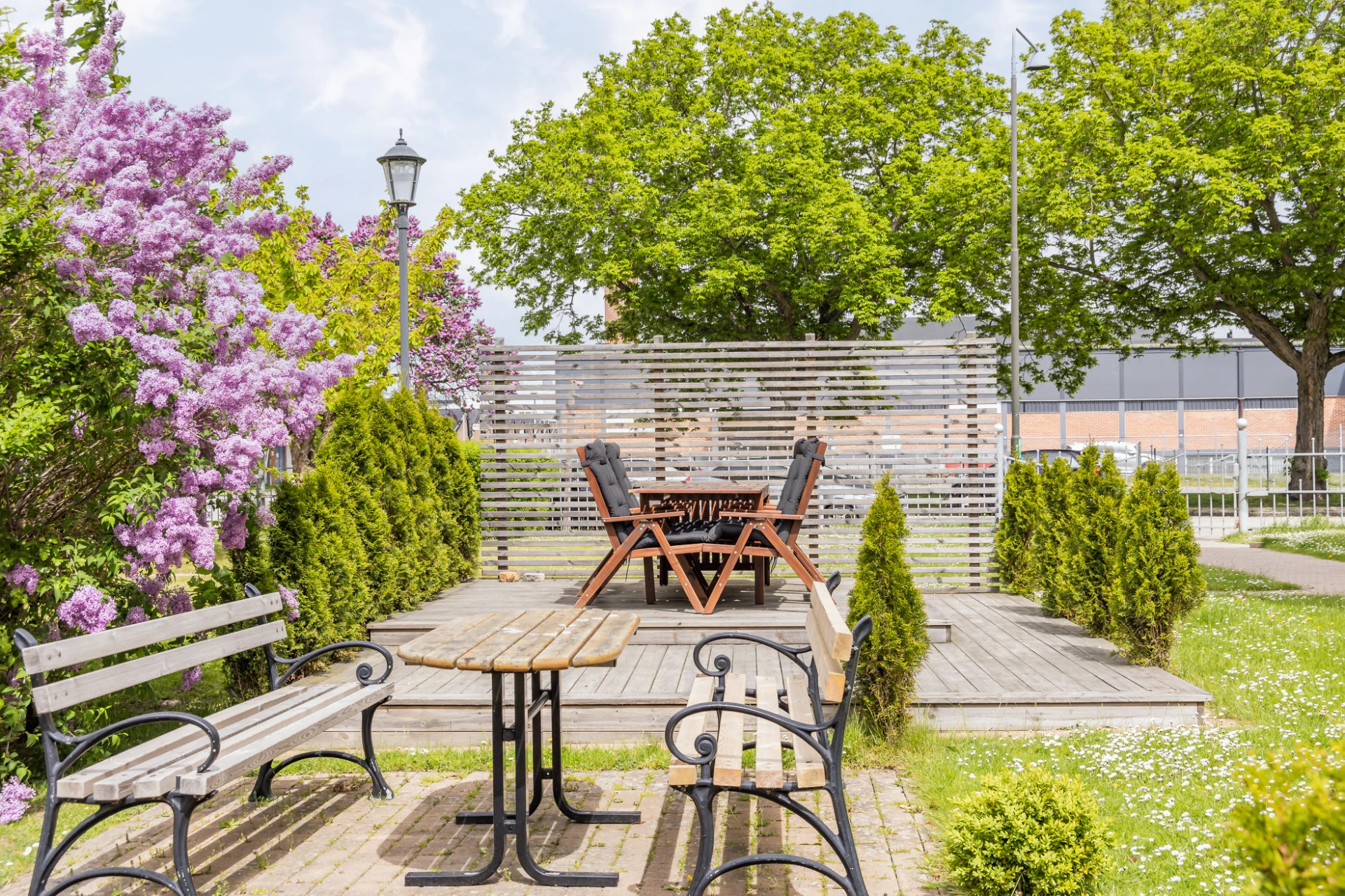 Föreningen har en gemensam grönskande trädgård inredd med grill, utemöbler och miljöhus.