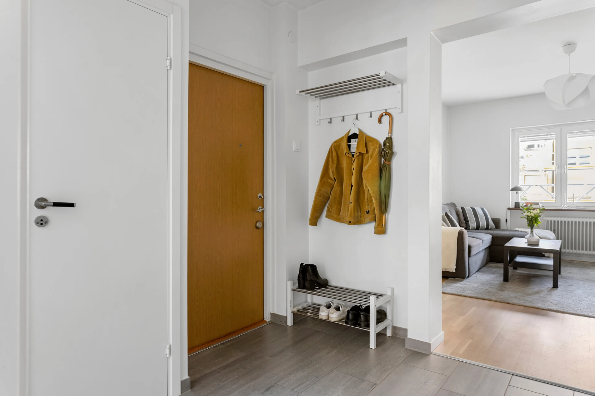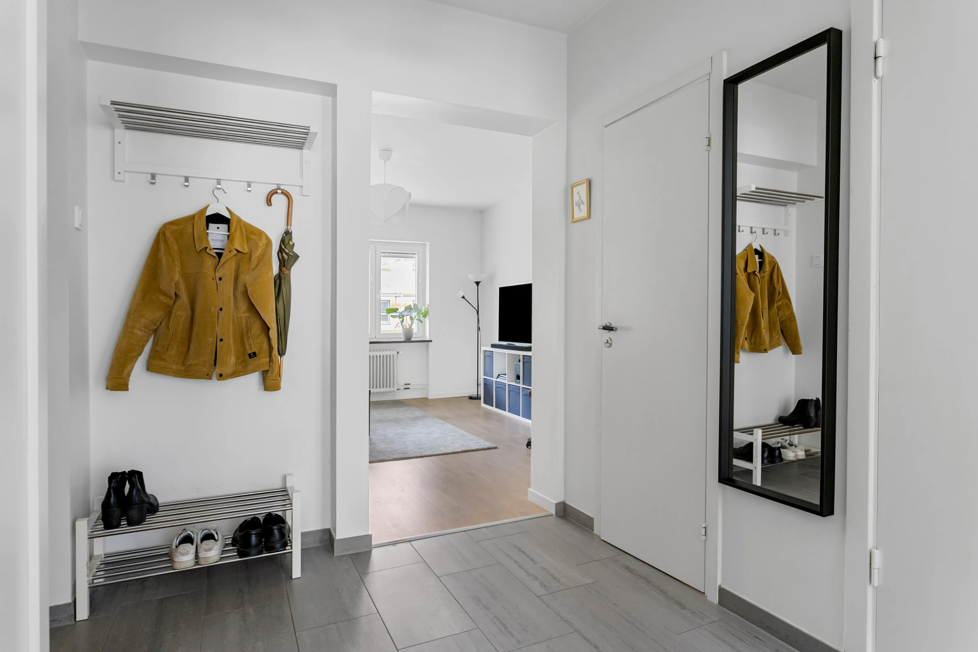 Grå klinker och vita väggar. Förvaring i garderob och klädkammare.