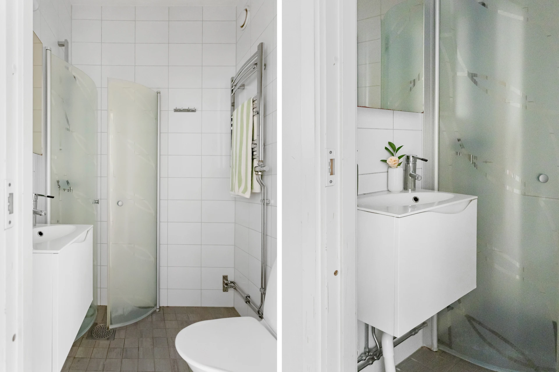 Helkaklat badrum med grå klinker och vitt kakel. Utrustat med WC, dusch med vikbara duschdörrar i glas, handdukstork, handfat med kommod och spegelskåp.