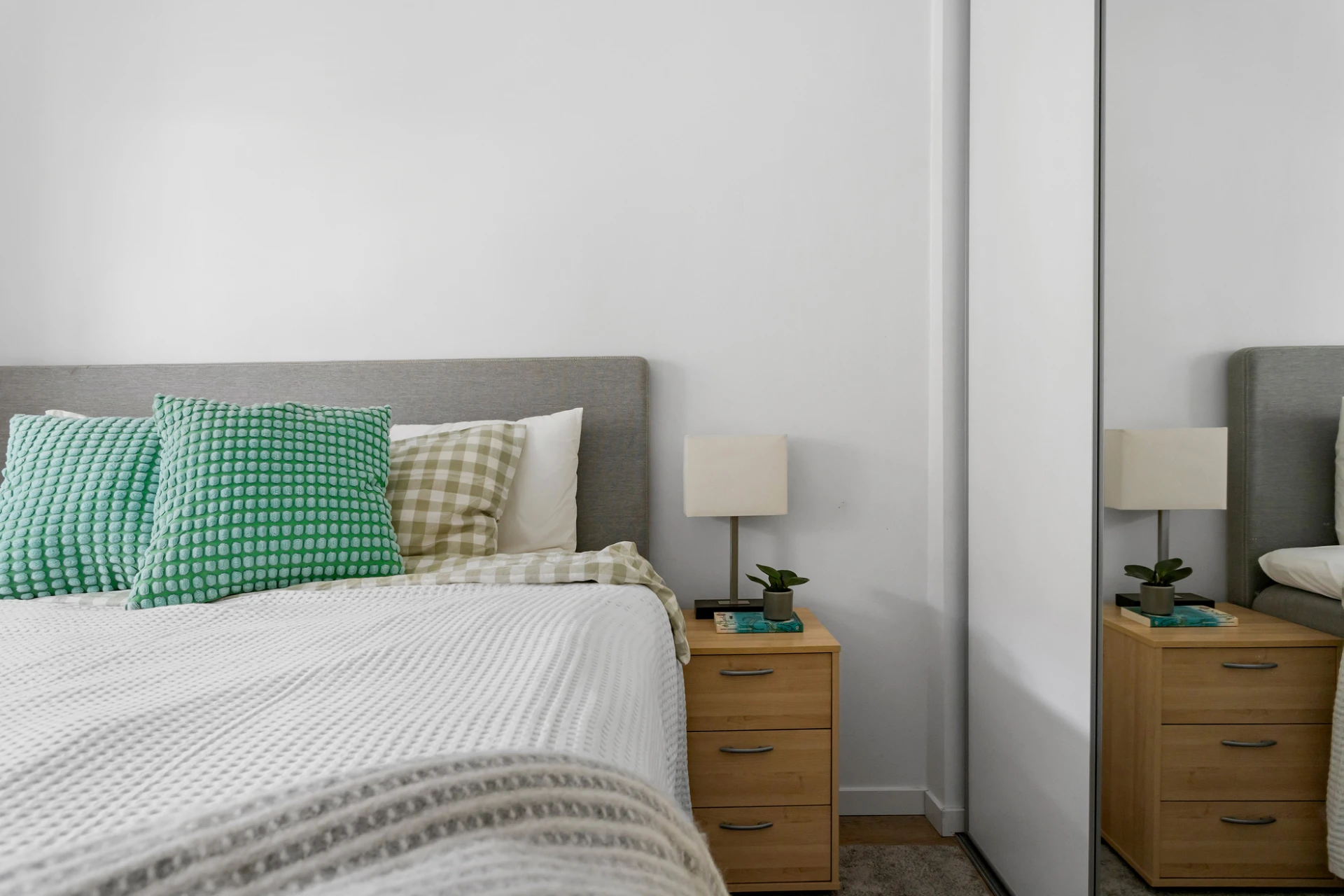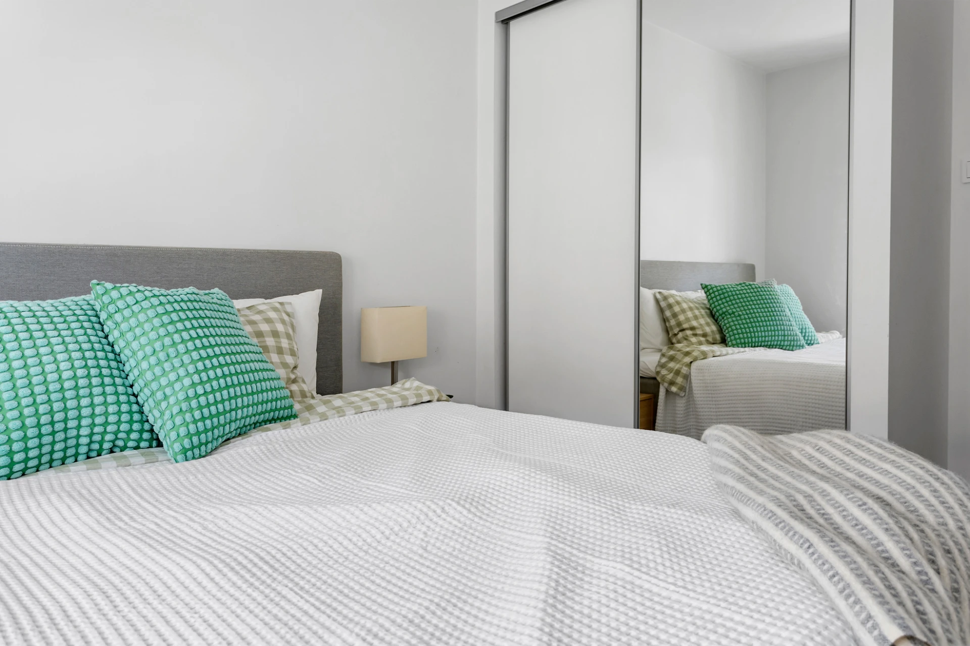 Laminatgolv och vita väggar. Förvaring i inbyggd skjutdörrsgarderob.