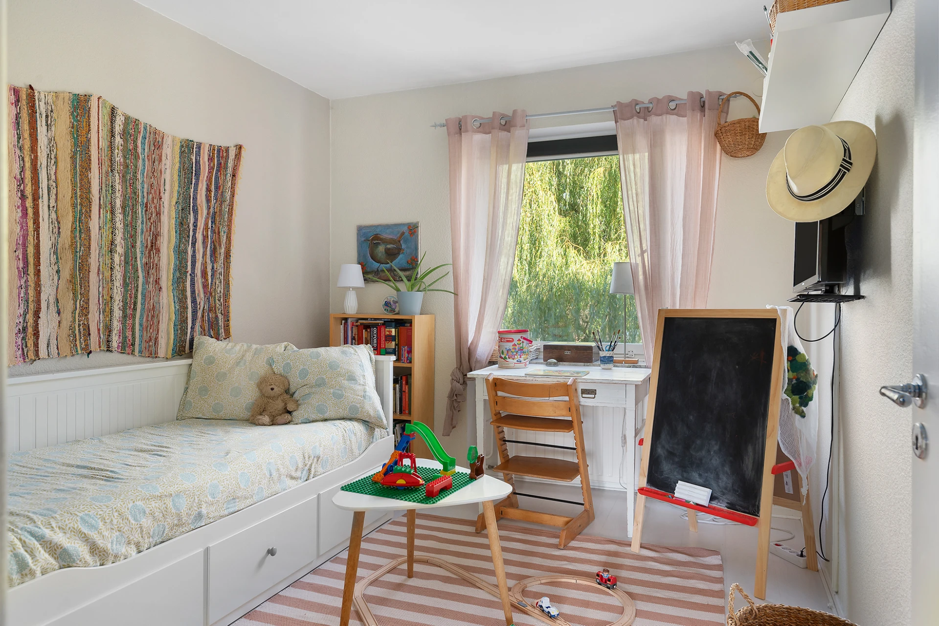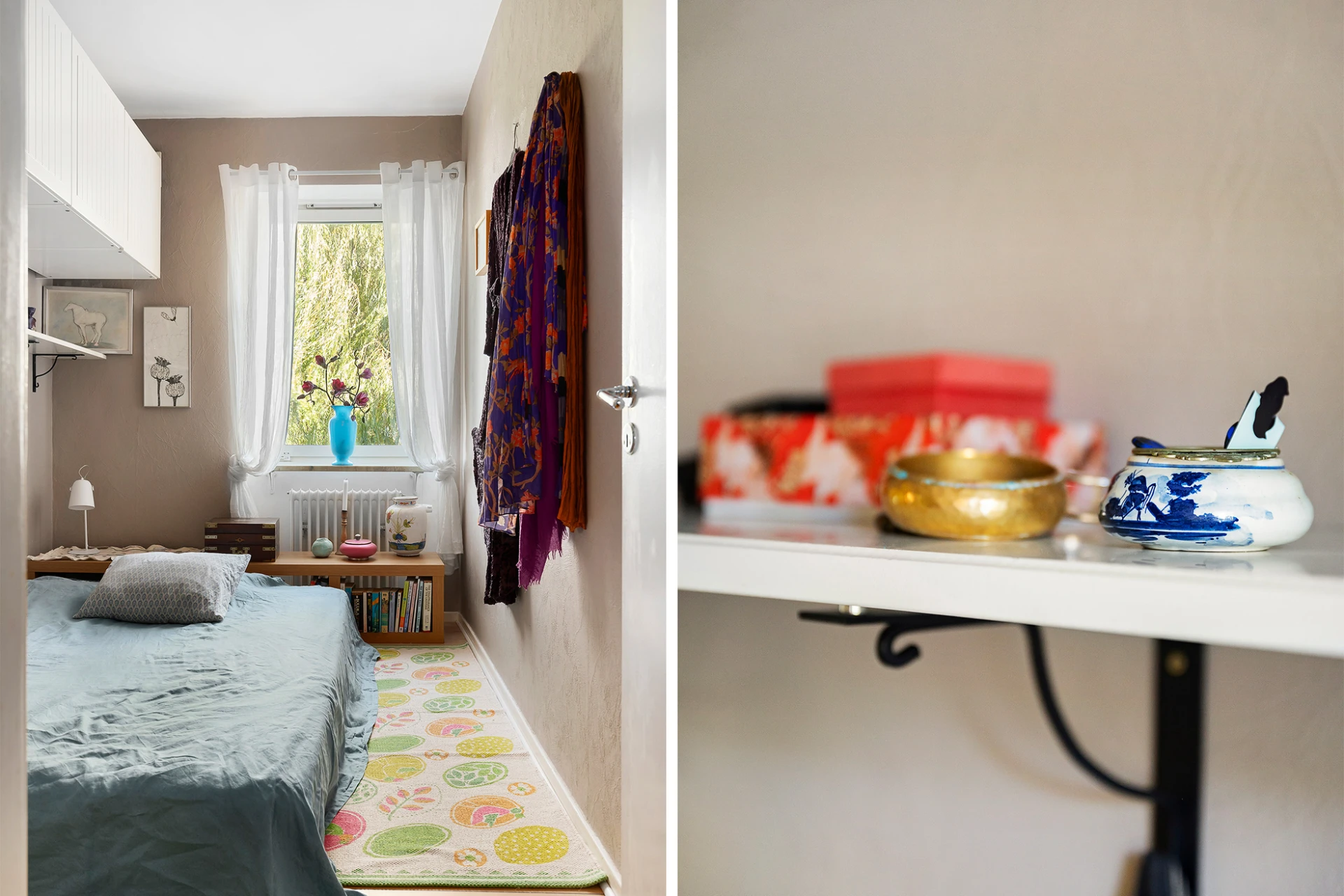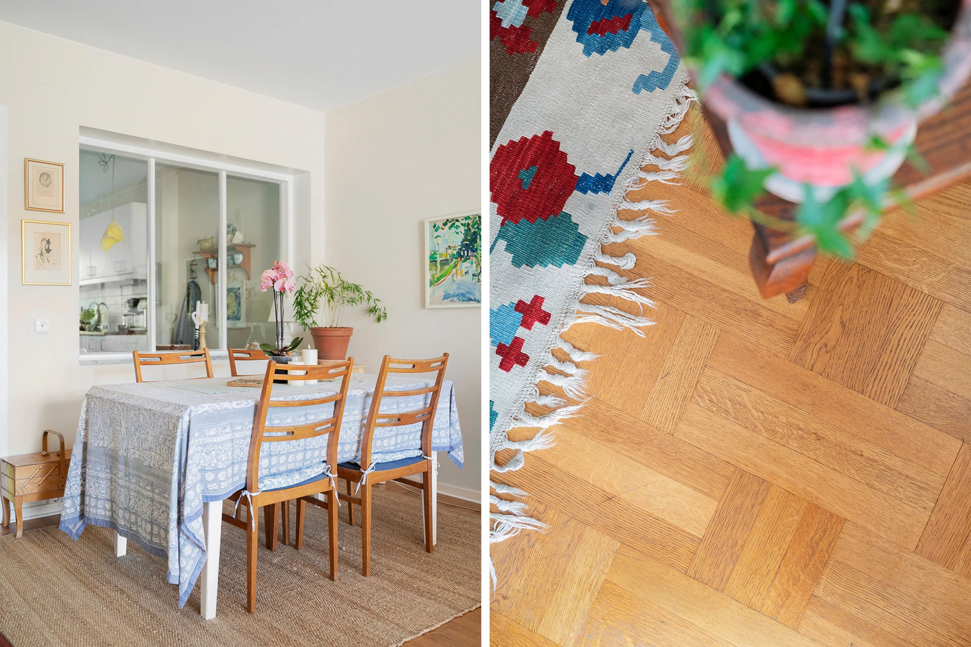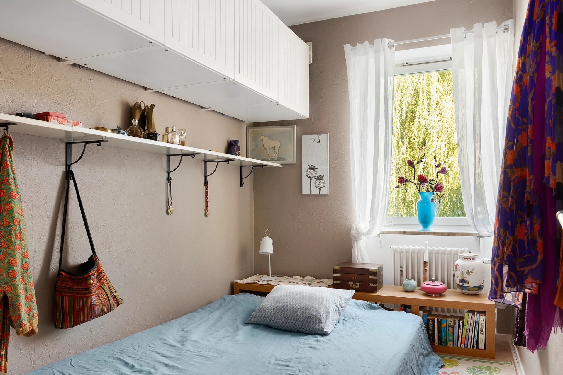 Originalgolv och cremevita väggar. Från rummet nås den inglasade balkongen i söderläge.