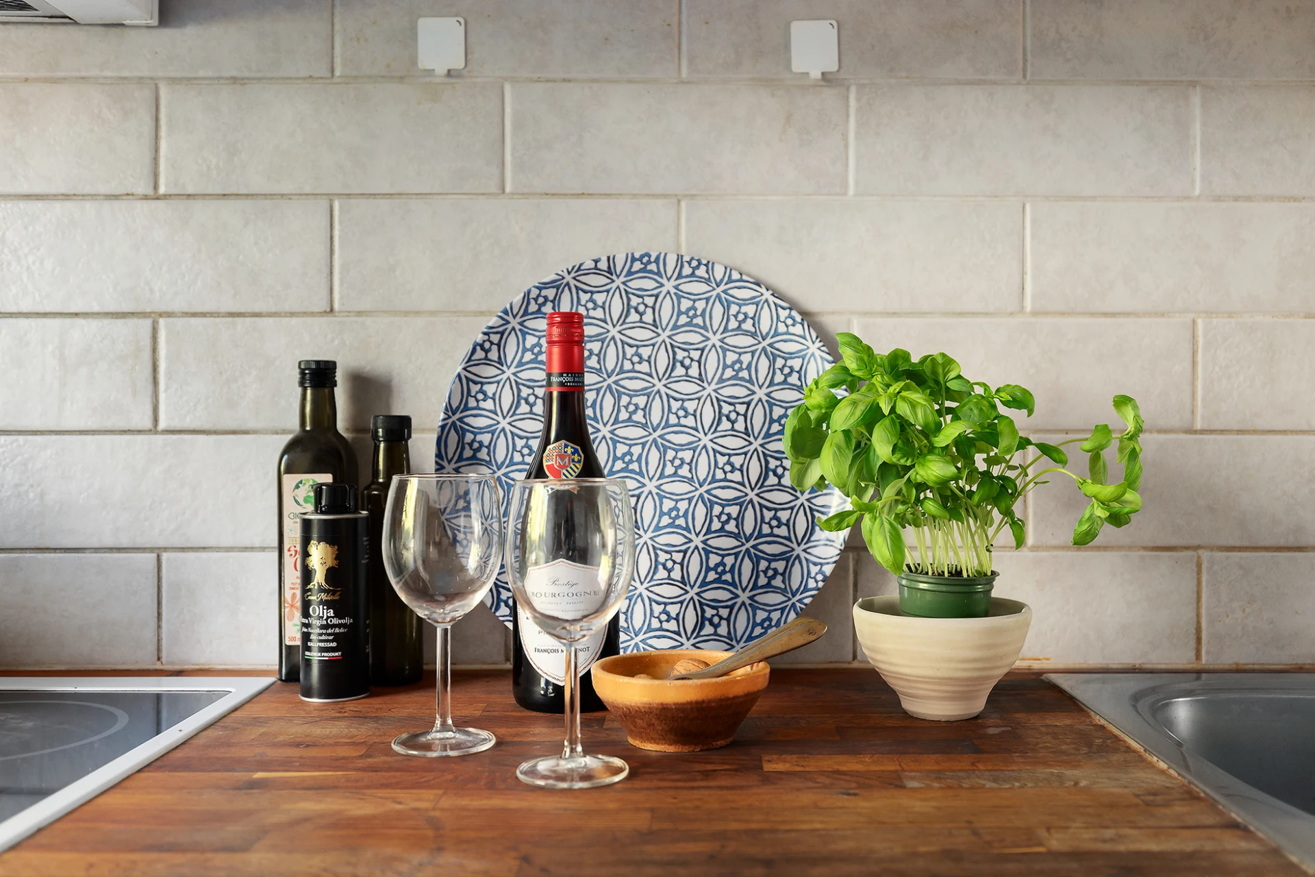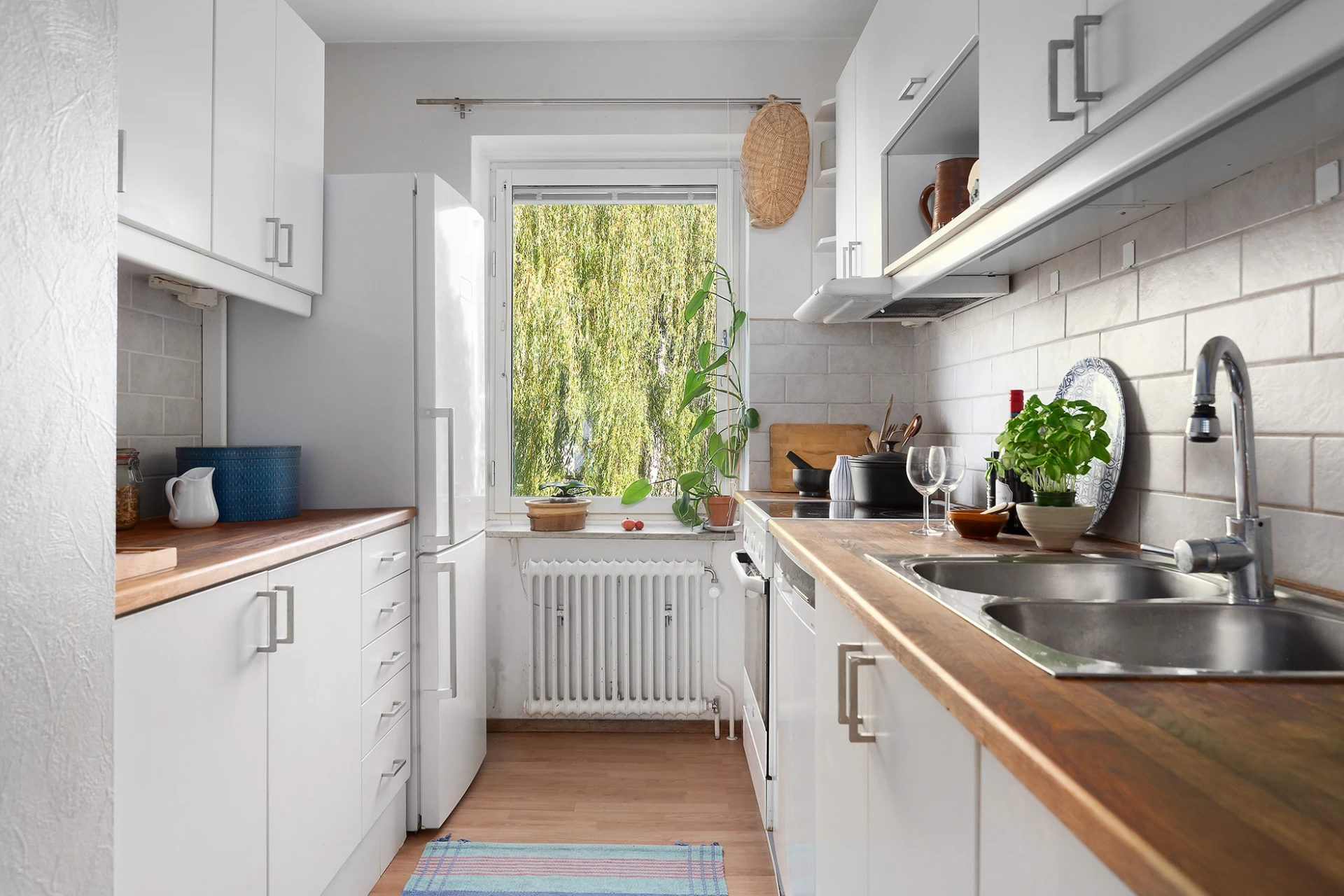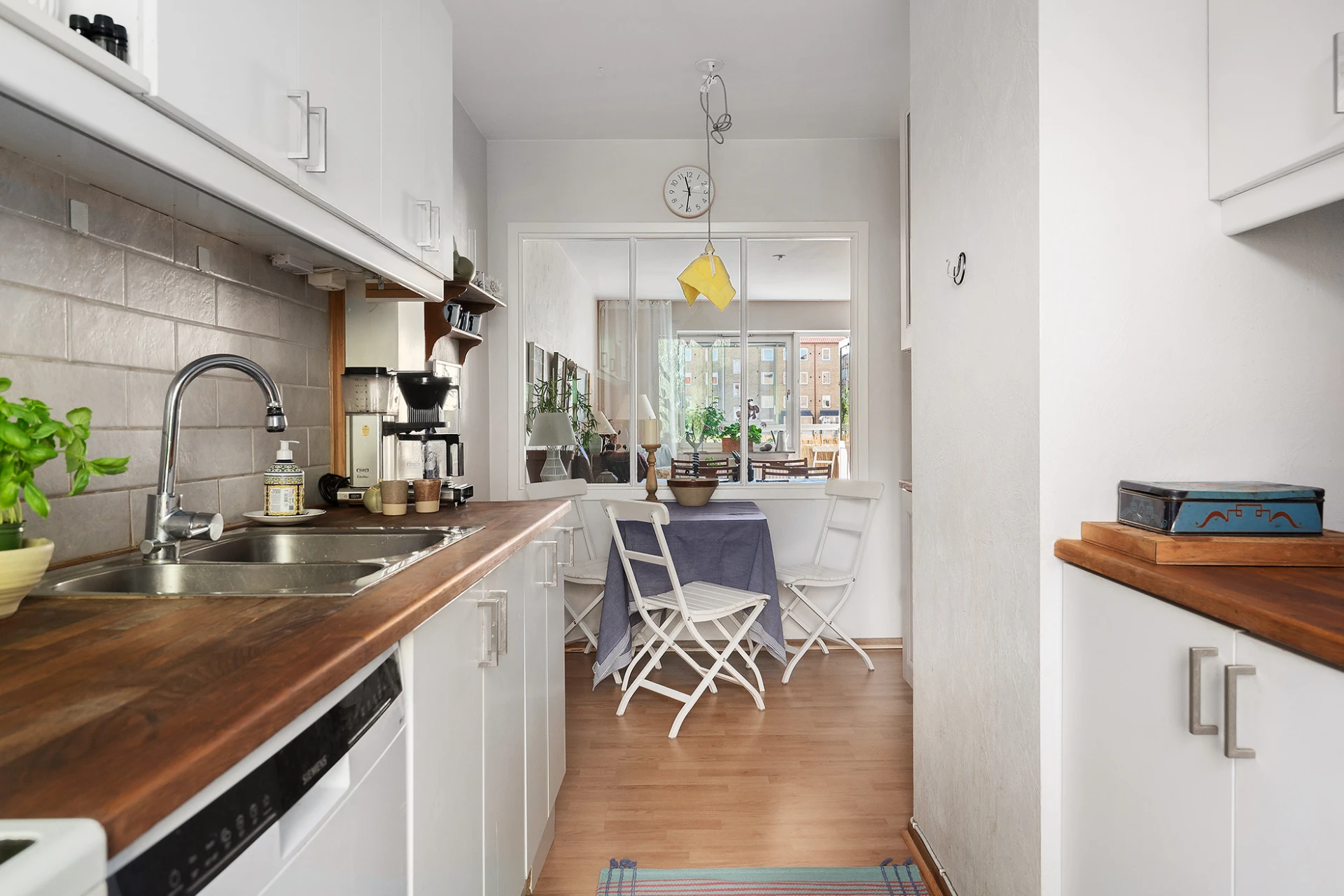 Laminatgolv och ljusmålade väggar. Köksinredning i vitt med vitt kakel ovan bänkskivan i trä. Utrustat med kyl/frys, mikrovågsugn, diskmaskin, induktionshäll, varmluftsugn och fläkt.