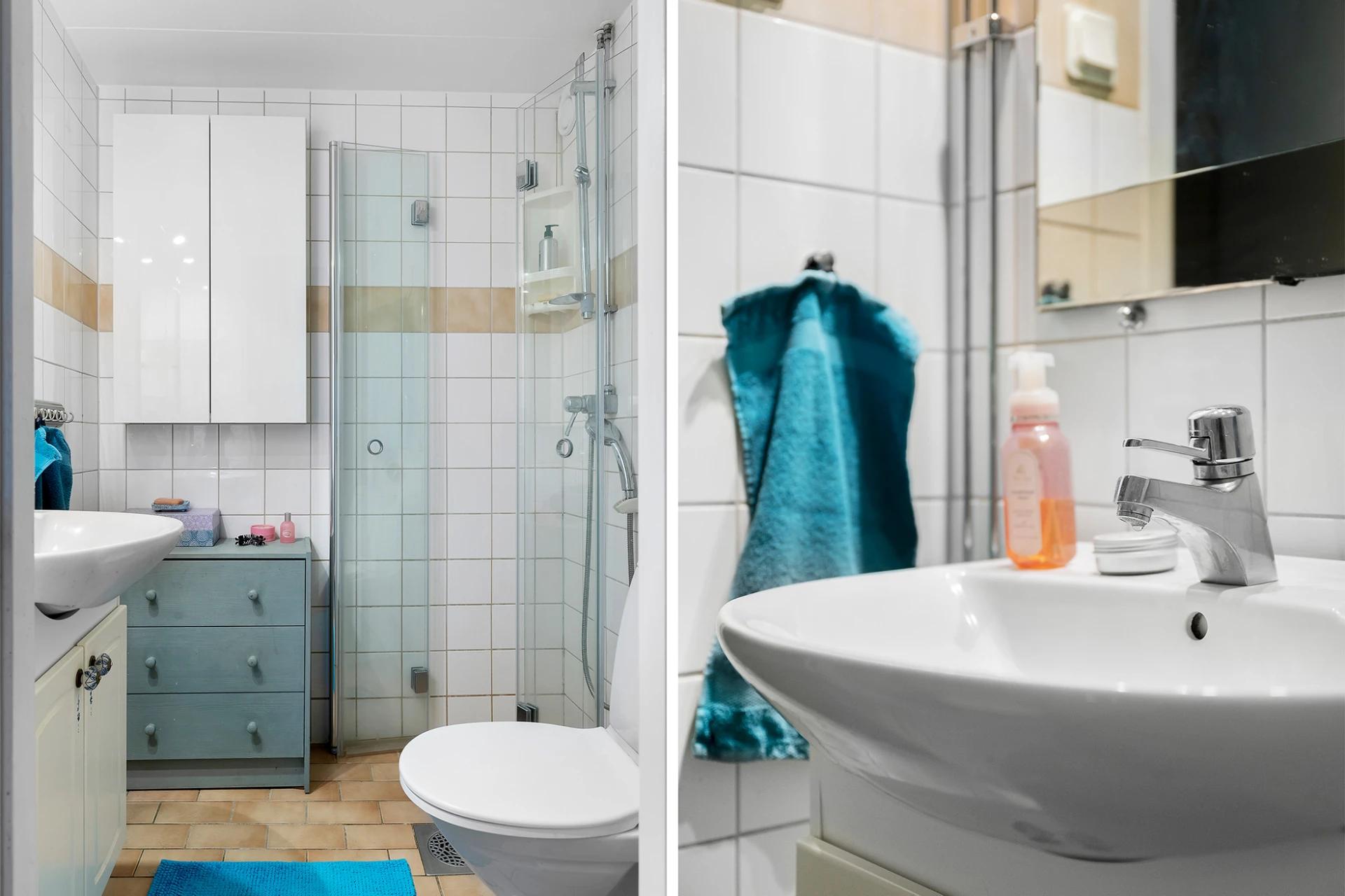 Beige klinker och vitt kakel. Badrummet är utrustat med WC, dusch, handfat med kommod, vägghängt förvaringsskåp och spegel.