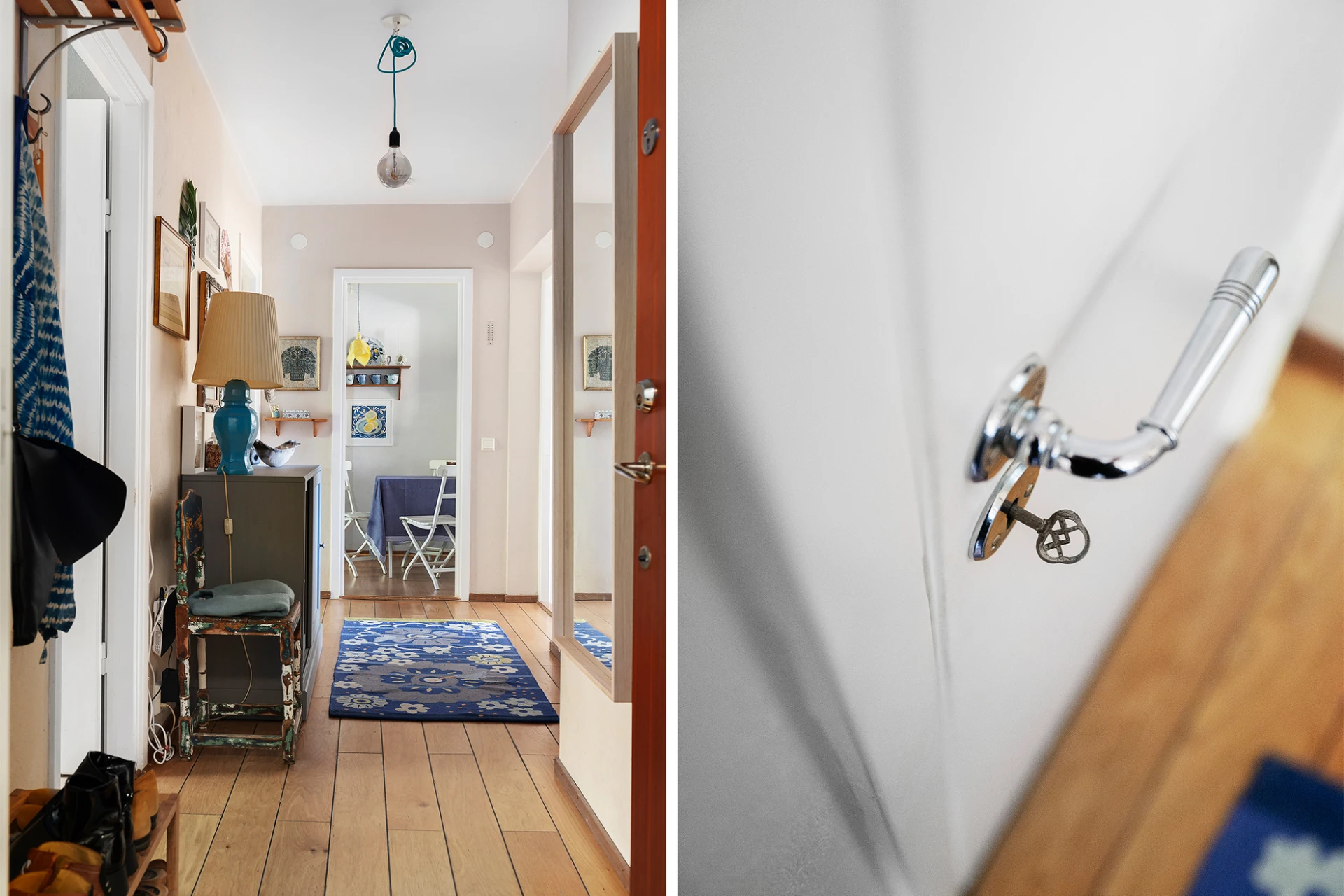 Skeppsgolv och cremevita väggar. Säkerhetsdörr och plats för avhängning och förvaring i klädkammare.