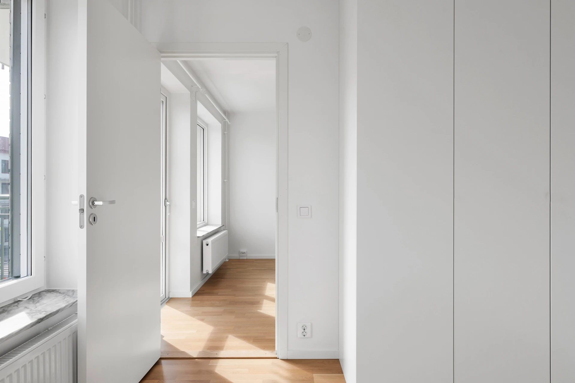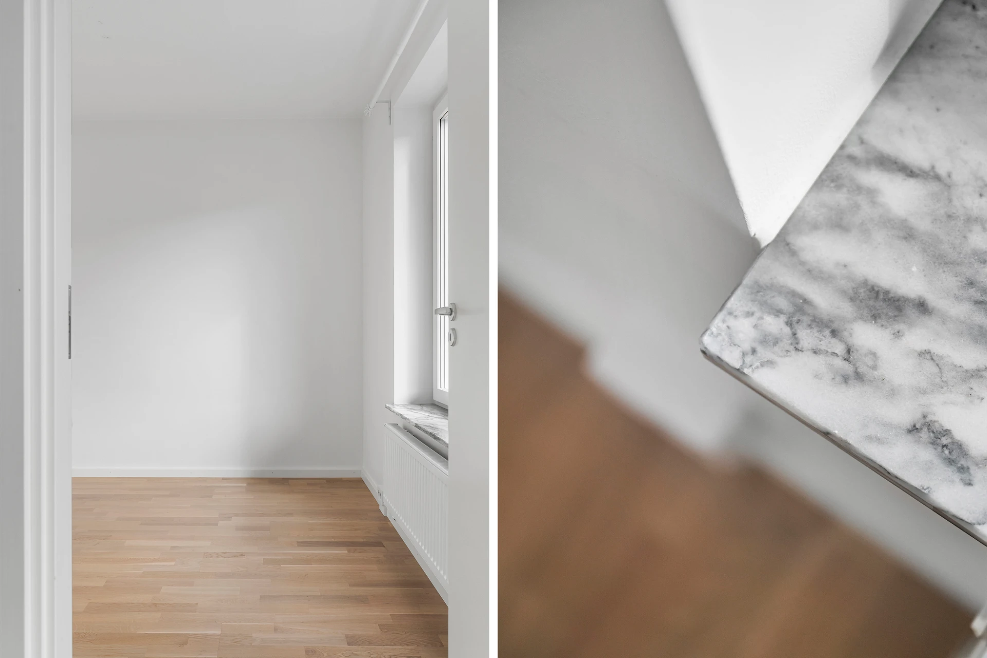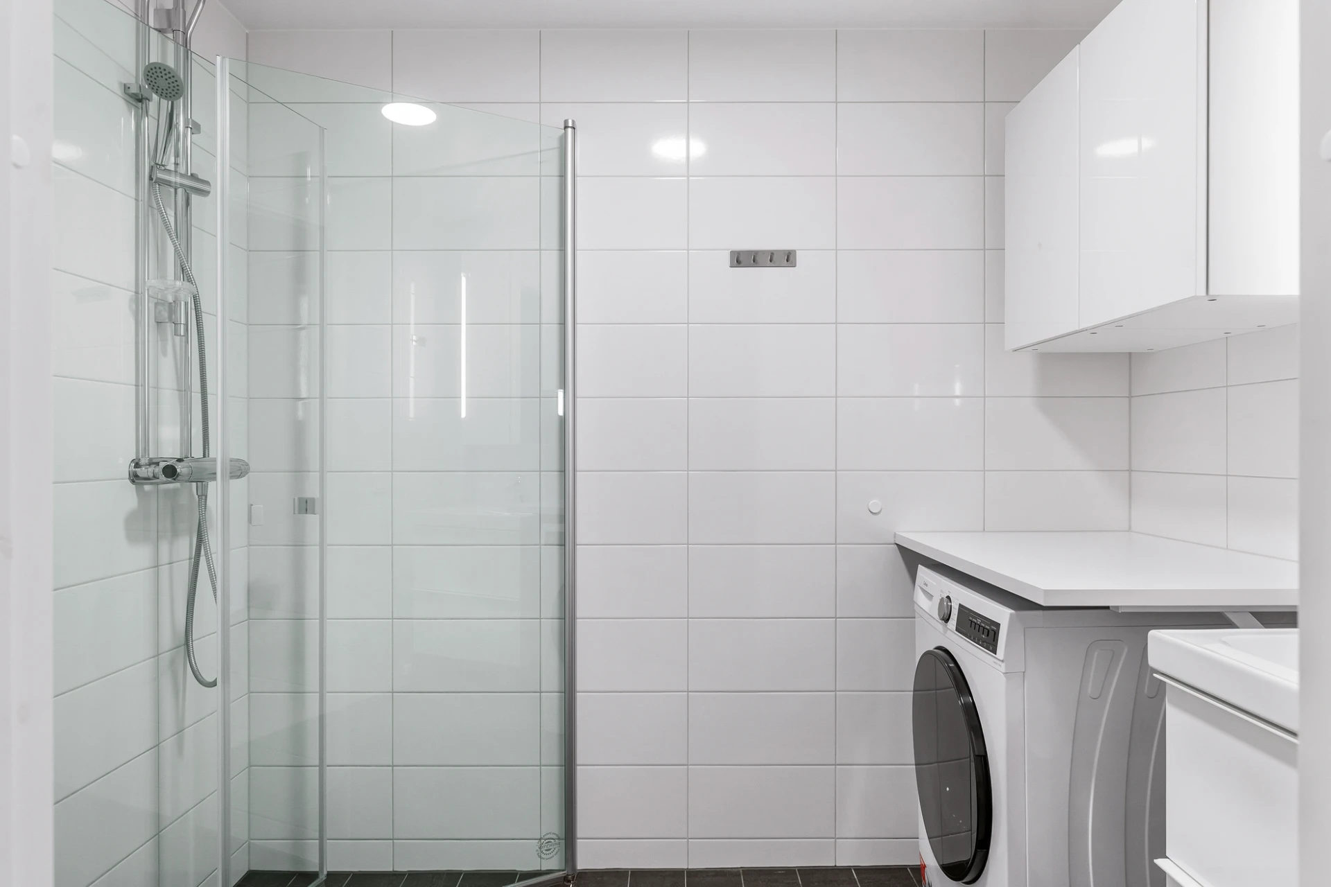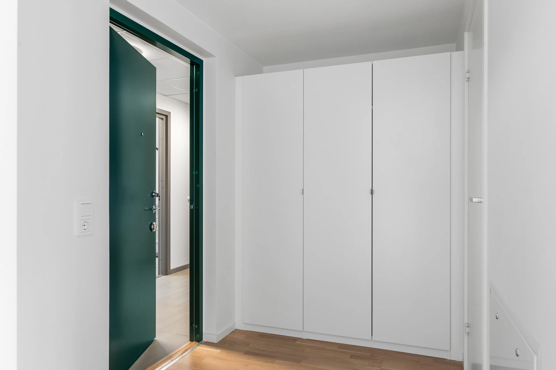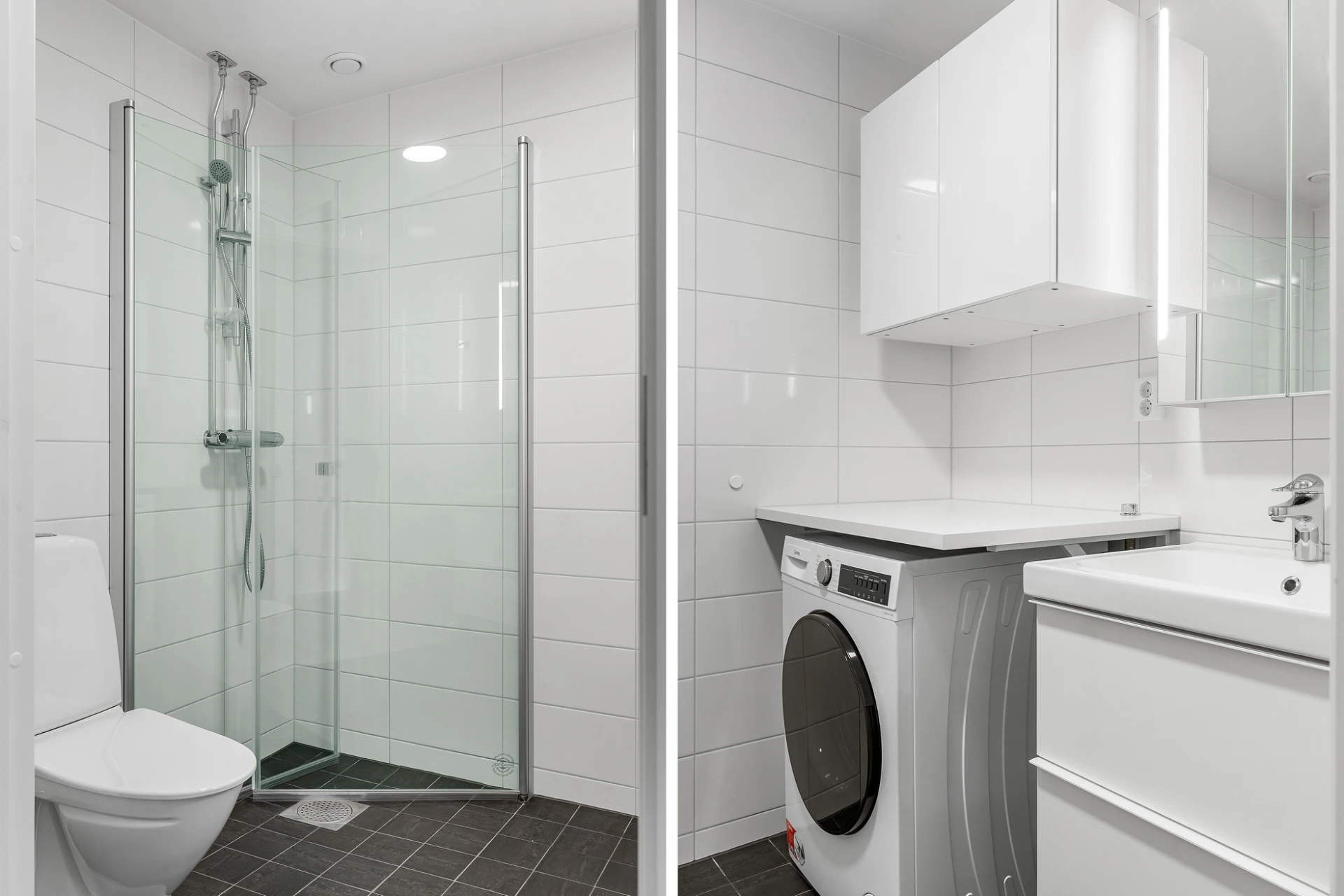 Interiören präglas av ljusa ytskikt med vitmålade väggar och stilren trestavsparkett, vilket skapar en modern och inbjudande känsla. Lägenheten erbjuder gott om förvaring och smarta lösningar. Det helkaklade badrummet går i tidlösa färger och är fullt utrustat med dusch, wc, kommod med vask samt en kombinerad tvättmaskin och torktumlare.