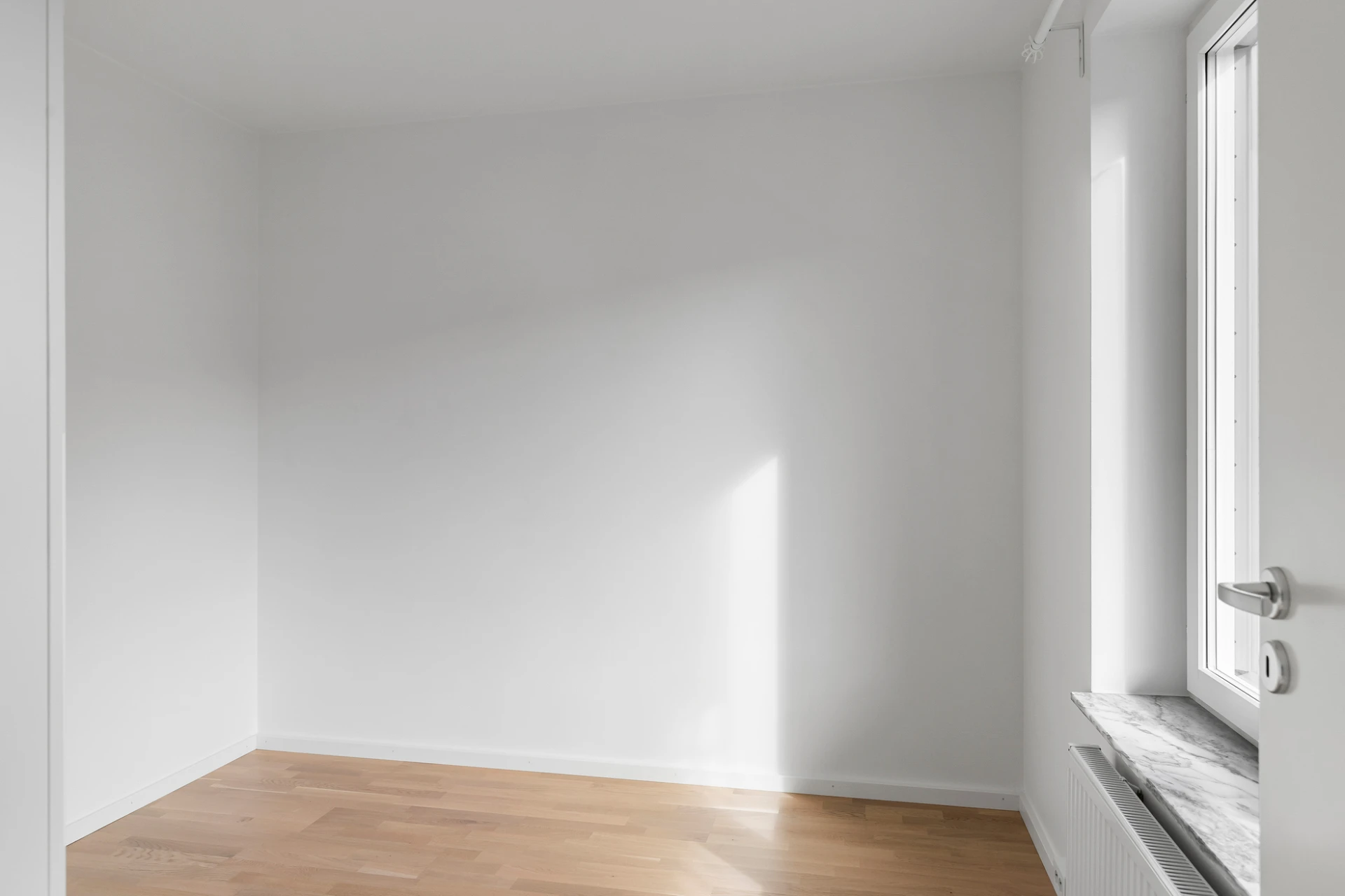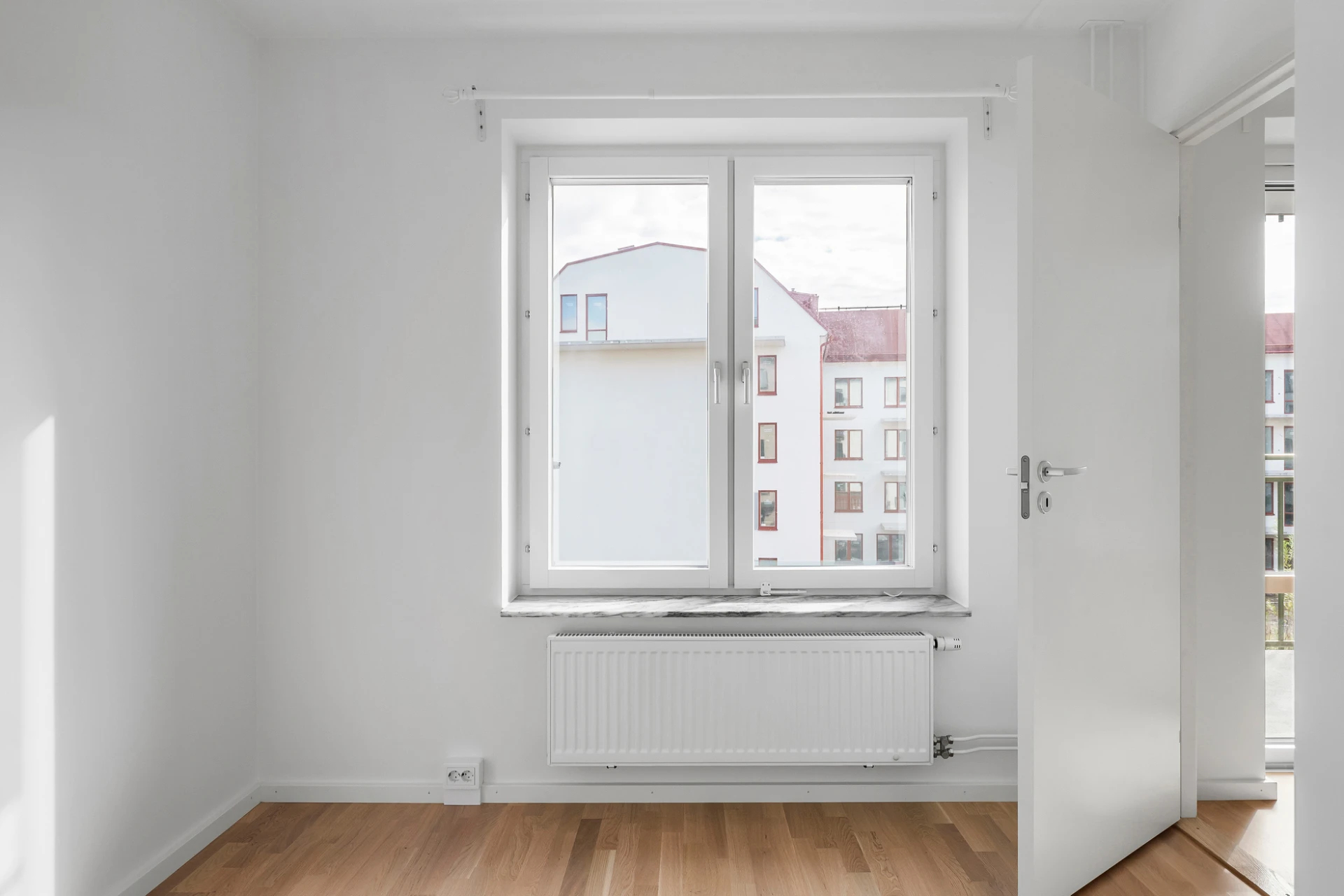 Rofyllt sovrum med vita väggar och trestavsparkett. Här finns gott om förvaring samt plats för en större säng. Rummet vetter mot den lugna innergården för en god natts sömn.