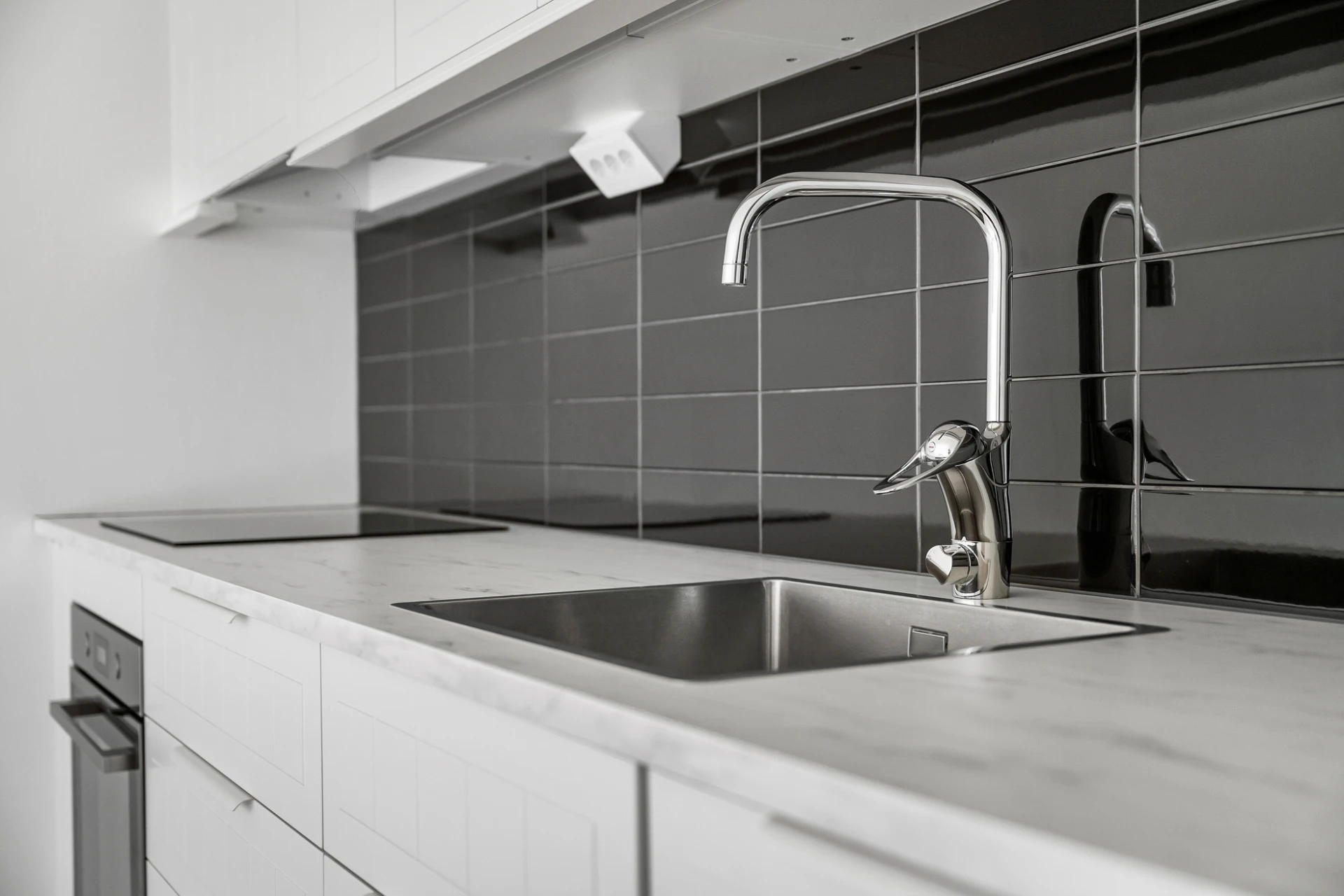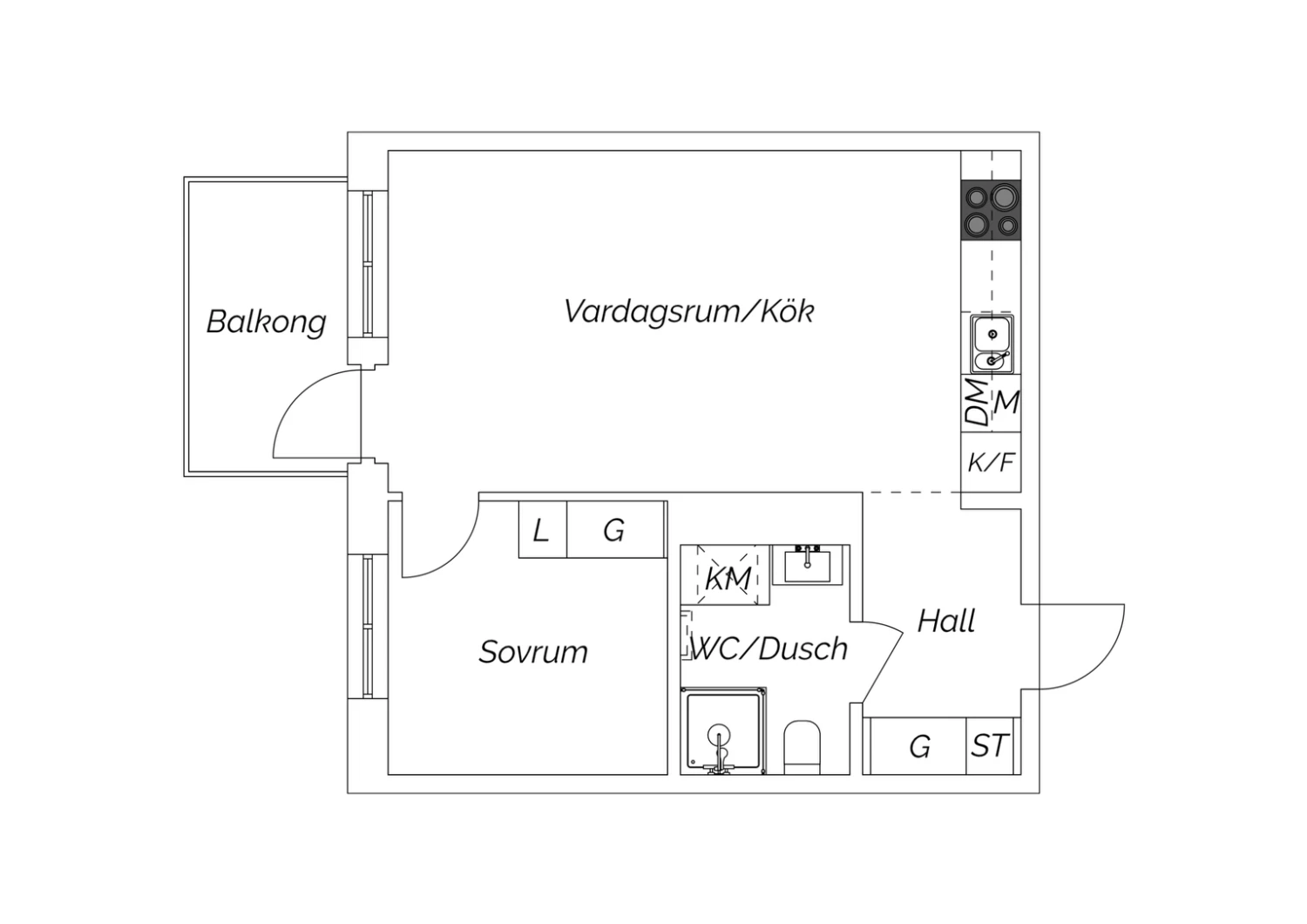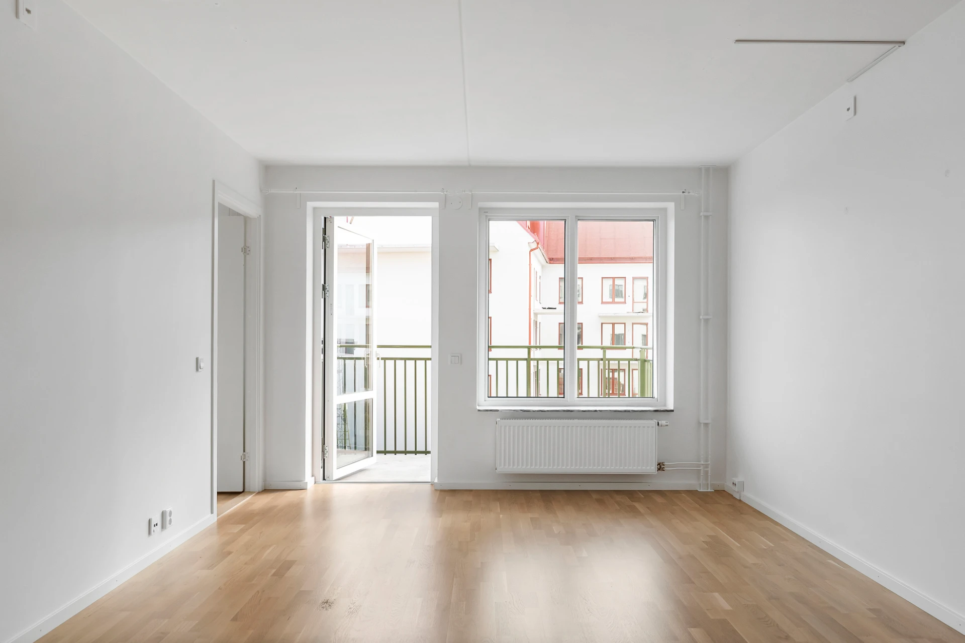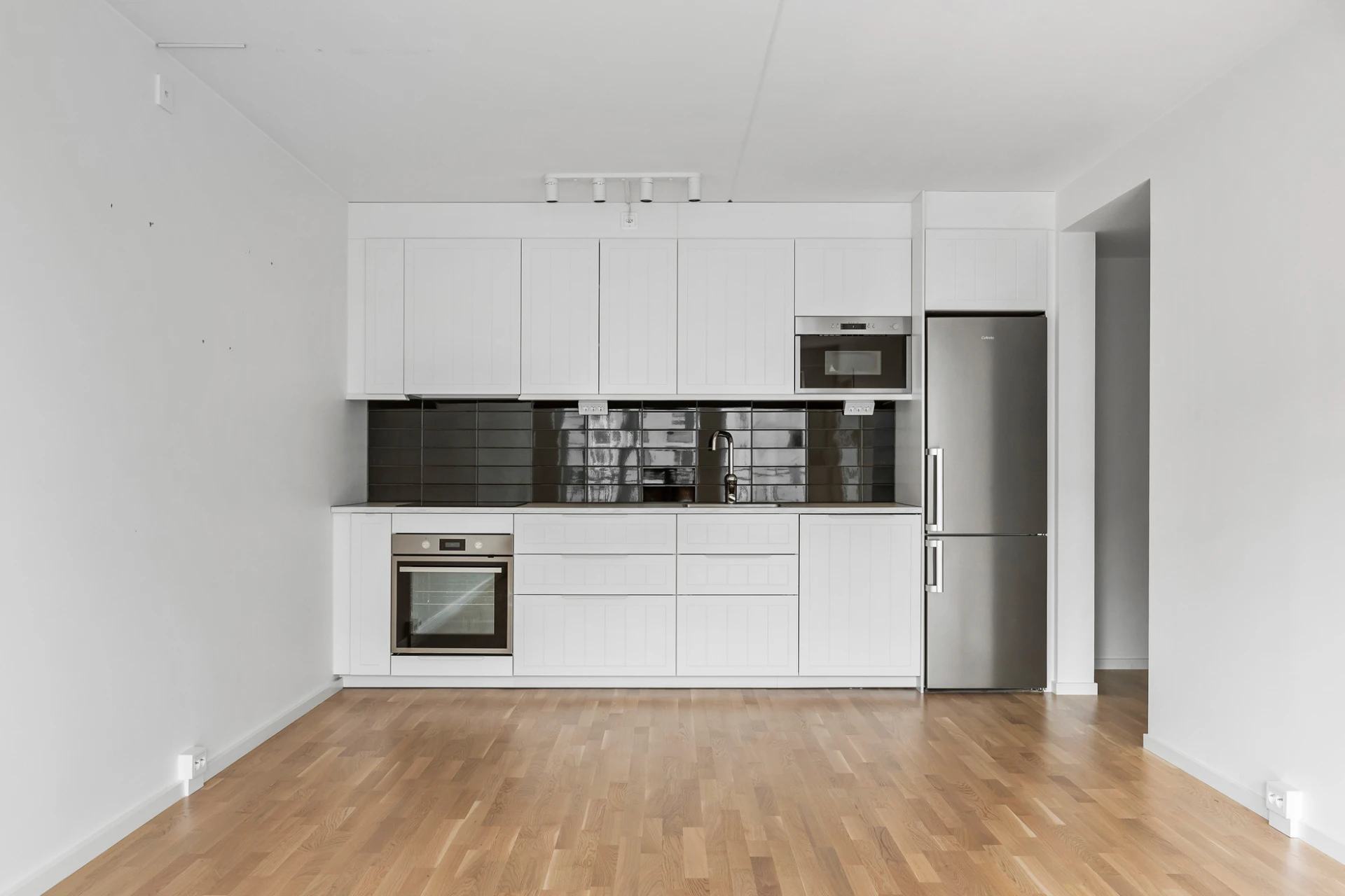 Ljust och luftigt vardagsrum i öppen planlösning mot köket. Köket är stilrent inrett med vita skåpsluckor, mörkt kakel och ljus bänkskiva. Utrustningen består av kyl/frys, diskmaskin, spishäll, ugn och fläkt. Rummet rymmer både matplats och soffhörna, med vitmålade väggar och trestavsparkett som ger ett enhetligt och modernt intryck. Från vardagsrummet når du bostadens soliga balkong som vetter mot en lugn innergård – perfekt för att njuta av solen från morgon till kväll.