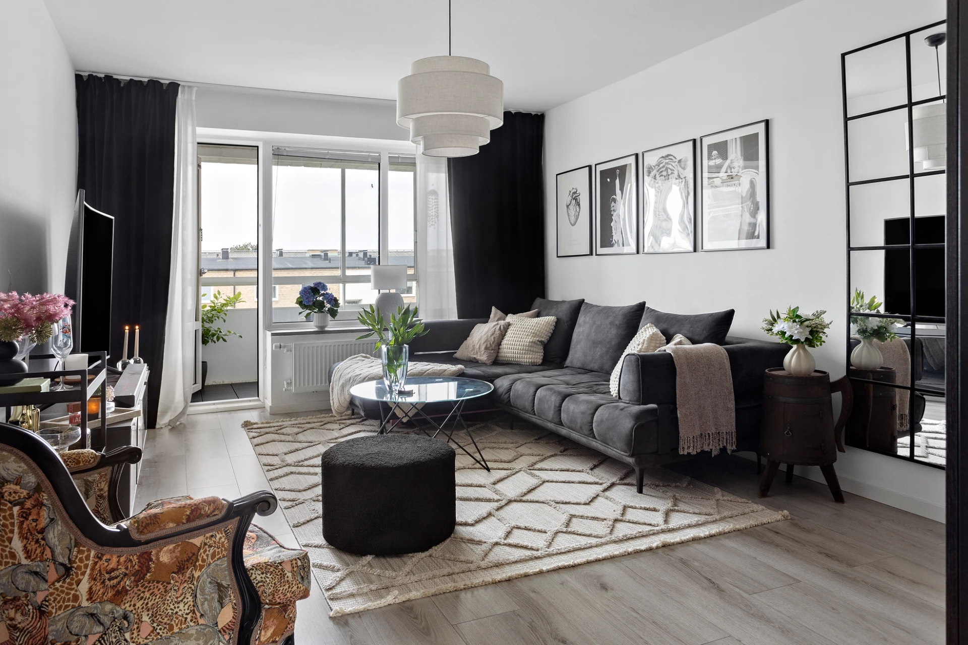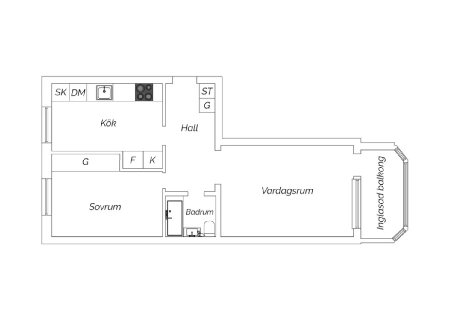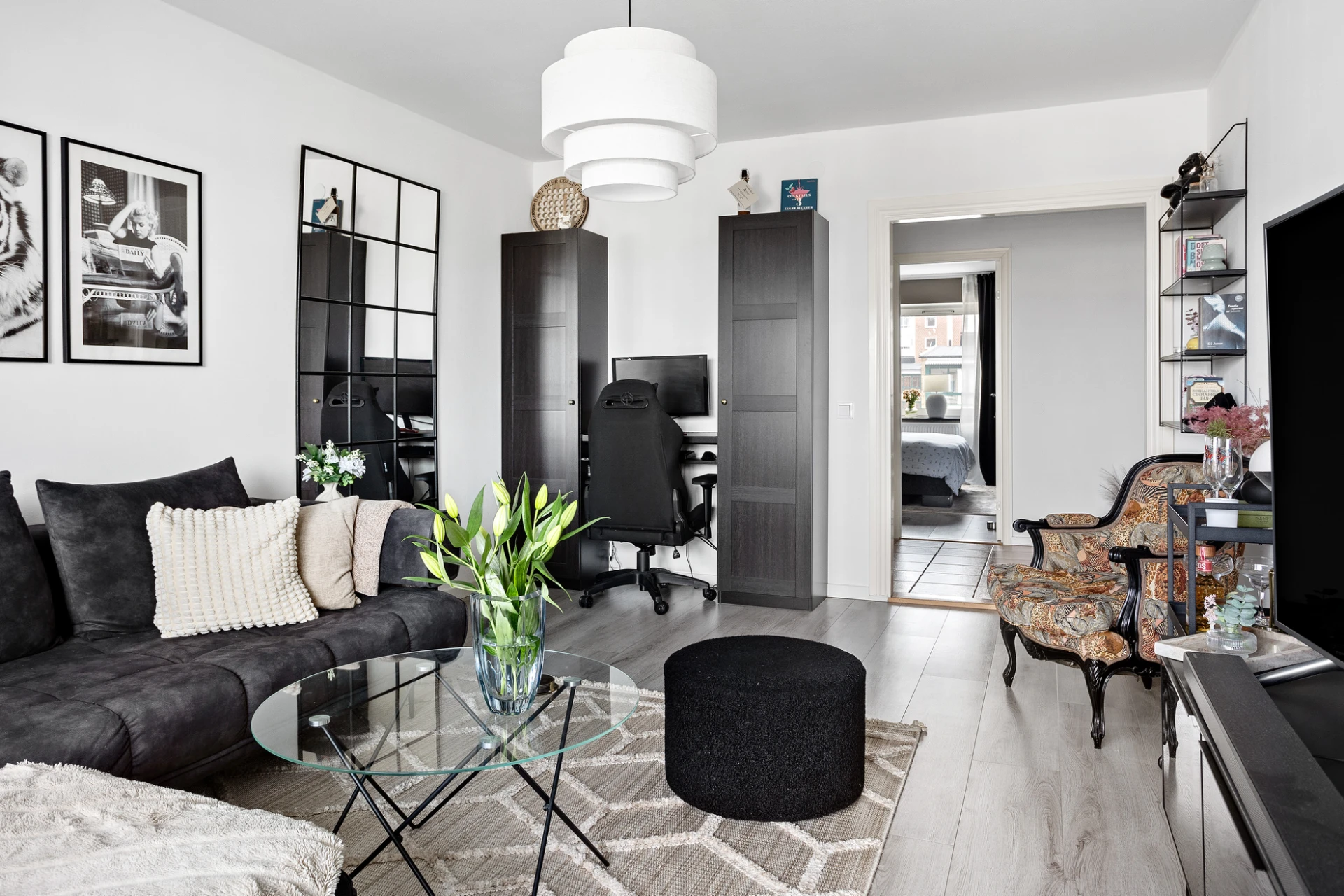 Bostadens genomgående planlösning ger ett fantastiskt ljusflöde och skapar öppna, luftiga ytor med en trivsam atmosfär. Här finns gott om plats att leva och växa. I köket ryms ett rejält matbord för både vardagsmiddagar och långa helgfrukostar, och vardagsrummet rymmer med lätthet både soffhörna och en arbetsplats för den som önskar. Sovrummet är rymligt och erbjuder förvaring i stilrena garderober – både praktiskt och snyggt.
