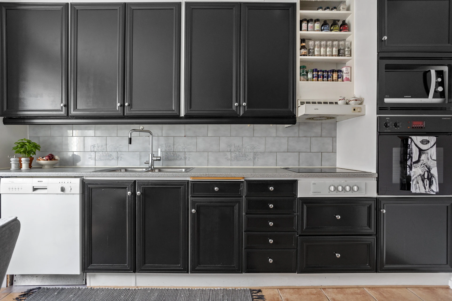 Klinkergolv och vita väggar. Svart köksinredning med grått kakel ovan den gråa arbetsbänken i laminat. Den maskinella utrustningen består av diskmaskin (Bosch), keramisk spishäll (AEG), fläkt (AEG), mikro (Samsung), integrerad ugn (AEG) samt kyl och frys (Samsung -2022). Plats för matbord.
