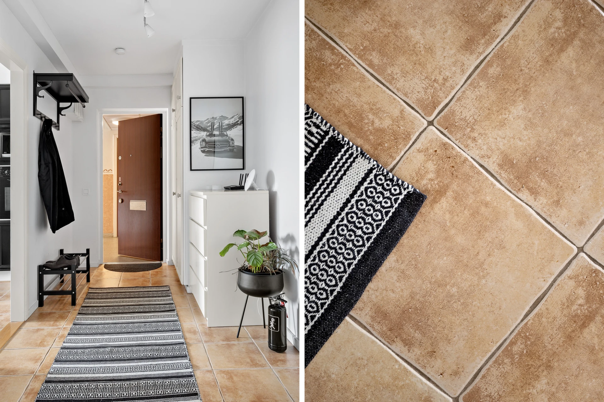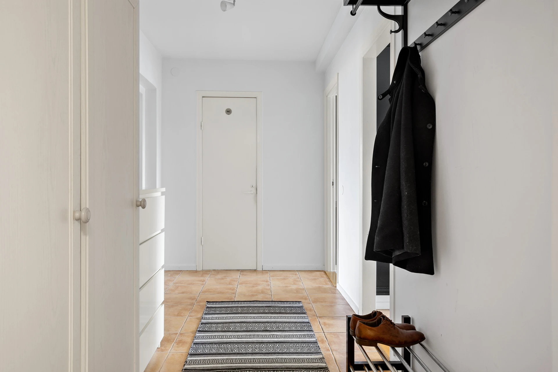 Klinkergolv och vitmålade väggar. Inbyggt städskåp och garderob med överskåp skänker plats till förvaring.