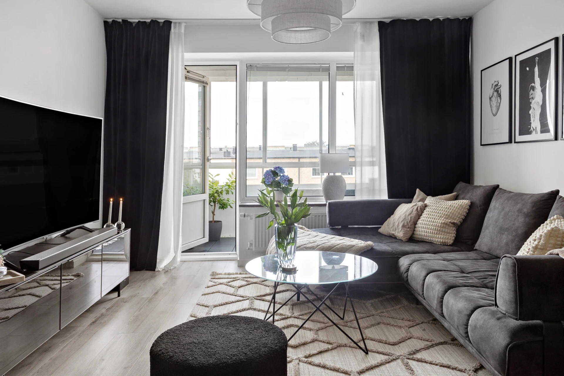 Ljusgrått laminatgolv och vita väggar. Plats för soffgrupp och övrigt möblemang. Från rummet nås utgång till en inglasad balkong i västerläge.