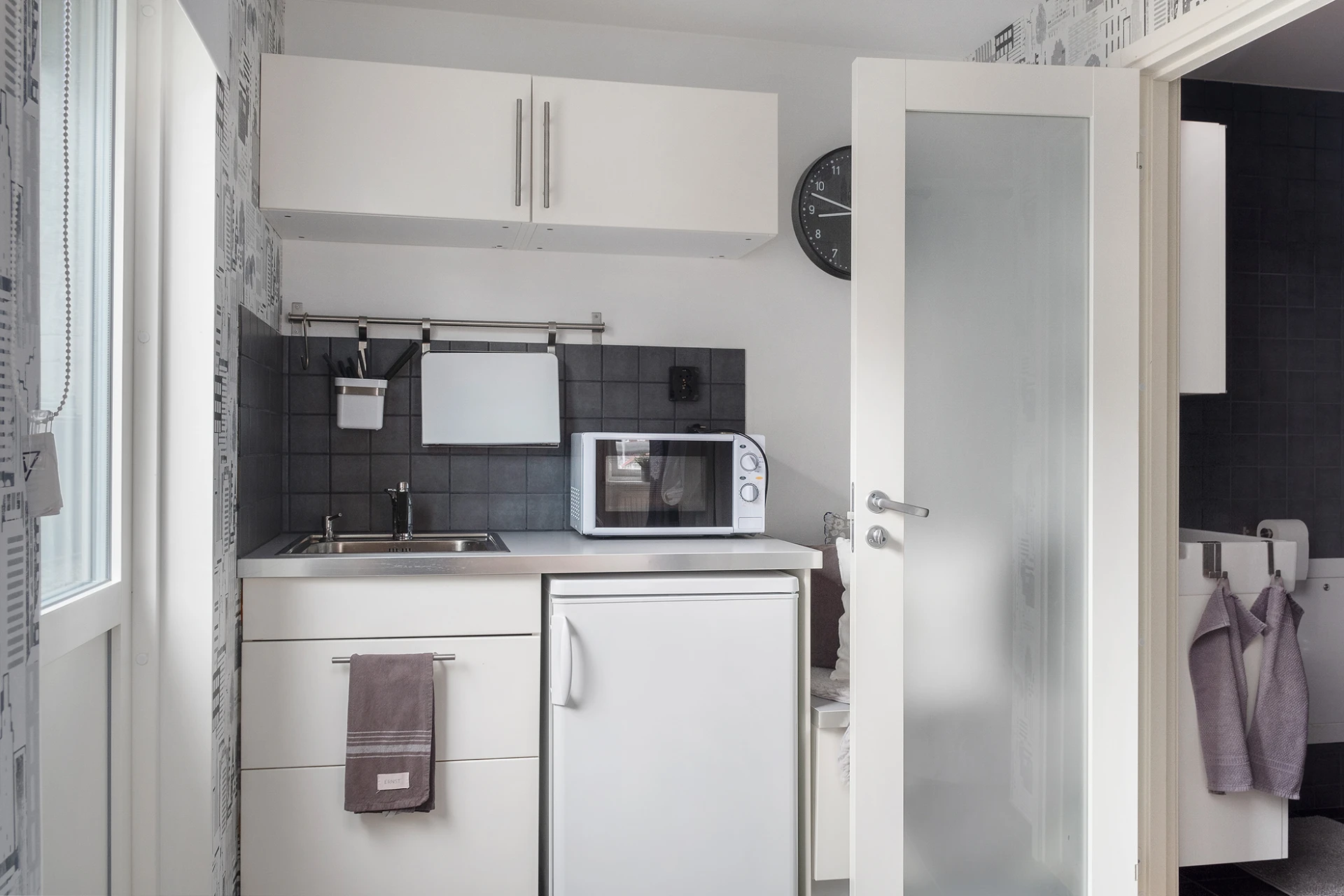 Trappa upp utifrån till balkong, entré, en halvtrappa upp, förråd, hall med garderober, helkaklat dusch/tvättrum, kök med trägolv och matplats med trägolv och kakelugn, allrum med trägolv och kakelugn, allrum/sovrum med trägolv.