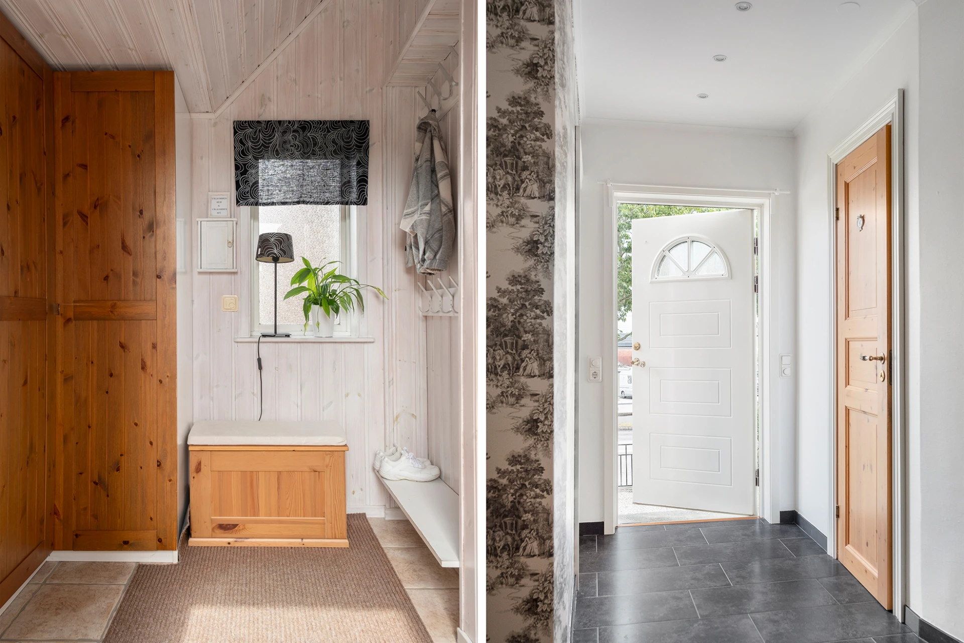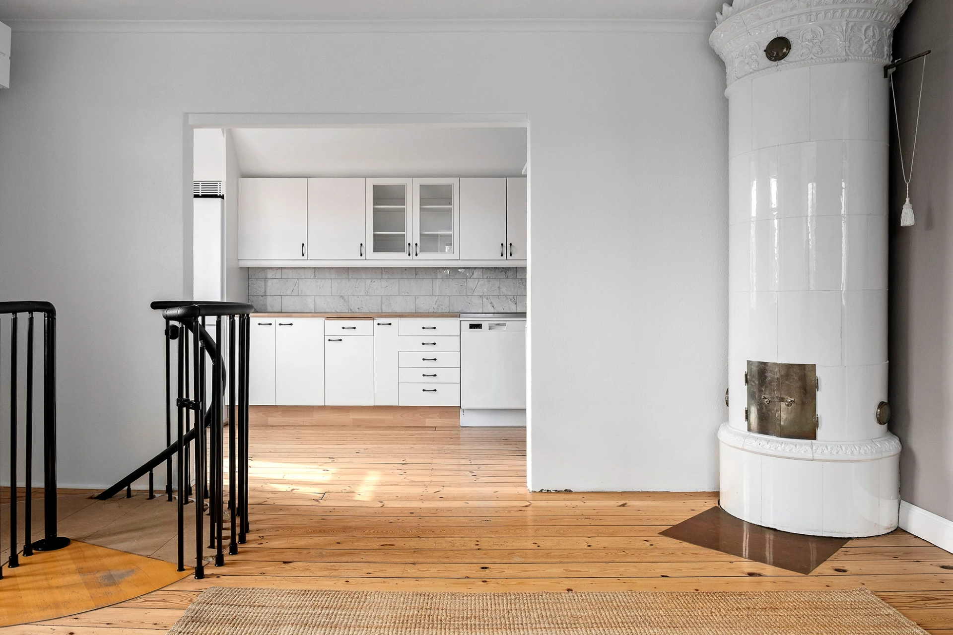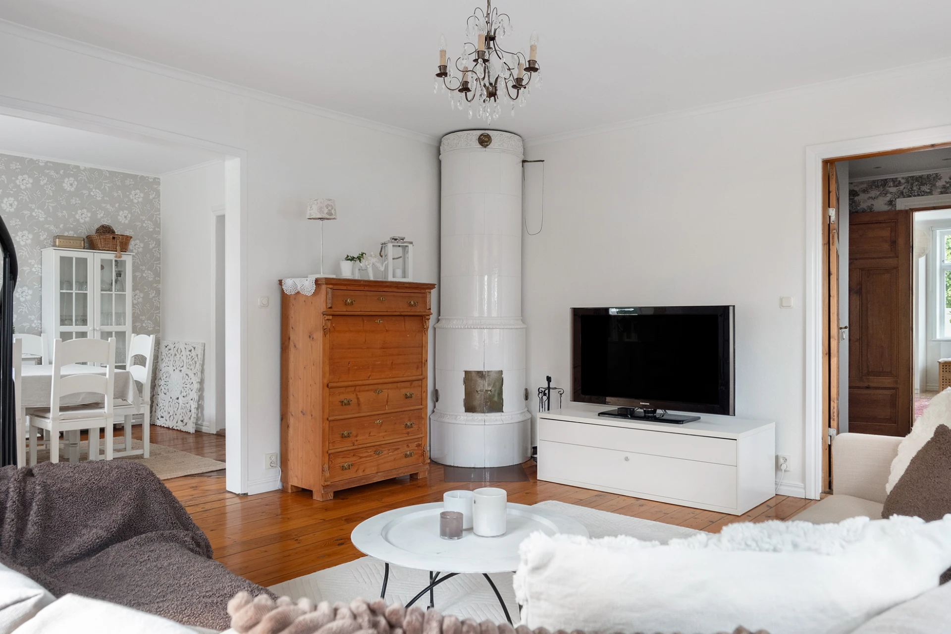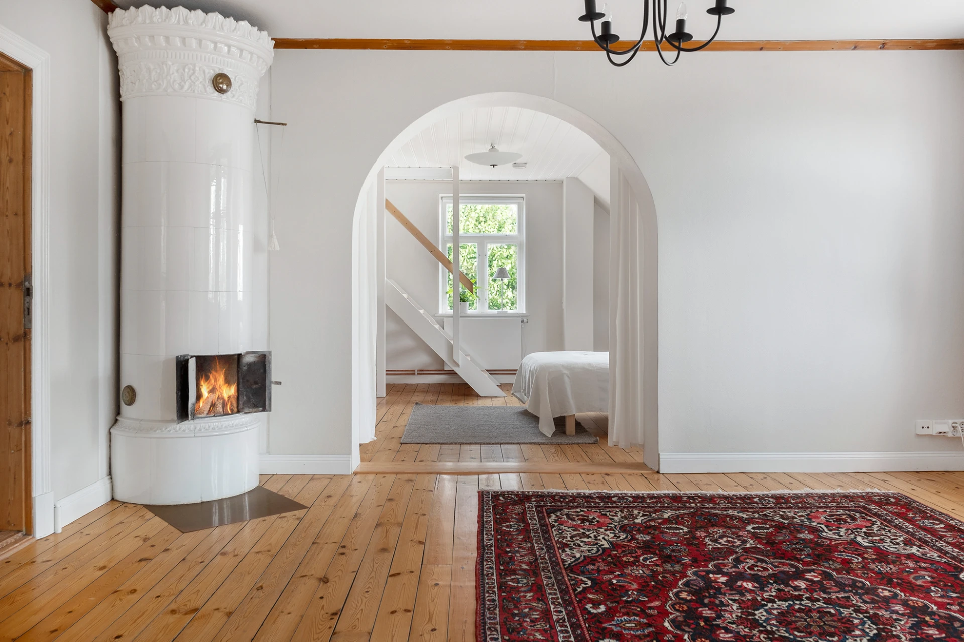 Entré - hall med golvvärme, kök med bra arbetsytor, sovrum med trägolv och kakelugn, vardagsrum - matrum i öppen planlösning med trägolv, kakelugn, takrosett, spiraltrappan upp är kvar med öppningen till ovanvåningen är stängd(lätt att öppna upp igen), finentré - hall med klinkergolv, duschrum, sovrum med trägolv och kakelugn, gästtoalett.