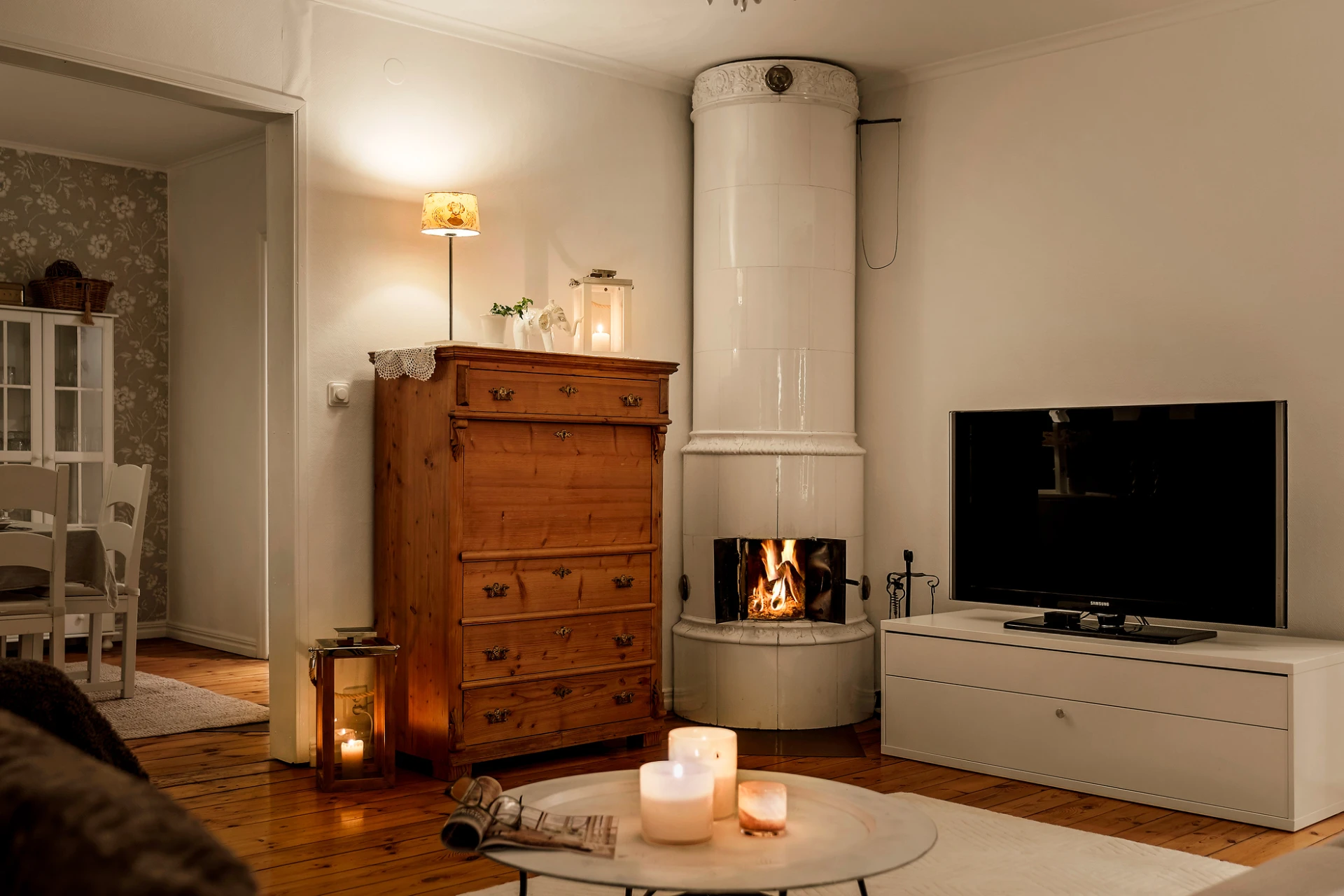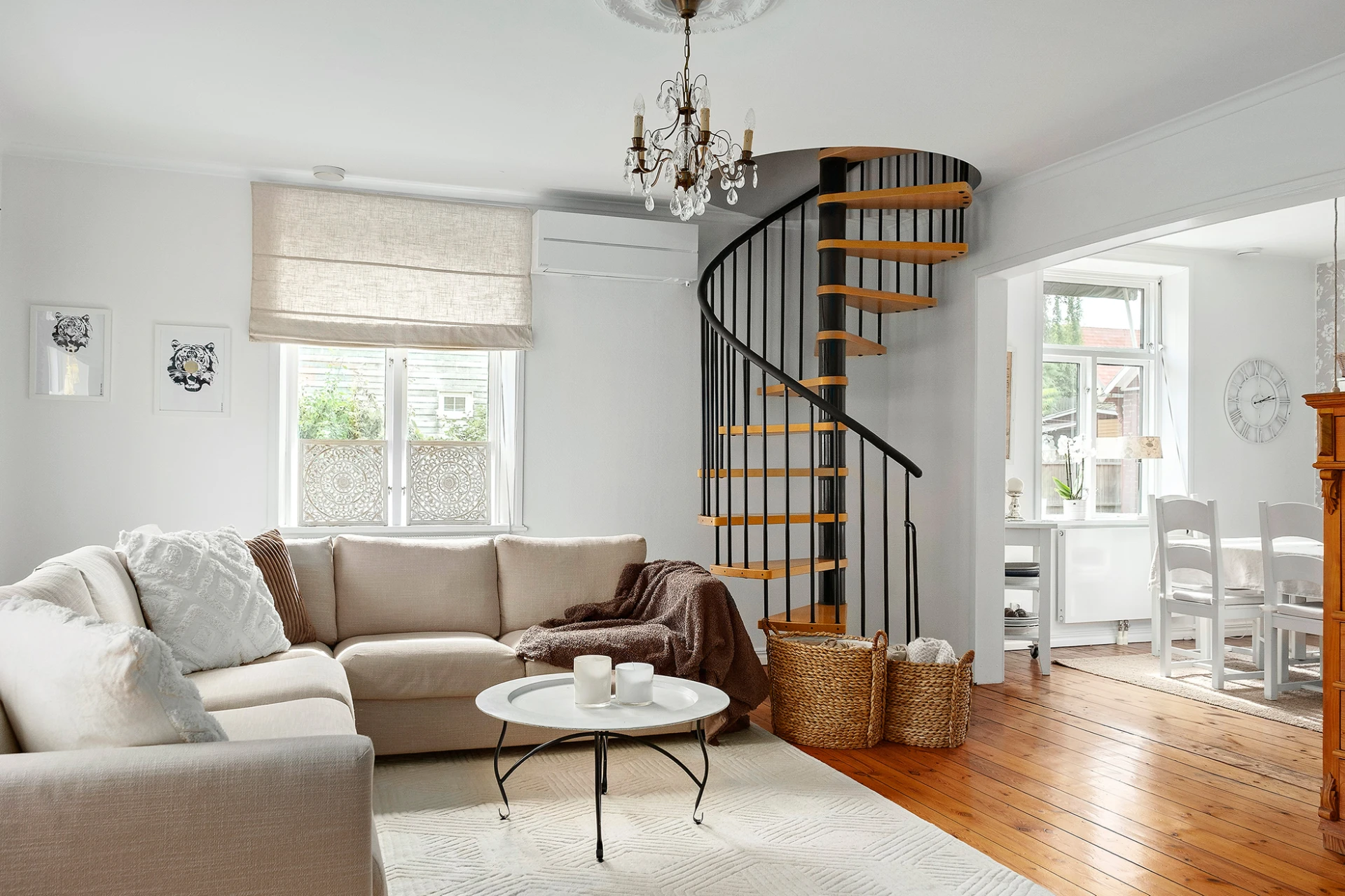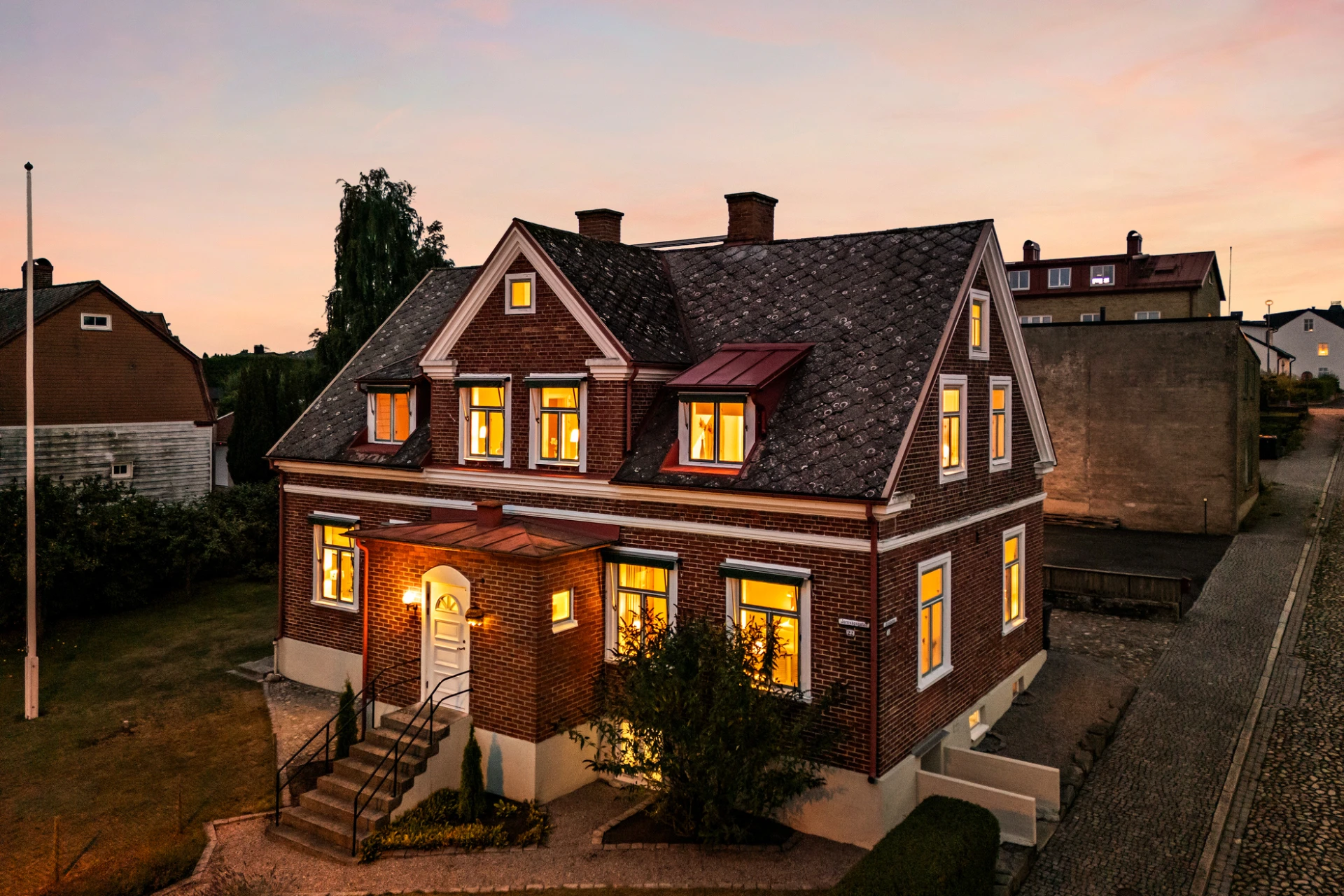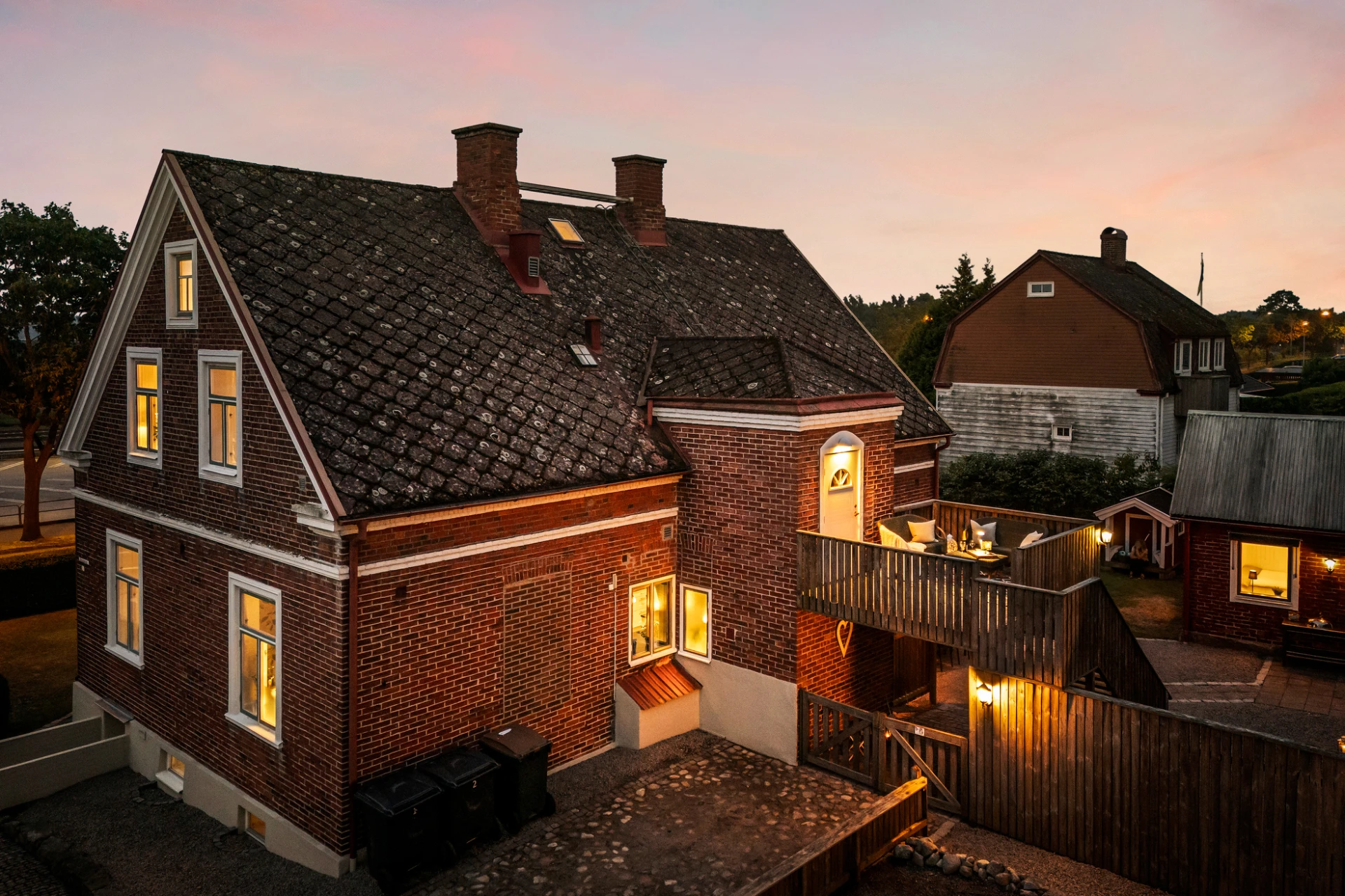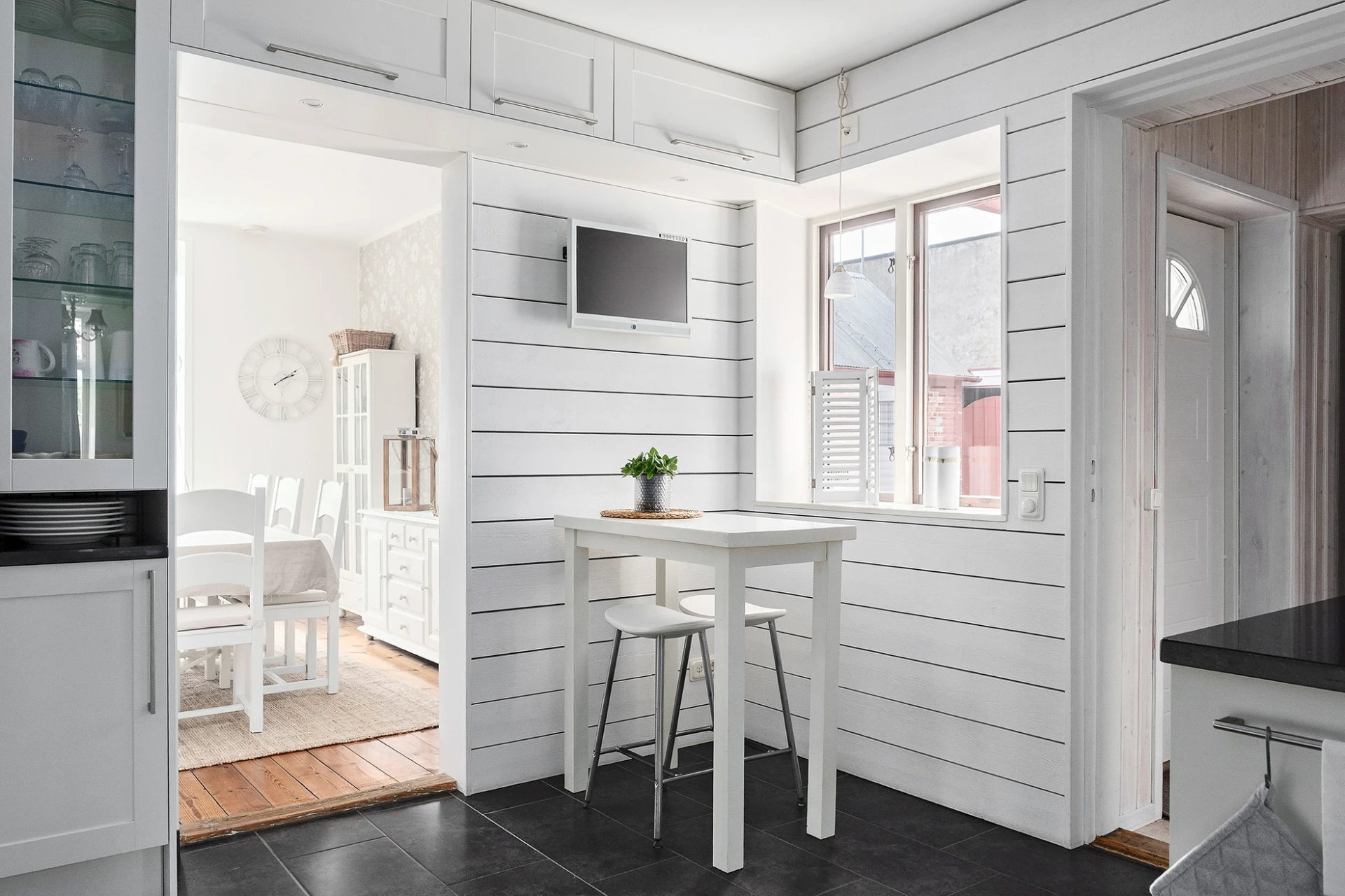 Entré - hall med golvvärme, kök med bra arbetsytor, sovrum med trägolv och kakelugn, vardagsrum - matrum i öppen planlösning med trägolv, kakelugn, takrosett, spiraltrappan upp är kvar med öppningen till ovanvåningen är stängd(lätt att öppna upp igen), finentré - hall med klinkergolv, duschrum, sovrum med trägolv och kakelugn, gästtoalett.