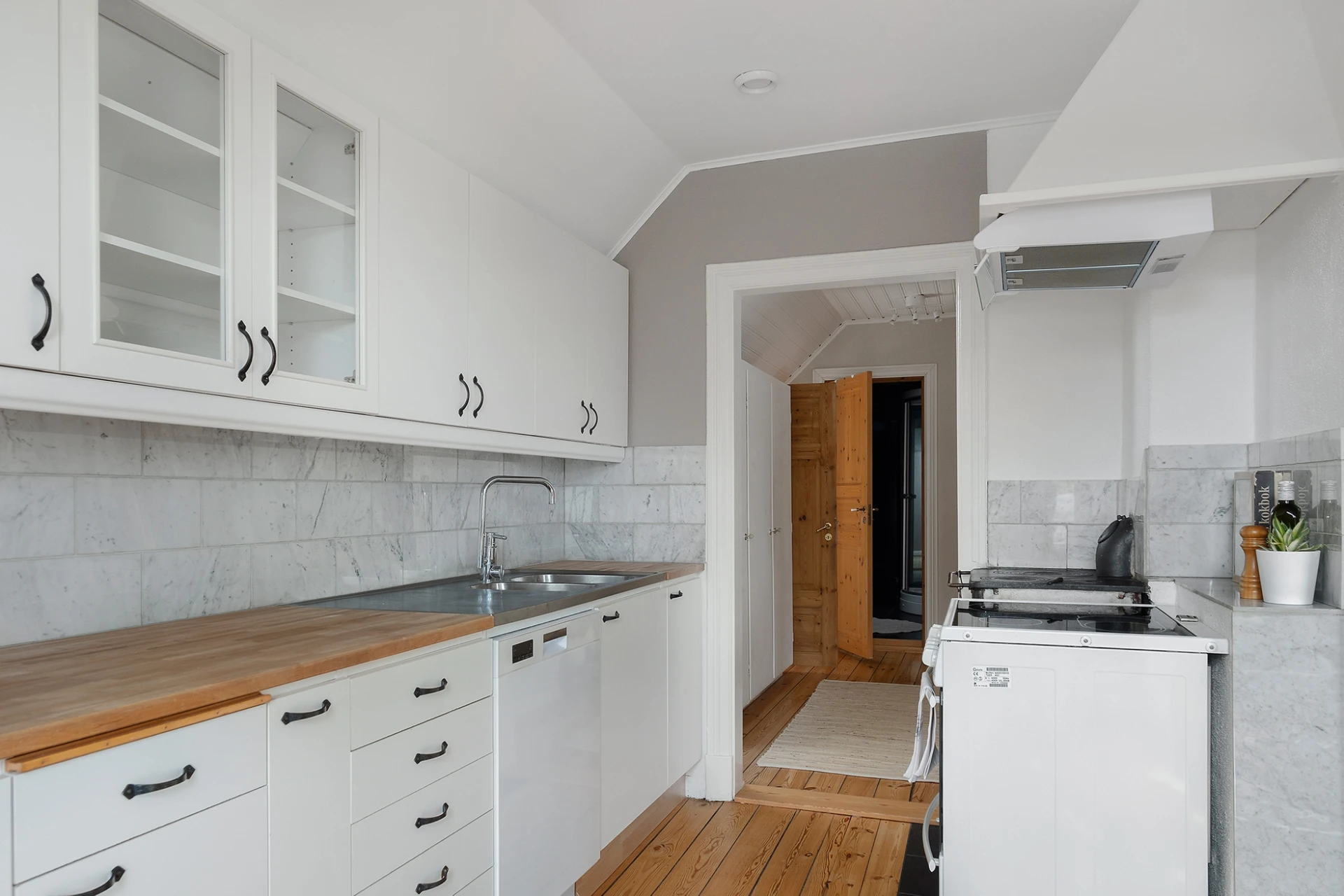 Golv: trägolv. Utrustning: spis/ugn, diskmaskin, kyl/frys, kakel och vedspis.