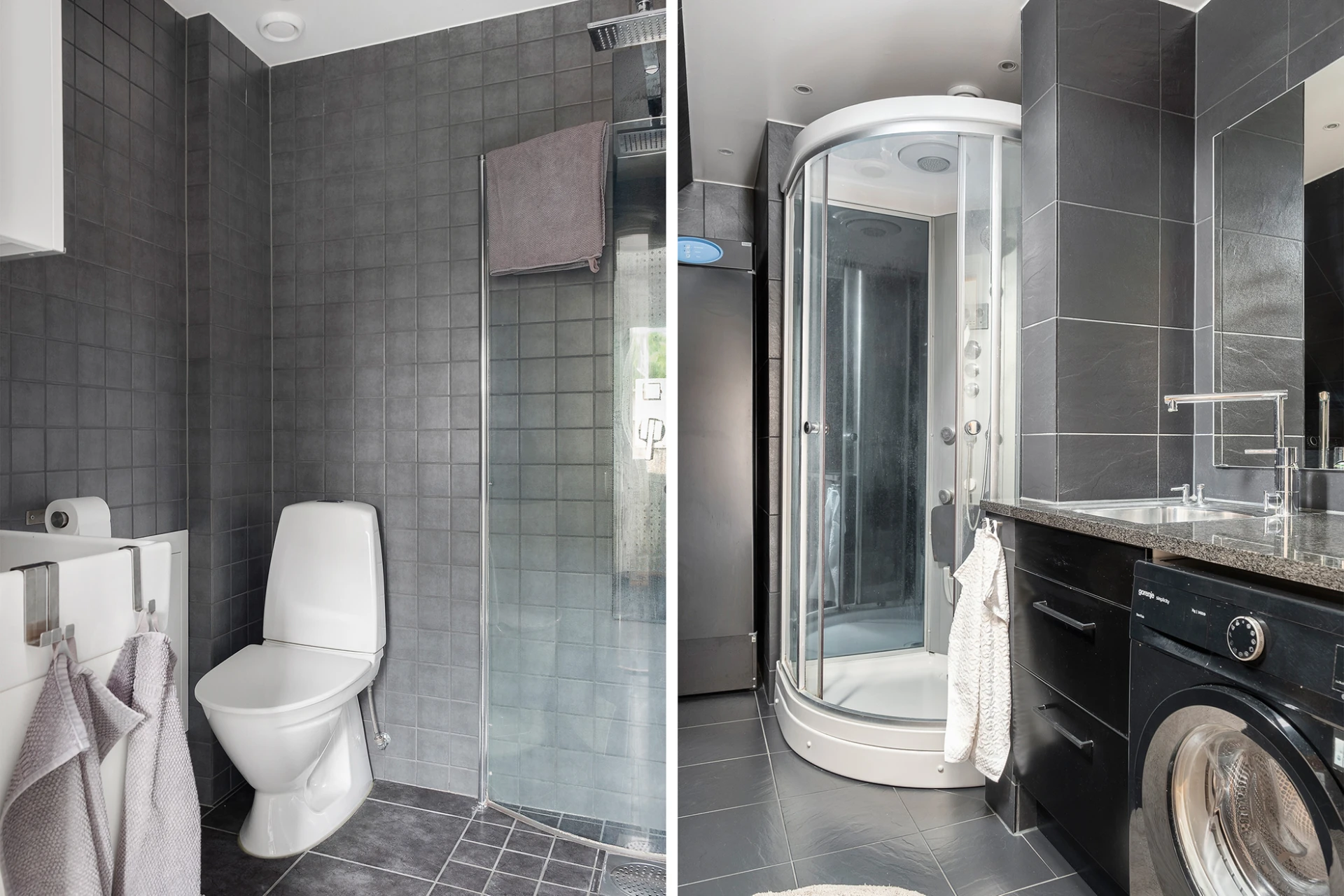 Golv: klinker. Väggar: kakel. Utrustning: vägghängd toalett, tvättställ, duschkabin, golvvärme, tvättmaskin, torktumlare, handdukstork, granitbänkskiva, spotlights.